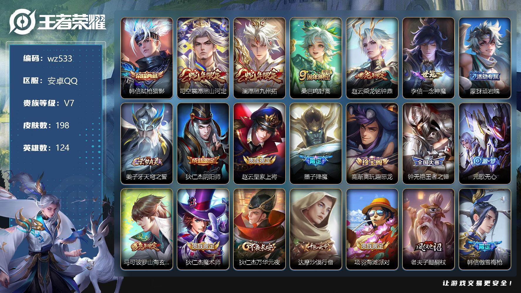 【游戏多多】 【可二次实名】【wz533】【商品标题】:安卓Q-V7-最强王者段位-124英雄-198皮肤-1典藏-0珍品无双-0无双-0珍品传说-5传说-53史诗 【荣耀典藏】:韩信弑枪猎影 【传说皮肤】:司空震愿照山河定,澜愿照九州拓,桑启鸣野蒿,赵云乘龙铭钟鼎,李信一念神魔 【限定皮肤】:蒙犽顽岩魄,姜子牙天穹之誓,狄仁杰阴阳师,赵云皇家上将,墨子降魔,高渐离玩趣恶龙,钟无艳王者之锤,元歌无心,马可波罗山海玄木吟,狄仁杰魔术师,狄仁杰万华元夜,达摩沙漠行僧,项羽海滩派对,老夫子醍醐杖,韩信傲雪梅枪,兰陵王金庭之子,李元芳云中旅人,钟馗驱傩正仪,鬼谷子原初探秘者,鬼谷子五谷丰年,苏烈千军破阵,百里玄策原初追逐者,沈梦溪大漠名商,沈梦溪匿光破解者,裴擒虎李小龙,裴擒虎擒涛扼浪,云中君纤云弄巧,上官婉儿梁祝,鲁班大师探海日志,桑启海盐诗旅,艾琳流音漫舞,司空震地狱燃心,阿古朵江河有灵,张良古海寻踪,鬼谷子天穹祈灯,伽罗琥珀纪元,姬小满妄想食味,赵云乘龙铭钟鼎,沈梦溪龙舞盛年,刘邦剑破天穹,周瑜熔金海岸 【年限皮肤】:马可波罗山海玄木吟,赵云乘龙铭钟鼎 【赛季限定】:狄仁杰万华元夜,达摩沙漠行僧,老夫子醍醐杖,兰陵王金庭之子,张良古海寻踪,李元芳云中旅人,钟馗驱傩正仪,鬼谷子原初探秘者,苏烈千军破阵,百里玄策原初追逐者,沈梦溪大漠名商,裴擒虎擒涛扼浪,鲁班大师探海日志,桑启海盐诗旅,鬼谷子天穹祈灯,刘邦剑破天穹,姜子牙天穹之誓 【战令限定】:艾琳流音漫舞,司空震地狱燃心 【史诗皮肤】:露娜紫霞仙子,阿轲暗夜猫娘,钟无艳王者之锤,赵云皇家上将,甄姬冰雪圆舞曲,王昭君偶像歌手,狄仁杰魔术师,宫本武藏鬼剑武藏,孙尚香水果甜心,嬴政摇滚巨星,妲己女仆咖啡,墨子金属风暴,曹操幽灵船长,花木兰水晶猎龙者,兰陵王暗隐猎兽者,诸葛亮黄金分割率,雅典娜冰冠公主,安琪拉心灵骇客,百里守约特工魅影,铠曙光守护者,刘禅天才门将,李元芳逐浪之夏,程咬金功夫厨神,白起星夜王子,阿轲节奏热浪,孙策猫狗日记,伽罗箭羽风息,狄仁杰鹰眼统帅,上官婉儿梁祝,娜可露露晚萤,不知火舞魅语,橘右京修罗,孙尚香时之恋人,百里玄策原初追逐者,裴擒虎李小龙,云中君纤云弄巧,韩信傲雪梅枪,澜赏金猎手,鬼谷子五谷丰年,元歌无心,墨子降魔,马可波罗山海玄木吟,沈梦溪匿光破解者,司空震地狱燃心,阿古朵江河有灵,伽罗琥珀纪元,姬小满妄想食味,蒙犽顽岩魄,艾琳陌上桑,牛魔星界战将,孙膑茶境仙,百里守约雪豹霜爪,黄忠百相守梦 【其他皮肤】:项羽海滩派对,韩信街头霸王,露娜哥特玫瑰,达摩大发明家,赵云白执事,赵云忍炎影,程咬金星际陆战队,白起白色死神,牛魔西部大镖客,武则天东方不败,扁鹊化身博士,扁鹊救世之瞳,孙膑天使之翼,妲己少女阿狸,典韦黄金武士,达摩拳王,花木兰兔女郎,甄姬花好人间,刘备万事如意,宫本武藏万象初新,后羿阿尔法小队,狄仁杰阴阳师,刘备汉昭烈帝,关羽龙腾万里,钟无艳海滩丽影,李白敏锐之力,苏烈坚韧之力,大乔守护之力,小乔丁香结,吕布野性能量,高渐离玩趣恶龙,沈梦溪鲨炮海盗猫,哪吒次元突破,老夫子醍醐杖,狂铁特工战影,鬼谷子原初探秘者,狄仁杰万华元夜,刘禅秘密基地,露娜瓷语鉴心,张良缤纷绘卷,钟馗驱傩正仪,鲁班大师乓乓大师,苏烈千军破阵,典韦铁甲之心,达摩沙漠行僧,程咬金无双福将,刘邦虎啸剑宗,兰陵王金庭之子,沈梦溪大漠名商,蒙恬蔚蓝守将,李元芳云中旅人,桑启海盐诗旅,海月幻泉雾影,猪八戒潮玩探月行,牛魔牛运亨通,白起乐园追猎者,赵怀真太极少年,裴擒虎擒涛扼浪,太乙真人劲辣红锅,莱西奥西部游侠,鲁班大师探海日志,李元芳妄想特派,艾琳流音漫舞,张良古海寻踪,钟无艳聚星闪耀,亚连破局者,后羿完美运算,鬼谷子天穹祈灯,海诺时空谍影,朵莉亚金色潮汐,廉颇功夫炙烤,亚瑟鸿运当头,沈梦溪龙舞盛年,钟无艳春野之旅,刘邦剑破天穹,姜子牙天穹之誓,周瑜熔金海岸,盘古敬我三分,东皇太一噬灭天穹,干将莫邪雾都夜雨,苍苍林狼骑,太乙真人谧流熔炉,典韦铁骨偃魂,马超访茗客,西施雪境奇遇,姜子牙星梦巡礼,达摩爆裂喵拳,明世隐景韶洛都,戈娅玫蓝誓约,钟馗虚灵犬护,苏烈春野闲踪,张良灵野札记,阿古朵布丁狗之约,雅典娜潮玩士官长,白起死霸装,云中君云械蓝图,莱西奥踏浪烽翎,鬼谷子克喵,鲁班七号木偶奇遇记,高渐离金属狂潮,貂蝉异域舞娘,老夫子潮流仙人,狄仁杰锦衣卫,曹操超能战警,后羿精灵王,刘禅英喵野望,李元芳特种部队,虞姬加勒比小姐,夏侯惇战争骑士,马可波罗激情绿茵,苍维京掠夺者,杨戬埃及法老,黄忠芝加哥教父,铠龙域领主,百里守约绝影神枪,百里玄策威尼斯狂欢,女娲尼罗河女神,明世隐占星师,裴擒虎街头旋风,弈星踏雪寻梅,米莱狄精准探案法,元歌午夜歌剧院,孙策海之征途,司马懿魇语军师,盾山极冰防御线,李信灼热之刃,上官婉儿修竹墨客,盘古创