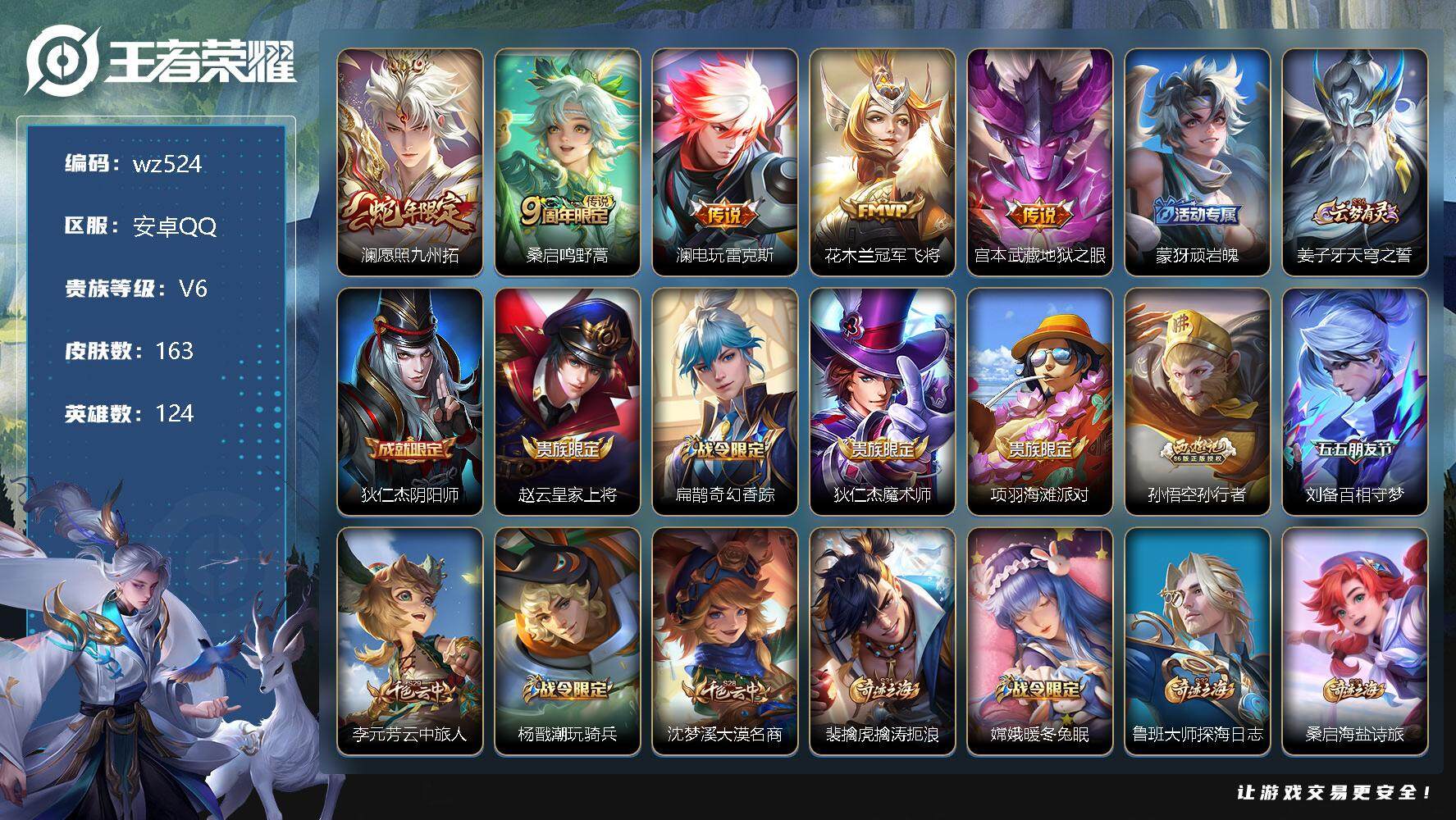 【游戏多多】 【可二次实名】【wz524】【商品标题】:安卓Q-V6-最强王者段位-124英雄-163皮肤-0典藏-0珍品无双-0无双-0珍品传说-5传说-51史诗 【传说皮肤】:澜愿照九州拓,桑启鸣野蒿,澜电玩雷克斯,花木兰冠军飞将,宫本武藏地狱之眼 【限定皮肤】:蒙犽顽岩魄,姜子牙天穹之誓,狄仁杰阴阳师,赵云皇家上将,扁鹊奇幻香踪,狄仁杰魔术师,项羽海滩派对,孙悟空孙行者,刘备百相守梦,李元芳云中旅人,杨戬潮玩骑兵,沈梦溪大漠名商,裴擒虎擒涛扼浪,嫦娥暖冬兔眠,鲁班大师探海日志,桑启海盐诗旅,暃星界游侠,艾琳女武神,阿古朵江河有灵,张良古海寻踪,鬼谷子天穹祈灯,沈梦溪龙舞盛年,刘邦剑破天穹,程咬金群星魔术团,镜青焰无极,项羽苍威无极,周瑜熔金海岸 【赛季限定】:张良古海寻踪,李元芳云中旅人,沈梦溪大漠名商,裴擒虎擒涛扼浪,鲁班大师探海日志,桑启海盐诗旅,鬼谷子天穹祈灯,刘邦剑破天穹,姜子牙天穹之誓 【战令限定】:扁鹊奇幻香踪,杨戬潮玩骑兵,嫦娥暖冬兔眠,暃星界游侠,镜青焰无极,项羽苍威无极 【史诗皮肤】:露娜紫霞仙子,赵云皇家上将,赵云未来纪元,貂蝉圣诞恋歌,甄姬冰雪圆舞曲,王昭君偶像歌手,狄仁杰魔术师,廉颇地狱岩魂,宫本武藏鬼剑武藏,孙尚香水果甜心,妲己魅力维加斯,妲己女仆咖啡,墨子金属风暴,吕布圣诞狂欢,曹操幽灵船长,李白千年之狐,花木兰水晶猎龙者,夏侯惇乘风破浪,兰陵王暗隐猎兽者,诸葛亮黄金分割率,雅典娜冰冠公主,百里守约特工魅影,铠曙光守护者,李元芳逐浪之夏,白起星夜王子,阿轲节奏热浪,孙策猫狗日记,伽罗箭羽风息,狄仁杰鹰眼统帅,孙悟空孙行者,澜赏金猎手,暃星界游侠,扁鹊奇幻香踪,刘备百相守梦,阿古朵江河有灵,镜青焰无极,黄忠怒海争锋,蒙犽顽岩魄,大司命东方月初,亚连破空之剑,马可波罗星界特工,百里守约百相守梦,孙膑茶境仙,阿轲化蝶舞,刘禅鸭鸭历险记,狂铁龙之律动,扁鹊灵蛊蚀心,后羿石田雨龙,周瑜百相守梦,黄忠百相守梦,西施织梦人 【其他皮肤】:项羽海滩派对,韩信教廷特使,韩信街头霸王,赵云忍炎影,艾琳女武神,白起白色死神,牛魔西部大镖客,孙膑天使之翼,姜子牙时尚教父,妲己少女阿狸,典韦黄金武士,亚瑟死亡骑士,花木兰兔女郎,甄姬花好人间,刘备万事如意,后羿阿尔法小队,狄仁杰阴阳师,关羽龙腾万里,钟无艳海滩丽影,王昭君幻想奇妙夜,老夫子功夫老勺,诸葛亮掌控之力,李白敏锐之力,鬼谷子幻乐之宴,明世隐虹云星官,小乔丁香结,吕布野性能量,哪吒次元突破,狂铁特工战影,刘禅秘密基地,鲁班大师乓乓大师,刘禅唤灵魔甲,米莱狄契约魔法,沈梦溪大漠名商,蒙犽胡桃狂想曲,蒙恬蔚蓝守将,李元芳云中旅人,桑启海盐诗旅,嫦娥暖冬兔眠,猪八戒潮玩探月行,牛魔牛运亨通,赵怀真太极少年,裴擒虎擒涛扼浪,杨戬潮玩骑兵,太乙真人劲辣红锅,鲁班大师探海日志,姬小满零食大作战,李元芳妄想特派,张良古海寻踪,钟无艳聚星闪耀,鬼谷子天穹祈灯,廉颇功夫炙烤,沈梦溪龙舞盛年,刘邦剑破天穹,程咬金群星魔术团,项羽苍威无极,姜子牙天穹之誓,周瑜熔金海岸,孙悟空神迹守卫,盘古敬我三分,东皇太一噬灭天穹,亚瑟动物派对,老夫子百相守梦,干将莫邪雾都夜雨,吕布逐霄战戟,苍苍林狼骑,太乙真人谧流熔炉,典韦铁骨偃魂,马超访茗客,西施雪境奇遇,少司缘灵卦秘语,明世隐景韶洛都,戈娅玫蓝誓约,刘备浪漫序章,钟馗虚灵犬护,沈梦溪鸭鸭历险记,苏烈春野闲踪,张良灵野札记,阿古朵布丁狗之约,露娜命运加冕,白起死霸装,甄姬逆浪荇歌,孙策百相守梦,庄周锦麟游梦,莱西奥踏浪烽翎,鬼谷子克喵,曹操超能战警,孙悟空西部大镖客,兰陵王隐刃,李元芳特种部队,马可波罗激情绿茵,杨戬埃及法老,鬼谷子阿摩司公爵,铠龙域领主,百里守约绝影神枪,百里玄策威尼斯狂欢,女娲尼罗河女神,元歌午夜歌剧院,司马懿魇语军师,伽罗花见巫女,李信灼热之刃,曜归虚梦演,蒙犽归虚梦演,澜孤猎,司空震启蛰,云缨赤焰之缨,暃碧珀绯影 【内测皮肤】:艾琳女武神,狂铁特工战影 【营地ID】:1755374289