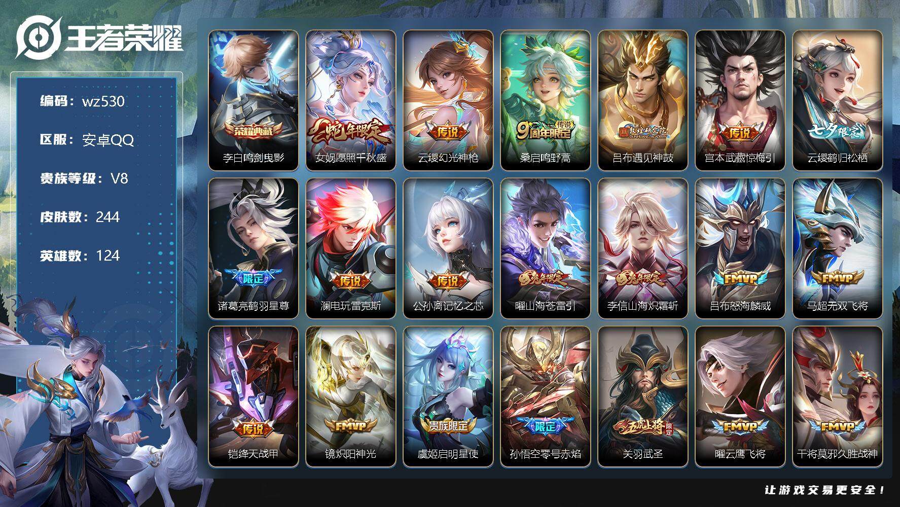 【游戏多多】 【可二次实名】【wz530】【商品标题】:安卓Q-V8-至尊星耀V段位-124英雄-244皮肤-1典藏-0珍品无双-0无双-0珍品传说-24传说-63史诗 【荣耀典藏】:李白鸣剑曳影 【传说皮肤】:女娲愿照千秋盛,云缨幻光神枪,桑启鸣野蒿,吕布遇见神鼓,宫本武藏惊梅引,云缨鹤归松栖,诸葛亮鹤羽星尊,澜电玩雷克斯,公孙离记忆之芯,曜山海苍雷引,李信山海炽霜斩,吕布怒海麟威,马超无双飞将,铠绛天战甲,镜炽阳神光,虞姬启明星使,孙悟空零号赤焰,关羽武圣,曜云鹰飞将,干将莫邪久胜战神,达摩黄金狮子座,百里玄策白虎志,宫本武藏地狱之眼,狄仁杰超时空战士 【限定皮肤】:姜子牙天穹之誓,杨戬破阵退雄兵,狄仁杰阴阳师,赵云皇家上将,赵云引擎之心,高渐离死亡摇滚,钟无艳超时空战士,吕布遇见神鼓,元歌无心,甄姬落雪兰心,马可波罗暗影游猎,狄仁杰魔术师,狄仁杰万华元夜,达摩星际陆战队,项羽海滩派对,老夫子醍醐杖,关羽武圣,关羽百相守梦,程咬金演武夺筹,刘邦夺宝奇兵,韩信飞衡,花木兰青春决赛季,花木兰默契交锋,亚瑟潮玩骑士王,孙悟空美猴王,孙悟空零号赤焰,孙悟空孙行者,李元芳银河之约,李元芳匿光侦查者,李元芳云中旅人,虞姬启明星使,钟馗驱傩正仪,杨戬潮玩骑兵,雅典娜黎明之约,鬼谷子原初探秘者,鬼谷子五谷丰年,诸葛亮鹤羽星尊,百里玄策白虎志,弈星混沌棋,沈梦溪星空之诺,明世隐疑决卦,裴擒虎李小龙,裴擒虎擒涛扼浪,云中君纤云弄巧,李信山海炽霜斩,猪八戒西部大镖客,上官婉儿梁祝,上官婉儿天狼绘梦者,上官婉儿神器万象笔,嫦娥拒霜思,嫦娥暖冬兔眠,曜山海苍雷引,西施玲珑珍味,鲁班大师探海日志,桑启海盐诗旅,暃星界游侠,戈娅驭风魔法,艾琳女武神,艾琳流音漫舞,赵怀真鹤归松栖,云缨鹤归松栖,司空震地狱燃心,阿古朵江河有灵,张良古海寻踪,蒙犽百解令,蒙恬荣光圣徽,鬼谷子天穹祈灯,刘邦剑破天穹,周瑜熔金海岸 【年限皮肤】:百里玄策白虎志,孙悟空美猴王,韩信飞衡,关羽武圣,李信山海炽霜斩,曜山海苍雷引 【赛季限定】:狄仁杰万华元夜,老夫子醍醐杖,程咬金演武夺筹,张良古海寻踪,李元芳云中旅人,钟馗驱傩正仪,雅典娜黎明之约,鬼谷子原初探秘者,弈星混沌棋,明世隐疑决卦,裴擒虎擒涛扼浪,鲁班大师探海日志,桑启海盐诗旅,鬼谷子天穹祈灯,蒙恬荣光圣徽,刘邦剑破天穹,姜子牙天穹之誓 【战令限定】:钟无艳超时空战士,甄姬落雪兰心,马可波罗暗影游猎,达摩星际陆战队,刘邦夺宝奇兵,艾琳流音漫舞,亚瑟潮玩骑士王,李元芳银河之约,杨戬潮玩骑兵,沈梦溪星空之诺,猪八戒西部大镖客,嫦娥暖冬兔眠,西施玲珑珍味,司空震地狱燃心,暃星界游侠,戈娅驭风魔法 【史诗皮肤】:赵云皇家上将,赵云未来纪元,貂蝉圣诞恋歌,甄姬冰雪圆舞曲,王昭君偶像歌手,狄仁杰魔术师,廉颇地狱岩魂,宫本武藏鬼剑武藏,孙尚香水果甜心,嬴政暗夜贵公子,嬴政摇滚巨星,妲己魅力维加斯,墨子龙骑士,墨子金属风暴,吕布圣诞狂欢,刘禅绅士熊喵,张飞乱世虎臣,赵云引擎之心,花木兰水晶猎龙者,夏侯惇乘风破浪,兰陵王暗隐猎兽者,诸葛亮黄金分割率,亚瑟心灵战警,雅典娜冰冠公主,安琪拉心灵骇客,花木兰青春决赛季,铠曙光守护者,李元芳逐浪之夏,程咬金功夫厨神,阿轲节奏热浪,孙策猫狗日记,狄仁杰鹰眼统帅,上官婉儿梁祝,李元芳银河之约,韩信飞衡,橘右京修罗,上官婉儿天狼绘梦者,马可波罗暗影游猎,裴擒虎李小龙,云中君纤云弄巧,花木兰默契交锋,百里玄策热力回旋,孙悟空孙行者,嫦娥拒霜思,雅典娜黎明之约,貂蝉唤灵魅影,钟无艳超时空战士,鬼谷子五谷丰年,上官婉儿神器万象笔,元歌无心,暃星界游侠,关羽百相守梦,刘禅电玩爆裂旋风,戈娅驭风魔法,赵怀真鹤归松栖,李元芳匿光侦查者,司空震地狱燃心,阿古朵江河有灵,蒙犽百解令,蒙恬荣光圣徽,百里守约百相守梦,阿轲化蝶舞,狂铁龙之律动 【其他皮肤】:项羽海滩派对,韩信教廷特使,韩信街头霸王,露娜哥特玫瑰,赵云白执事,赵云忍炎影,芈月红桃皇后,艾琳女武神,白起白色死神,牛魔西部大镖客,武则天东方不败,宫本武藏未来纪元,安琪拉玩偶对对碰,孙膑天使之翼,姜子牙时尚教父,妲己少女阿狸,典韦黄金武士,亚瑟死亡骑士,达摩拳王,孙悟空美猴王,花木兰兔女郎,甄姬花好人间,刘备万事如意,狄仁杰阴阳师,刘备纽约教父,高渐离死亡摇滚,刘备汉昭烈帝,钟无艳海滩丽影,宫本武藏霸王丸,王昭君幻想奇妙夜,狂铁命运角斗场,老夫子功夫老勺,李白敏锐之力,鬼谷子幻乐之宴,苏烈坚韧之力,大乔守护之力,明世隐虹云星官,小乔丁香结,吕布野性能量,沈梦溪鲨炮海盗猫,姜子牙炽热元素使,沈梦溪星空之诺,弈星混沌棋,哪吒次元突破,明世隐疑决卦,刘邦夺宝奇兵,老夫子醍醐杖,猪八戒西部大镖客,狂铁特工战影,鬼谷子原初探秘者,狄仁杰万华元夜,亚瑟潮玩骑士王,刘禅秘密基地,杨戬次元傲视,达摩星际陆战