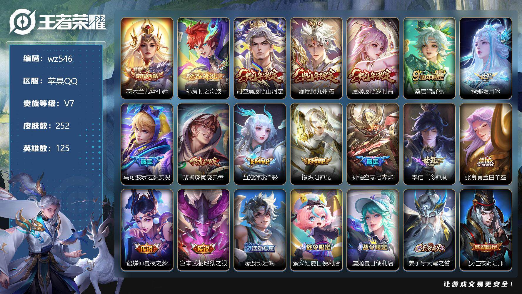 【游戏多多】 【可二次实名】【wz546】【商品标题】:苹果Q-V7-最强王者段位-125英雄-252皮肤-1典藏-0珍品无双-0无双-1珍品传说-14传说-80史诗 【荣耀典藏】:花木兰九霄神辉 【珍品传说】:孙策时之奇旅 【传说皮肤】:司空震愿照山河定,澜愿照九州拓,虞姬愿照岁时盈,桑启鸣野蒿,露娜霜月吟,马可波罗妄想实况,裴擒虎寅虎赤拳,西施游龙清影,镜炽阳神光,孙悟空零号赤焰,李信一念神魔,张良黄金白羊座,貂蝉仲夏夜之梦,宫本武藏地狱之眼 【限定皮肤】:蒙犽顽岩魄,蔡文姬夏日便利店,虞姬夏日便利店,姜子牙天穹之誓,狄仁杰阴阳师,赵云皇家上将,孙尚香蔷薇恋人,芈月白晶晶,吕布猎兽之王,吕布御风骁将,元歌无心,马可波罗妄想实况,狄仁杰魔术师,狄仁杰万华元夜,达摩沙漠行僧,项羽海滩派对,程咬金演武夺筹,韩信傲雪梅枪,兰陵王驯魔猎人,兰陵王金庭之子,孙悟空美猴王,孙悟空至尊宝,孙悟空大圣娶亲,孙悟空零号赤焰,孙悟空孙行者,李元芳云中旅人,钟馗驱傩正仪,干将莫邪胡桃夹子,雅典娜黎明之约,鬼谷子五谷丰年,苏烈千军破阵,百里玄策原初追逐者,百里守约朱雀志,梦奇顽趣,沈梦溪大漠名商,裴擒虎天狼狩猎者,裴擒虎李小龙,裴擒虎寅虎赤拳,裴擒虎擒涛扼浪,嫦娥拒霜思,鲁班大师探海日志,桑启海盐诗旅,司空震地狱燃心,阿古朵江河有灵,张良古海寻踪,蒙犽百解令,蒙恬荣光圣徽,高渐离燃音魔法,妲己灵卜魔法,鬼谷子天穹祈灯,沈梦溪龙舞盛年,鲁班七号蔬乡物语,李元芳蔬乡物语,刘邦剑破天穹,程咬金群星魔术团,镜青焰无极 【年限皮肤】:百里守约朱雀志,孙悟空美猴王,裴擒虎寅虎赤拳,吕布御风骁将,马超神威 【赛季限定】:狄仁杰万华元夜,达摩沙漠行僧,程咬金演武夺筹,兰陵王金庭之子,张良古海寻踪,李元芳云中旅人,钟馗驱傩正仪,雅典娜黎明之约,苏烈千军破阵,百里玄策原初追逐者,梦奇顽趣,沈梦溪大漠名商,裴擒虎擒涛扼浪,鲁班大师探海日志,桑启海盐诗旅,鬼谷子天穹祈灯,蒙恬荣光圣徽,刘邦剑破天穹,姜子牙天穹之誓 【战令限定】:蔡文姬夏日便利店,虞姬夏日便利店,吕布猎兽之王,兰陵王驯魔猎人,司空震地狱燃心,高渐离燃音魔法,妲己灵卜魔法,鲁班七号蔬乡物语,李元芳蔬乡物语,镜青焰无极 【史诗皮肤】:鲁班七号电玩小子,露娜紫霞仙子,赵云皇家上将,赵云未来纪元,甄姬冰雪圆舞曲,王昭君偶像歌手,狄仁杰魔术师,宫本武藏鬼剑武藏,孙尚香蔷薇恋人,孙尚香水果甜心,嬴政摇滚巨星,妲己魅力维加斯,妲己女仆咖啡,墨子龙骑士,墨子金属风暴,吕布圣诞狂欢,刘禅绅士熊喵,李白千年之狐,吕布末日机甲,孙悟空至尊宝,花木兰水晶猎龙者,夏侯惇乘风破浪,小乔缤纷独角兽,兰陵王暗隐猎兽者,安琪拉心灵骇客,百里守约特工魅影,铠曙光守护者,蔡文姬舞动绿茵,李元芳逐浪之夏,程咬金功夫厨神,白起星夜王子,阿轲节奏热浪,孙策猫狗日记,大乔猫狗日记,百里守约朱雀志,孙悟空大圣娶亲,伽罗箭羽风息,裴擒虎天狼狩猎者,狄仁杰鹰眼统帅,兰陵王驯魔猎人,娜可露露晚萤,橘右京修罗,马超神威,百里玄策原初追逐者,裴擒虎李小龙,芈月白晶晶,吕布御风骁将,沈梦溪月团寄思,钟馗乐园奇幻夜,孙悟空孙行者,嫦娥拒霜思,雅典娜黎明之约,韩信傲雪梅枪,鬼谷子五谷丰年,元歌无心,梦奇顽趣,刘禅电玩爆裂旋风,司空震地狱燃心,阿古朵江河有灵,蒙犽百解令,妲己灵卜魔法,高渐离燃音魔法,蒙恬荣光圣徽,鲁班七号蔬乡物语,镜青焰无极,蔡文姬夏日便利店,蒙犽顽岩魄,马可波罗星界特工,百里守约百相守梦,牛魔星界战将,孙膑茶境仙,白起苍鳞隐世,赵怀真器灵浮梦炉,亚连糖绘人间,阿轲化蝶舞,狂铁龙之律动,扁鹊灵蛊蚀心,周瑜百相守梦,黄忠百相守梦,西施织梦人,公孙离涂山容容 【其他皮肤】:项羽海滩派对,韩信教廷特使,韩信街头霸王,露娜哥特玫瑰,阿轲爱心护理,达摩大发明家,赵云忍炎影,芈月红桃皇后,白起白色死神,扁鹊化身博士,安琪拉玩偶对对碰,姜子牙时尚教父,典韦黄金武士,亚瑟死亡骑士,达摩拳王,孙悟空美猴王,花木兰兔女郎,张飞五福同心,甄姬花好人间,刘备万事如意,宫本武藏万象初新,后羿阿尔法小队,狄仁杰阴阳师,刘备纽约教父,刘备汉昭烈帝,关羽龙腾万里,钟无艳海滩丽影,老夫子功夫老勺,孙尚香沉稳之力,诸葛亮掌控之力,鬼谷子幻乐之宴,吕布猎兽之王,明世隐虹云星官,庄周奇妙博物学,小乔丁香结,吕布野性能量,孙膑归虚梦演,沈梦溪鲨炮海盗猫,姜子牙炽热元素使,哪吒次元突破,鲁班七号黑桃队长,盾山圆桌骑士,狂铁特工战影,狄仁杰万华元夜,刘禅秘密基地,露娜瓷语鉴心,程咬金演武夺筹,张良缤纷绘卷,钟馗驱傩正仪,鲁班大师乓乓大师,苏烈千军破阵,典韦铁甲之心,干将莫邪胡桃夹子,达摩沙漠行僧,程咬金无双福将,兰陵王金庭之子,刘禅唤灵魔甲,米莱狄契约魔法,沈梦溪大漠名商,蒙犽胡桃狂想曲,蒙恬蔚蓝守将,李元芳云中旅人,戈娅