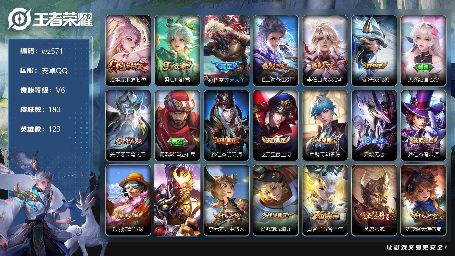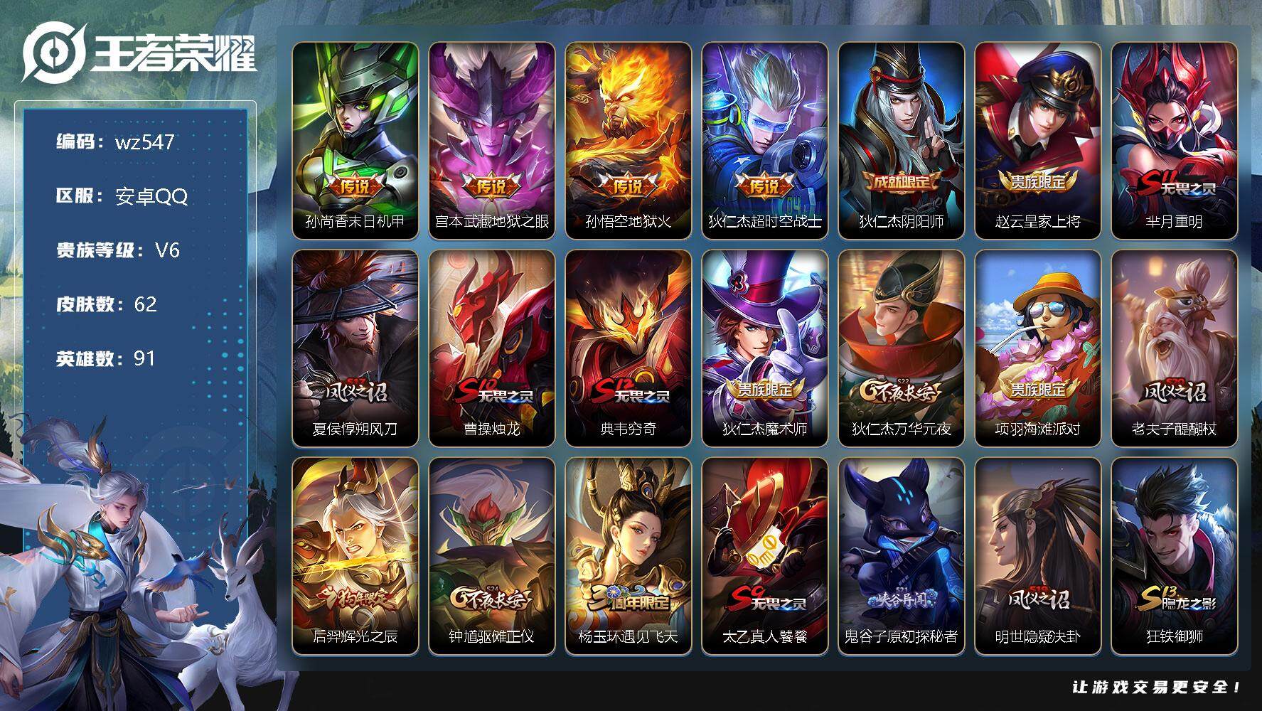 【游戏多多】 【可二次实名】【wz547】【商品标题】:安卓Q-V6-最强王者段位-91英雄-62皮肤-0典藏-0珍品无双-0无双-0珍品传说-4传说-8史诗 【传说皮肤】:孙尚香末日机甲,宫本武藏地狱之眼,孙悟空地狱火,狄仁杰超时空战士 【限定皮肤】:狄仁杰阴阳师,赵云皇家上将,芈月重明,夏侯惇朔风刀,曹操烛龙,典韦穷奇,狄仁杰魔术师,狄仁杰万华元夜,项羽海滩派对,老夫子醍醐杖,后羿辉光之辰,钟馗驱傩正仪,杨玉环遇见飞天,太乙真人饕餮,鬼谷子原初探秘者,明世隐疑决卦,狂铁御狮,米莱狄御霄,盾山御銮,鬼谷子天穹祈灯 【年限皮肤】:后羿辉光之辰 【赛季限定】:芈月重明,夏侯惇朔风刀,曹操烛龙,典韦穷奇,狄仁杰万华元夜,老夫子醍醐杖,钟馗驱傩正仪,太乙真人饕餮,鬼谷子原初探秘者,明世隐疑决卦,狂铁御狮,米莱狄御霄,盾山御銮,鬼谷子天穹祈灯 【史诗皮肤】:赵云皇家上将,狄仁杰魔术师,吕布圣诞狂欢,韩信白龙吟,兰陵王暗隐猎兽者,后羿辉光之辰,杨玉环遇见飞天,狄仁杰鹰眼统帅 【其他皮肤】:项羽海滩派对,韩信教廷特使,阿轲爱心护理,赵云白执事,赵云忍炎影,扁鹊化身博士,宫本武藏未来纪元,安琪拉玩偶对对碰,妲己少女阿狸,亚瑟死亡骑士,狄仁杰阴阳师,钟无艳海滩丽影,太乙真人饕餮,曹操烛龙,王昭君幻想奇妙夜,芈月重明,狂铁命运角斗场,老夫子功夫老勺,典韦穷奇,狂铁御狮,米莱狄御霄,盾山御銮,夏侯惇朔风刀,明世隐疑决卦,老夫子醍醐杖,鬼谷子原初探秘者,狄仁杰万华元夜,钟馗驱傩正仪,鲁班大师乓乓大师,海月王牌新星,鬼谷子天穹祈灯,太乙真人谧流熔炉,典韦铁骨偃魂,西施雪境奇遇,庄周锦麟游梦,高渐离落日弦歌,鲁班七号木偶奇遇记,狄仁杰锦衣卫,孙悟空西部大镖客,妲己仙境爱丽丝,夏侯惇战争骑士,干将莫邪第七人偶,铠龙域领主,百里守约绝影神枪,梦奇美梦成真,公孙离花间舞,裴擒虎街头旋风,元歌午夜歌剧院,伽罗花见巫女,李信灼热之刃 【营地ID】:54279416