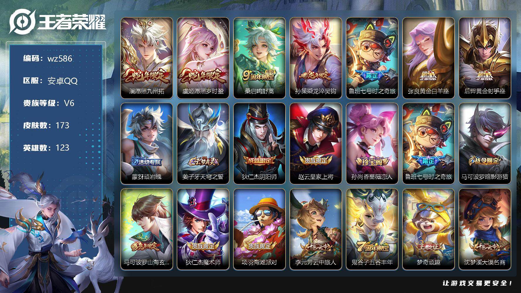 【游戏多多】 【可二次实名】【wz586】【商品标题】:安卓Q-V6-最强王者段位-123英雄-173皮肤-0典藏-0珍品无双-0无双-0珍品传说-7传说-51史诗 【传说皮肤】:澜愿照九州拓,虞姬愿照岁时盈,桑启鸣野蒿,孙策乘龙淬吴钩,鲁班七号时之奇旅,张良黄金白羊座,后羿黄金射手座 【限定皮肤】:蒙犽顽岩魄,姜子牙天穹之誓,狄仁杰阴阳师,赵云皇家上将,孙尚香蔷薇恋人,鲁班七号时之奇旅,马可波罗暗影游猎,马可波罗山海玄木吟,狄仁杰魔术师,项羽海滩派对,李元芳云中旅人,鬼谷子五谷丰年,梦奇顽趣,沈梦溪大漠名商,裴擒虎擒涛扼浪,上官婉儿梁祝,鲁班大师探海日志,桑启海盐诗旅,阿古朵江河有灵,张良古海寻踪,蒙犽百解令,蒙恬荣光圣徽,鬼谷子天穹祈灯,孙策乘龙淬吴钩,沈梦溪龙舞盛年,刘邦剑破天穹,程咬金群星魔术团,周瑜熔金海岸 【年限皮肤】:马可波罗山海玄木吟,孙策乘龙淬吴钩 【赛季限定】:张良古海寻踪,李元芳云中旅人,梦奇顽趣,沈梦溪大漠名商,裴擒虎擒涛扼浪,鲁班大师探海日志,桑启海盐诗旅,鬼谷子天穹祈灯,蒙恬荣光圣徽,刘邦剑破天穹,姜子牙天穹之誓 【战令限定】:马可波罗暗影游猎 【史诗皮肤】:赵云皇家上将,赵云未来纪元,貂蝉圣诞恋歌,甄姬冰雪圆舞曲,狄仁杰魔术师,宫本武藏鬼剑武藏,孙尚香蔷薇恋人,孙尚香水果甜心,嬴政暗夜贵公子,嬴政摇滚巨星,妲己魅力维加斯,墨子金属风暴,刘禅绅士熊喵,曹操幽灵船长,李白千年之狐,吕布末日机甲,刘邦德古拉伯爵,夏侯惇乘风破浪,小乔缤纷独角兽,兰陵王暗隐猎兽者,诸葛亮黄金分割率,亚瑟心灵战警,铠曙光守护者,李元芳逐浪之夏,程咬金功夫厨神,白起星夜王子,孙策猫狗日记,伽罗箭羽风息,狄仁杰鹰眼统帅,上官婉儿梁祝,马可波罗暗影游猎,西施诗语江南,司马懿暗渊魔法,鬼谷子五谷丰年,梦奇顽趣,马可波罗山海玄木吟,刘禅电玩爆裂旋风,莱西奥末日机甲,阿古朵江河有灵,蒙犽百解令,蒙恬荣光圣徽,黄忠怒海争锋,蒙犽顽岩魄,亚连破空之剑,马可波罗星界特工,牛魔星界战将,孙膑茶境仙,弈星万物之道,狂铁龙之律动,黄忠百相守梦,公孙离涂山容容 【其他皮肤】:项羽海滩派对,韩信教廷特使,韩信街头霸王,露娜哥特玫瑰,赵云白执事,赵云忍炎影,芈月红桃皇后,程咬金星际陆战队,白起白色死神,扁鹊救世之瞳,宫本武藏未来纪元,安琪拉玩偶对对碰,妲己少女阿狸,典韦黄金武士,亚瑟死亡骑士,达摩拳王,张飞五福同心,甄姬花好人间,刘备万事如意,后羿阿尔法小队,狄仁杰阴阳师,刘备汉昭烈帝,关羽龙腾万里,钟无艳海滩丽影,老夫子功夫老勺,诸葛亮掌控之力,李白敏锐之力,鬼谷子幻乐之宴,苏烈坚韧之力,明世隐虹云星官,沈梦溪鲨炮海盗猫,姜子牙炽热元素使,哪吒次元突破,狂铁特工战影,刘禅秘密基地,鲁班大师乓乓大师,程咬金无双福将,米莱狄契约魔法,沈梦溪大漠名商,蒙犽胡桃狂想曲,蒙恬蔚蓝守将,李元芳云中旅人,桑启海盐诗旅,猪八戒潮玩探月行,裴擒虎擒涛扼浪,太乙真人劲辣红锅,莱西奥西部游侠,鲁班大师探海日志,李元芳妄想特派,哪吒热血海滩,张良古海寻踪,后羿完美运算,鬼谷子天穹祈灯,嫦娥漠中幻影,廉颇功夫炙烤,沈梦溪龙舞盛年,钟无艳春野之旅,扁鹊无尽旅途,刘邦剑破天穹,盘古经纬探寻者,程咬金群星魔术团,姜子牙天穹之誓,周瑜熔金海岸,孙悟空神迹守卫,盘古敬我三分,东皇太一噬灭天穹,干将莫邪雾都夜雨,吕布逐霄战戟,苍苍林狼骑,太乙真人谧流熔炉,典韦铁骨偃魂,马超访茗客,西施雪境奇遇,姜子牙星梦巡礼,达摩爆裂喵拳,明世隐景韶洛都,戈娅玫蓝誓约,刘备浪漫序章,钟馗虚灵犬护,苏烈春野闲踪,张良灵野札记,阿古朵布丁狗之约,露娜命运加冕,姬小满小满鸭,白起死霸装,甄姬逆浪荇歌,庄周锦麟游梦,莱西奥踏浪烽翎,鬼谷子克喵,哪吒罗小黑战记,鲁班七号福禄兄弟,项羽帝国元帅,貂蝉异域舞娘,狄仁杰锦衣卫,孙悟空西部大镖客,李白范海辛,钟馗地府判官,虞姬加勒比小姐,夏侯惇战争骑士,雅典娜战争女神,马可波罗激情绿茵,苍维京掠夺者,黄忠芝加哥教父,百里守约绝影神枪,公孙离花间舞,弈星踏雪寻梅,米莱狄精准探案法,曜归虚梦演,镜冰刃幻境,蒙恬秩序猎龙将,澜孤猎,司空震启蛰,云缨赤焰之缨,金蝉前尘,暃碧珀绯影 【内测皮肤】:孙尚香蔷薇恋人,狂铁特工战影 【营地ID】:1772023742