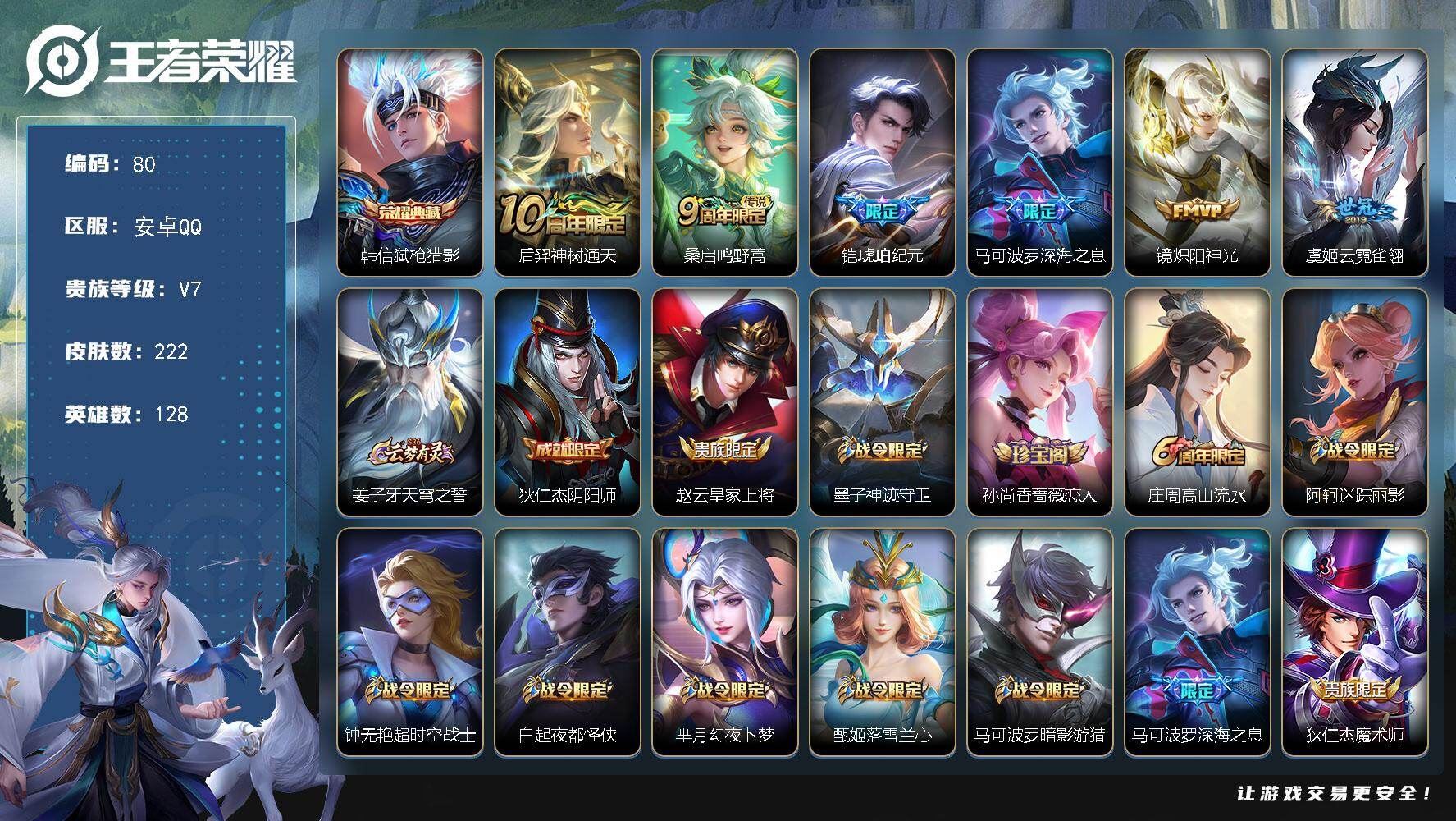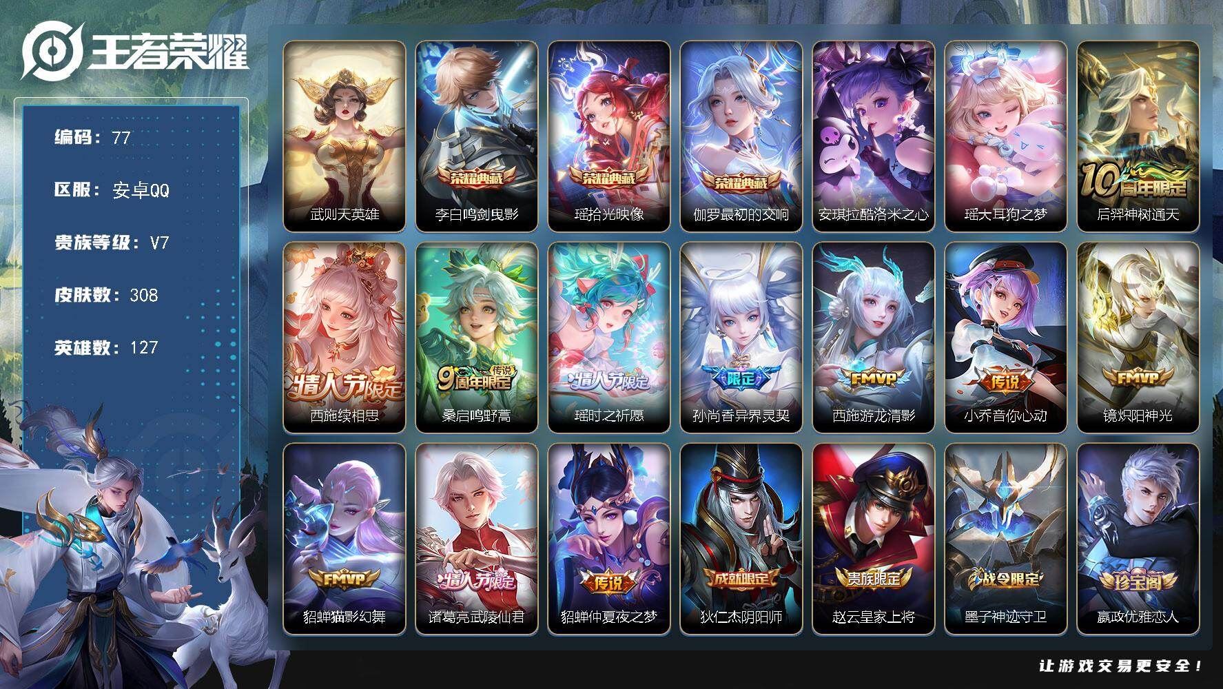 【游戏多多】 【可二次实名】可二次安卓Q【营地:2117286799】-V7-至尊星耀V段位-127英雄-308皮肤-3典藏皮肤-1典藏英雄-2珍品传说-11传说-109史诗【万战元流】【英雄全皮】:刘禅全皮,空空儿全皮,少司缘全皮【荣耀典藏】:武则天英雄,李白鸣剑曳影,瑶拾光映像,伽罗最初的交响【珍品传说】:安琪拉酷洛米之心,瑶大耳狗之梦【传说皮肤】:后羿神树通天,西施续相思,桑启鸣野蒿,瑶时之祈愿,孙尚香异界灵契,西施游龙清影,小乔音你心动,镜炽阳神光,貂蝉猫影幻舞,诸葛亮武陵仙君,貂蝉仲夏夜之梦【限定皮肤】:狄仁杰阴阳师,赵云皇家上将,墨子神迹守卫,嬴政优雅恋人,孙尚香蔷薇恋人,孙尚香异界灵契,庄周高山流水,钟无艳王者之锤,钟无艳超时空战士,孙膑天狼运算者,扁鹊奇幻香踪,白起夜都怪侠,芈月白晶晶,芈月幻夜卜梦,元歌云间偶戏,元歌无心,甄姬女儿国国王,甄姬落雪兰心,狄仁杰魔术师,狄仁杰万华元夜,达摩星际陆战队,达摩沙漠行僧,项羽海滩派对,老夫子醍醐杖,老夫子航海奇遇记,程咬金演武夺筹,露娜一生所爱,王昭君凤凰于飞,兰陵王金庭之子,亚瑟潮玩骑士王,后羿圣弓游侠,李元芳云中旅人,虞姬霸王别姬,钟馗驱傩正仪,杨玉环遇见飞天,杨玉环寅虎心曲,杨戬潮玩骑兵,干将莫邪冰霜恋舞曲,干将莫邪真爱魔法,雅典娜单词大作战,雅典娜黎明之约,蔡文姬繁星吟游,鬼谷子原初探秘者,鬼谷子五谷丰年,诸葛亮武陵仙君,大乔白鹤梁神女,黄忠火炮绅士,苏烈千军破阵,百里玄策原初追逐者,百里守约朱雀志,弈星混沌棋,梦奇顽趣,公孙离蜜橘之夏,公孙离玉兔公主,沈梦溪大漠名商,沈梦溪匿光破解者,明世隐疑决卦,明世隐吟游魔法,裴擒虎李小龙,裴擒虎擒涛扼浪,米莱狄胡桃异想国,瑶时之祈愿,瑶山海碧波行,云中君纤云弄巧,伽罗天狼溯光者,盾山御銮,上官婉儿梁祝,上官婉儿天狼绘梦者,嫦娥如梦令,嫦娥拒霜思,嫦娥暖冬兔眠,西施玲珑珍味,西施至美乘鲤谣,蒙犽狂想玩偶喵,鲁班大师探海日志,镜匿光追影者,桑启海盐诗旅,暃星界游侠,艾琳女武神,阿古朵江河有灵,张良古海寻踪,蒙犽百解令,蒙恬荣光圣徽,高渐离燃音魔法,妲己灵卜魔法,鬼谷子天穹祈灯,鲁班七号蔬乡物语,刘邦剑破天穹,程咬金群星魔术团【年限皮肤】:王昭君凤凰于飞,百里守约朱雀志,杨玉环寅虎心曲,瑶山海碧波行,各种道具详情看截图、低价出售找回包 赔、截图展示段位不代 表实际段位,如赛季更新等不可抗拒因素发生变化、时限道具不保证所剩时间、标题未写送点劵默认不送【卖号买号首选亿梦】