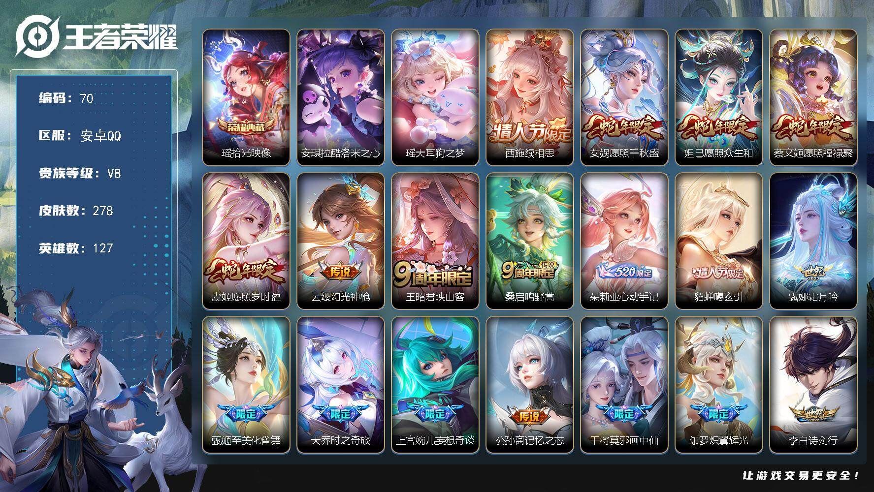 【游戏多多】 【可二次实名】可二次安卓Q【营地:1750693739】-V8-最强王者段位-127英雄-278皮肤-1典藏皮肤-2珍品传说-26传说-90史诗【英雄全皮】:孙权全皮,西施全皮,阿古朵全皮,空空儿全皮,影全皮,海诺全皮,少司缘全皮【荣耀典藏】:瑶拾光映像【珍品传说】:安琪拉酷洛米之心,瑶大耳狗之梦【传说皮肤】:西施续相思,女娲愿照千秋盛,妲己愿照众生和,蔡文姬愿照福禄聚,虞姬愿照岁时盈,云缨幻光神枪,王昭君映山客,桑启鸣野蒿,朵莉亚心动手记,貂蝉曦玄引,露娜霜月吟,甄姬至美化雀舞,大乔时之奇旅,上官婉儿妄想奇谈,公孙离记忆之芯,干将莫邪画中仙,伽罗炽翼辉光,李白诗剑行,百里守约碎云,西施游龙清影,小乔音你心动,镜炽阳神光,虞姬启明星使,干将莫邪久胜战神,虞姬云霓雀翎,貂蝉仲夏夜之梦【限定皮肤】:蒙犽顽岩魄,蔡文姬夏日便利店,大乔绒语心约,虞姬夏日便利店,姜子牙天穹之誓,狄仁杰阴阳师,赵云皇家上将,妲己时之彼端,孙尚香蔷薇恋人,芈月白晶晶,元歌云间偶戏,甄姬至美化雀舞,狄仁杰魔术师,达摩沙漠行僧,项羽海滩派对,安琪拉魔法小厨娘,程咬金演武夺筹,李元芳云中旅人,虞姬启明星使,钟馗驱傩正仪,杨玉环遇见飞天,杨玉环寅虎心曲,女娲朔望之晖,干将莫邪画中仙,太乙真人华丽摇滚,大乔时之奇旅,百里玄策原初追逐者,沈梦溪大漠名商,裴擒虎擒涛扼浪,瑶山海碧波行,云中君纤云弄巧,伽罗炽翼辉光,上官婉儿妄想奇谈,嫦娥拒霜思,嫦娥暖冬兔眠,西施玲珑珍味,西施至美乘鲤谣,鲁班大师探海日志,桑启海盐诗旅,艾琳流音漫舞,阿古朵江河有灵,张良古海寻踪,蒙犽百解令,高渐离燃音魔法,妲己灵卜魔法,鬼谷子天穹祈灯,大乔乘龙忆丹青,貂蝉曦玄引,沈梦溪龙舞盛年,鲁班七号蔬乡物语,李元芳蔬乡物语,刘邦剑破天穹,上官婉儿群星魔术团,镜青焰无极,项羽苍威无极,朵莉亚心动手记,海诺心动手记,芈月浮光幕影,周瑜熔金海岸【年限皮肤】:杨玉环寅虎心曲,瑶山海碧波行,大乔乘龙忆丹青,女娲愿照千秋盛,妲己愿照众生和,蔡文姬愿照福禄聚,虞姬愿照岁时盈,各种道具详情看截图、低价出售找回包 赔、截图展示段位不代 表实际段位,如赛季更新等不可抗拒因素发生变化、时限道具不保证所剩时间、标题未写送点劵默认不送【卖号买号首选亿梦】