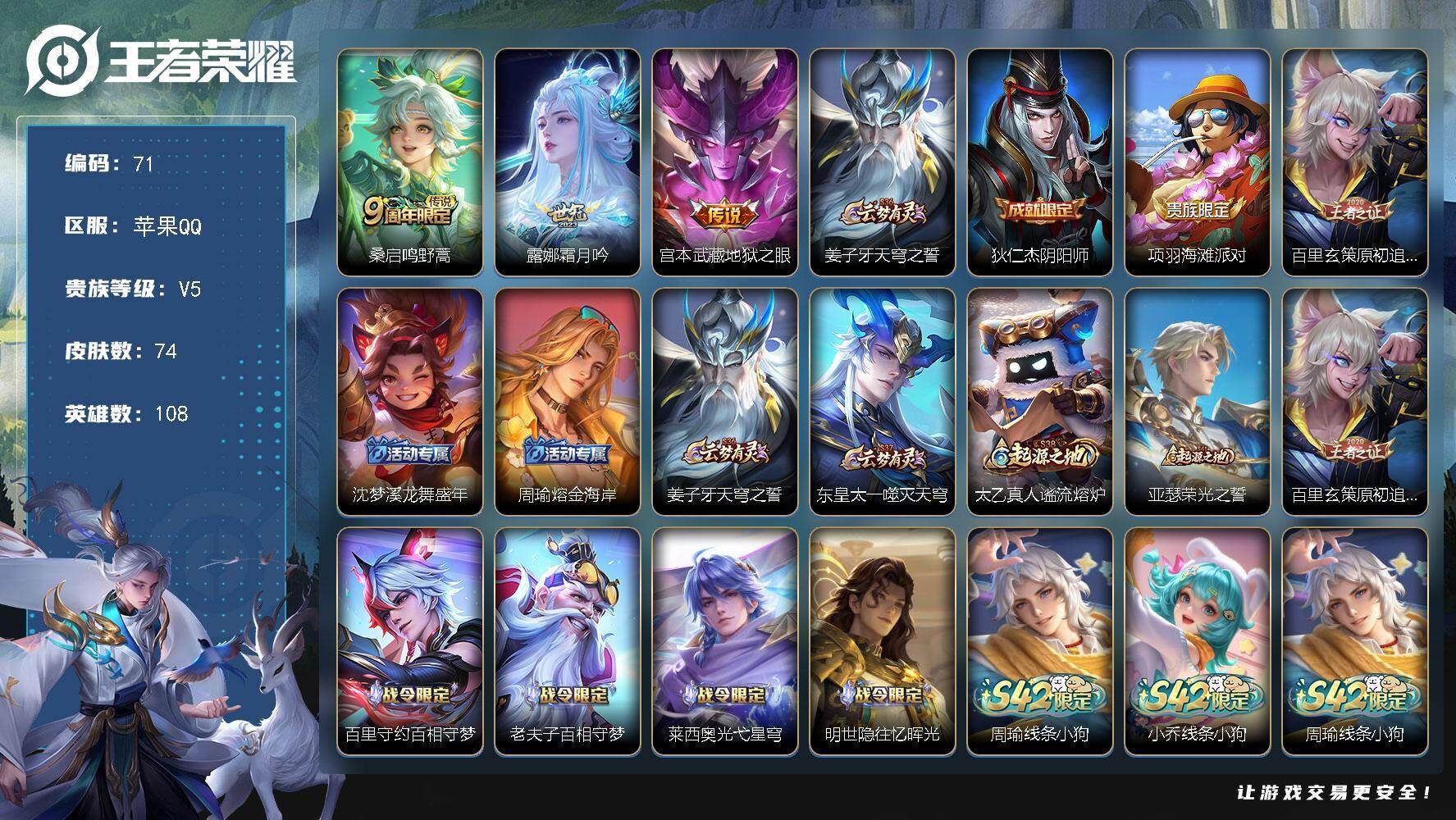 【游戏多多】 【可二次实名】可二次苹果Q【营地:1601746690】-V5-至尊星耀V段位-108英雄-74皮肤-3传说-23史诗【英雄全皮】:敖隐全皮【传说皮肤】:桑启鸣野蒿,露娜霜月吟,宫本武藏地狱之眼【限定皮肤】:姜子牙天穹之誓,狄仁杰阴阳师,项羽海滩派对,百里玄策原初追逐者,沈梦溪龙舞盛年,周瑜熔金海岸【赛季限定】:姜子牙天穹之誓,东皇太一噬灭天穹,太乙真人谧流熔炉,亚瑟荣光之誓,百里玄策原初追逐者【战令限定】:百里守约百相守梦,老夫子百相守梦,莱西奥光弋星穹,明世隐往忆晖光,周瑜线条小狗,小乔线条小狗【史诗皮肤】:周瑜线条小狗,小乔线条小狗,莱西奥光弋星穹,狂铁龙之律动,赵怀真器灵浮梦炉,百里守约百相守梦,百里玄策原初追逐者,娜可露露晚萤,狄仁杰鹰眼统帅,孙策猫狗日记,白起星夜王子,李元芳逐浪之夏,安琪拉心灵骇客,雅典娜冰冠公主,小乔缤纷独角兽,夏侯惇乘风破浪,曹操幽灵船长,吕布圣诞狂欢,嬴政摇滚巨星,孙尚香水果甜心,廉颇地狱岩魂,貂蝉圣诞恋歌,赵云未来纪元,露娜紫霞仙子,各种道具详情看截图、低价出售找回包 赔、截图展示段位不代 表实际段位,如赛季更新等不可抗拒因素发生变化、时限道具不保证所剩时间、标题未写送点劵默认不送【卖号买号首选亿梦】