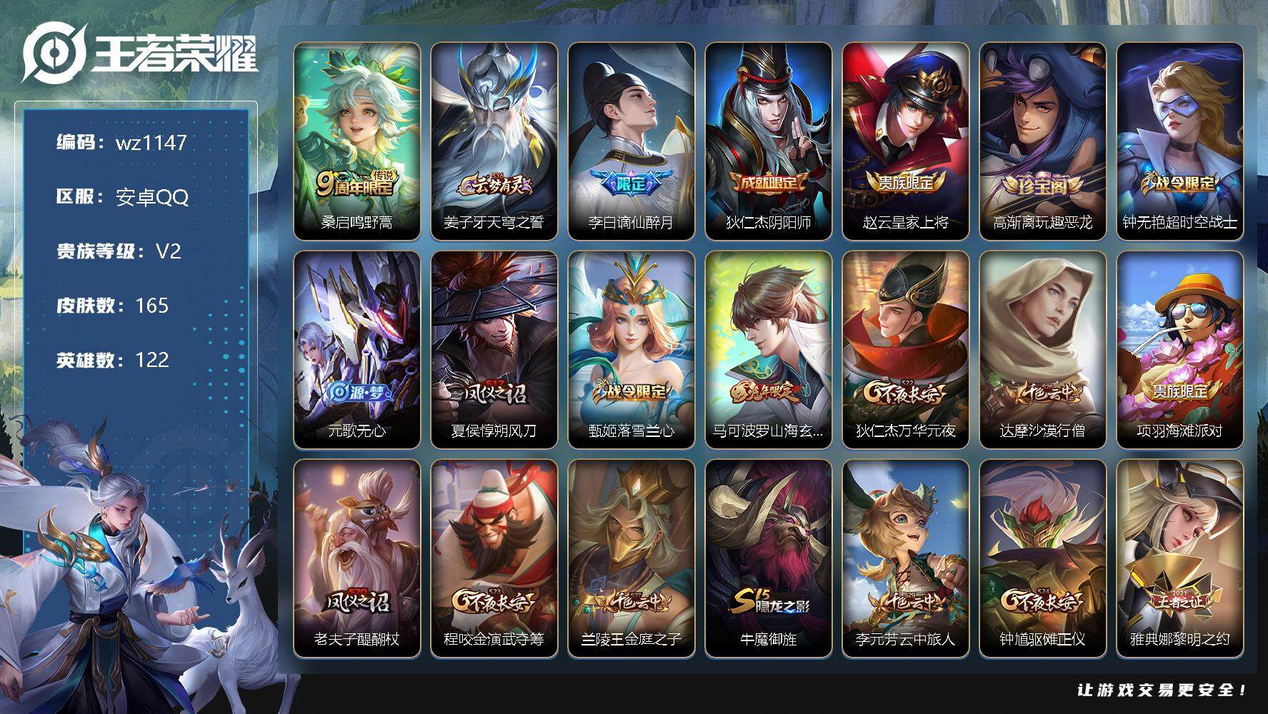 【游戏多多】 【可二次实名】【wz1147】【商品标题】:安卓Q-V2-永恒钻石II段位-122英雄-165皮肤-0典藏-0珍品无双-0无双-0珍品传说-1传说-40史诗 【传说皮肤】:桑启鸣野蒿 【限定皮肤】:姜子牙天穹之誓,李白谪仙醉月,狄仁杰阴阳师,赵云皇家上将,高渐离玩趣恶龙,钟无艳超时空战士,元歌无心,夏侯惇朔风刀,甄姬落雪兰心,马可波罗山海玄木吟,狄仁杰万华元夜,达摩沙漠行僧,项羽海滩派对,老夫子醍醐杖,程咬金演武夺筹,兰陵王金庭之子,牛魔御旌,李元芳云中旅人,钟馗驱傩正仪,雅典娜黎明之约,鬼谷子原初探秘者,鬼谷子五谷丰年,苏烈千军破阵,弈星混沌棋,梦奇顽趣,沈梦溪大漠名商,明世隐疑决卦,裴擒虎擒涛扼浪,盾山御銮,上官婉儿梁祝,鲁班大师探海日志,桑启海盐诗旅,阿古朵江河有灵,张良古海寻踪,蒙恬荣光圣徽,鬼谷子天穹祈灯,姬小满妄想食味,沈梦溪龙舞盛年,刘邦剑破天穹,周瑜熔金海岸 【年限皮肤】:马可波罗山海玄木吟 【赛季限定】:夏侯惇朔风刀,狄仁杰万华元夜,达摩沙漠行僧,老夫子醍醐杖,程咬金演武夺筹,兰陵王金庭之子,张良古海寻踪,牛魔御旌,李元芳云中旅人,钟馗驱傩正仪,雅典娜黎明之约,鬼谷子原初探秘者,苏烈千军破阵,弈星混沌棋,梦奇顽趣,沈梦溪大漠名商,明世隐疑决卦,裴擒虎擒涛扼浪,盾山御銮,鲁班大师探海日志,桑启海盐诗旅,鬼谷子天穹祈灯,蒙恬荣光圣徽,刘邦剑破天穹,姜子牙天穹之誓 【战令限定】:钟无艳超时空战士,甄姬落雪兰心 【史诗皮肤】:赵云皇家上将,赵云未来纪元,貂蝉圣诞恋歌,甄姬冰雪圆舞曲,廉颇地狱岩魂,宫本武藏鬼剑武藏,孙尚香水果甜心,嬴政摇滚巨星,妲己魅力维加斯,妲己女仆咖啡,墨子金属风暴,刘禅绅士熊喵,吕布末日机甲,花木兰水晶猎龙者,小乔缤纷独角兽,兰陵王暗隐猎兽者,亚瑟心灵战警,雅典娜冰冠公主,百里守约特工魅影,铠曙光守护者,刘禅天才门将,白起星夜王子,阿轲节奏热浪,大乔猫狗日记,狄仁杰鹰眼统帅,上官婉儿梁祝,娜可露露晚萤,雅典娜黎明之约,钟无艳超时空战士,鬼谷子五谷丰年,元歌无心,梦奇顽趣,马可波罗山海玄木吟,刘禅电玩爆裂旋风,阿古朵江河有灵,蒙恬荣光圣徽,姬小满妄想食味,李白谪仙醉月,牛魔星界战将,阿轲化蝶舞 【其他皮肤】:项羽海滩派对,韩信教廷特使,韩信街头霸王,露娜哥特玫瑰,赵云白执事,赵云忍炎影,白起白色死神,扁鹊化身博士,宫本武藏未来纪元,安琪拉玩偶对对碰,妲己少女阿狸,典韦黄金武士,亚瑟死亡骑士,达摩拳王,花木兰兔女郎,甄姬花好人间,后羿阿尔法小队,狄仁杰阴阳师,刘备纽约教父,关羽龙腾万里,钟无艳海滩丽影,老夫子功夫老勺,孙尚香沉稳之力,诸葛亮掌控之力,李白敏锐之力,鬼谷子幻乐之宴,苏烈坚韧之力,大乔守护之力,明世隐虹云星官,牛魔御旌,吕布野性能量,盾山御銮,孙膑归虚梦演,高渐离玩趣恶龙,沈梦溪鲨炮海盗猫,姜子牙炽热元素使,夏侯惇朔风刀,弈星混沌棋,哪吒次元突破,鲁班七号黑桃队长,明世隐疑决卦,盾山圆桌骑士,老夫子醍醐杖,狂铁特工战影,鬼谷子原初探秘者,狄仁杰万华元夜,刘禅秘密基地,程咬金演武夺筹,张良缤纷绘卷,钟馗驱傩正仪,鲁班大师乓乓大师,苏烈千军破阵,达摩沙漠行僧,程咬金无双福将,兰陵王金庭之子,刘禅唤灵魔甲,沈梦溪大漠名商,蒙恬蔚蓝守将,甄姬落雪兰心,李元芳云中旅人,戈娅危途狂花,桑启海盐诗旅,猪八戒潮玩探月行,牛魔牛运亨通,裴擒虎擒涛扼浪,太乙真人劲辣红锅,鲁班大师探海日志,姬小满零食大作战,李元芳妄想特派,张良古海寻踪,钟无艳聚星闪耀,后羿完美运算,鬼谷子天穹祈灯,廉颇功夫炙烤,沈梦溪龙舞盛年,刘邦剑破天穹,姜子牙天穹之誓,周瑜熔金海岸,盘古敬我三分,东皇太一噬灭天穹,亚瑟动物派对,干将莫邪雾都夜雨,苍苍林狼骑,太乙真人谧流熔炉,典韦铁骨偃魂,姜子牙星梦巡礼,明世隐景韶洛都,戈娅玫蓝誓约,刘备浪漫序章,钟馗虚灵犬护,苏烈春野闲踪,张良灵野札记,鲁班七号福禄兄弟,高渐离金属狂潮,露娜绯红之刃,花木兰剑舞者,老夫子潮流仙人,曹操超能战警,张良一千零一夜,孙悟空西部大镖客,后羿精灵王,关羽天启骑士,雅典娜战争女神,马可波罗激情绿茵,哪吒三太子,黄忠芝加哥教父,鬼谷子阿摩司公爵,铠龙域领主,百里守约绝影神枪,女娲尼罗河女神,公孙离花间舞,弈星踏雪寻梅,司马懿魇语军师,李信灼热之刃,上官婉儿修竹墨客,曜归虚梦演,马超幸存者,蒙犽归虚梦演,蒙恬秩序猎龙将,澜孤猎,司空震启蛰,云缨赤焰之缨,金蝉前尘,暃碧珀绯影 【内测皮肤】:高渐离玩趣恶龙,狂铁特工战影 【营地ID】:482445381