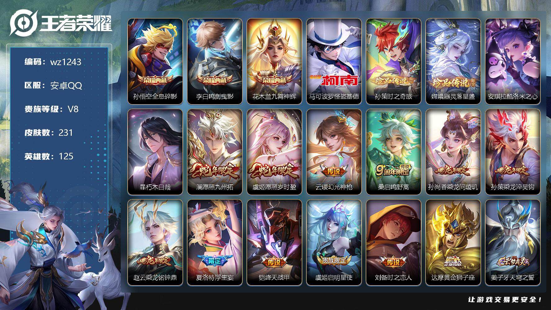 【游戏多多】 【可二次实名】【wz1243】【商品标题】:安卓Q-V8-永恒钻石I段位-125英雄-231皮肤-3典藏-0珍品无双-0无双-5珍品传说-12传说-89史诗 【荣耀典藏】:孙悟空全息碎影,李白鸣剑曳影,花木兰九霄神辉 【珍品传说】:马可波罗怪盗基德,孙策时之奇旅,嫦娥器灵落星盏,安琪拉酷洛米之心,暃朽木白哉 【传说皮肤】:澜愿照九州拓,虞姬愿照岁时盈,云缨幻光神枪,桑启鸣野蒿,孙尚香乘龙问璇玑,孙策乘龙淬吴钩,赵云乘龙铭钟鼎,夏洛特浮生妄,铠绛天战甲,虞姬启明星使,刘备时之恋人,达摩黄金狮子座 【限定皮肤】:姜子牙天穹之誓,杨戬破阵退雄兵,狄仁杰阴阳师,赵云皇家上将,嬴政白昼王子,扁鹊奇幻香踪,芈月幻夜卜梦,元歌无心,典韦蓝屏警告,马可波罗暗影游猎,马可波罗山海玄木吟,狄仁杰魔术师,项羽海滩派对,老夫子醍醐杖,韩信飞衡,兰陵王金庭之子,孙悟空孙行者,刘备百相守梦,李元芳云中旅人,虞姬启明星使,杨玉环遇见飞天,杨戬潮玩骑兵,鬼谷子原初探秘者,鬼谷子五谷丰年,百里玄策原初追逐者,梦奇顽趣,沈梦溪匿光破解者,裴擒虎擒涛扼浪,狂铁电玩高手,云中君纤云弄巧,上官婉儿神器万象笔,嫦娥拒霜思,嫦娥暖冬兔眠,西施玲珑珍味,鲁班大师探海日志,桑启海盐诗旅,夏洛特浮生妄,暃星界游侠,戈娅驭风魔法,艾琳流音漫舞,司空震地狱燃心,阿古朵江河有灵,张良古海寻踪,蒙犽百解令,蒙恬荣光圣徽,高渐离燃音魔法,妲己灵卜魔法,鬼谷子天穹祈灯,姬小满妄想食味,孙尚香乘龙问璇玑,孙策乘龙淬吴钩,赵云乘龙铭钟鼎,沈梦溪龙舞盛年,鲁班七号蔬乡物语,李元芳蔬乡物语,刘邦剑破天穹,程咬金群星魔术团,镜青焰无极,项羽苍威无极,海诺心动手记,刘备异域游侠,芈月浮光幕影 【年限皮肤】:韩信飞衡,马可波罗山海玄木吟,孙尚香乘龙问璇玑,孙策乘龙淬吴钩,赵云乘龙铭钟鼎 【赛季限定】:老夫子醍醐杖,兰陵王金庭之子,张良古海寻踪,李元芳云中旅人,鬼谷子原初探秘者,百里玄策原初追逐者,梦奇顽趣,裴擒虎擒涛扼浪,鲁班大师探海日志,桑启海盐诗旅,鬼谷子天穹祈灯,蒙恬荣光圣徽,刘邦剑破天穹,姜子牙天穹之誓 【战令限定】:嬴政白昼王子,扁鹊奇幻香踪,芈月幻夜卜梦,典韦蓝屏警告,马可波罗暗影游猎,艾琳流音漫舞,杨戬潮玩骑兵,狂铁电玩高手,嫦娥暖冬兔眠,西施玲珑珍味,司空震地狱燃心,暃星界游侠,戈娅驭风魔法,高渐离燃音魔法,妲己灵卜魔法,鲁班七号蔬乡物语,李元芳蔬乡物语,镜青焰无极,项羽苍威无极 【史诗皮肤】:项羽苍穹之光,露娜紫霞仙子,阿轲暗夜猫娘,赵云皇家上将,赵云未来纪元,甄姬冰雪圆舞曲,王昭君偶像歌手,狄仁杰魔术师,廉颇地狱岩魂,宫本武藏鬼剑武藏,孙尚香水果甜心,嬴政摇滚巨星,墨子金属风暴,刘禅绅士熊喵,曹操幽灵船长,李白千年之狐,吕布末日机甲,张飞乱世虎臣,花木兰水晶猎龙者,刘邦德古拉伯爵,夏侯惇乘风破浪,小乔缤纷独角兽,兰陵王暗隐猎兽者,诸葛亮黄金分割率,雅典娜冰冠公主,安琪拉心灵骇客,百里守约特工魅影,蔡文姬舞动绿茵,李元芳逐浪之夏,白起星夜王子,阿轲节奏热浪,杨玉环遇见飞天,嬴政白昼王子,大乔猫狗日记,典韦蓝屏警告,伽罗箭羽风息,狄仁杰鹰眼统帅,韩信飞衡,小乔青蛇,不知火舞魅语,橘右京修罗,瑶遇见神鹿,马可波罗暗影游猎,百里玄策原初追逐者,云中君纤云弄巧,杨戬天秀启明,钟馗乐园奇幻夜,孙悟空孙行者,嫦娥拒霜思,夏洛特永昼,狂铁电玩高手,鬼谷子五谷丰年,上官婉儿神器万象笔,元歌无心,梦奇顽趣,暃星界游侠,马可波罗山海玄木吟,扁鹊奇幻香踪,刘备百相守梦,沈梦溪匿光破解者,刘禅电玩爆裂旋风,戈娅驭风魔法,司空震地狱燃心,阿古朵江河有灵,蒙犽百解令,妲己灵卜魔法,高渐离燃音魔法,蒙恬荣光圣徽,姬小满妄想食味,鲁班七号蔬乡物语,镜青焰无极,海诺心动手记,黄忠怒海争锋,芈月浮光幕影,姬小满战舞者,亚连破空之剑,百里守约百相守梦,牛魔星界战将,孙膑茶境仙,姬小满飞车小橘子,白起苍鳞隐世,赵怀真器灵浮梦炉,阿轲化蝶舞,刘禅鸭鸭历险记,狂铁龙之律动,后羿石田雨龙,周瑜百相守梦,黄忠百相守梦,西施织梦人,公孙离涂山容容 【其他皮肤】:项羽海滩派对,韩信街头霸王,赵云忍炎影,芈月红桃皇后,白起白色死神,扁鹊化身博士,扁鹊救世之瞳,宫本武藏未来纪元,安琪拉玩偶对对碰,亚瑟死亡骑士,达摩拳王,刘备万事如意,后羿阿尔法小队,狄仁杰阴阳师,刘备纽约教父,刘备汉昭烈帝,李元芳黑猫爱糖果,王昭君幻想奇妙夜,老夫子功夫老勺,苏烈坚韧之力,大乔守护之力,明世隐虹云星官,小乔丁香结,哪吒次元突破,盾山圆桌骑士,老夫子醍醐杖,狂铁特工战影,廉颇无尽征程,鬼谷子原初探秘者,张良缤纷绘卷,芈月幻夜卜梦,刘邦虎啸剑宗,兰陵王金庭之子,蒙恬蔚蓝守将,李元芳云中旅人,戈娅危途狂花,刘备潮玩造梦师,桑启海盐诗旅,嫦娥暖冬兔眠,猪八戒潮玩探月行,赵怀真