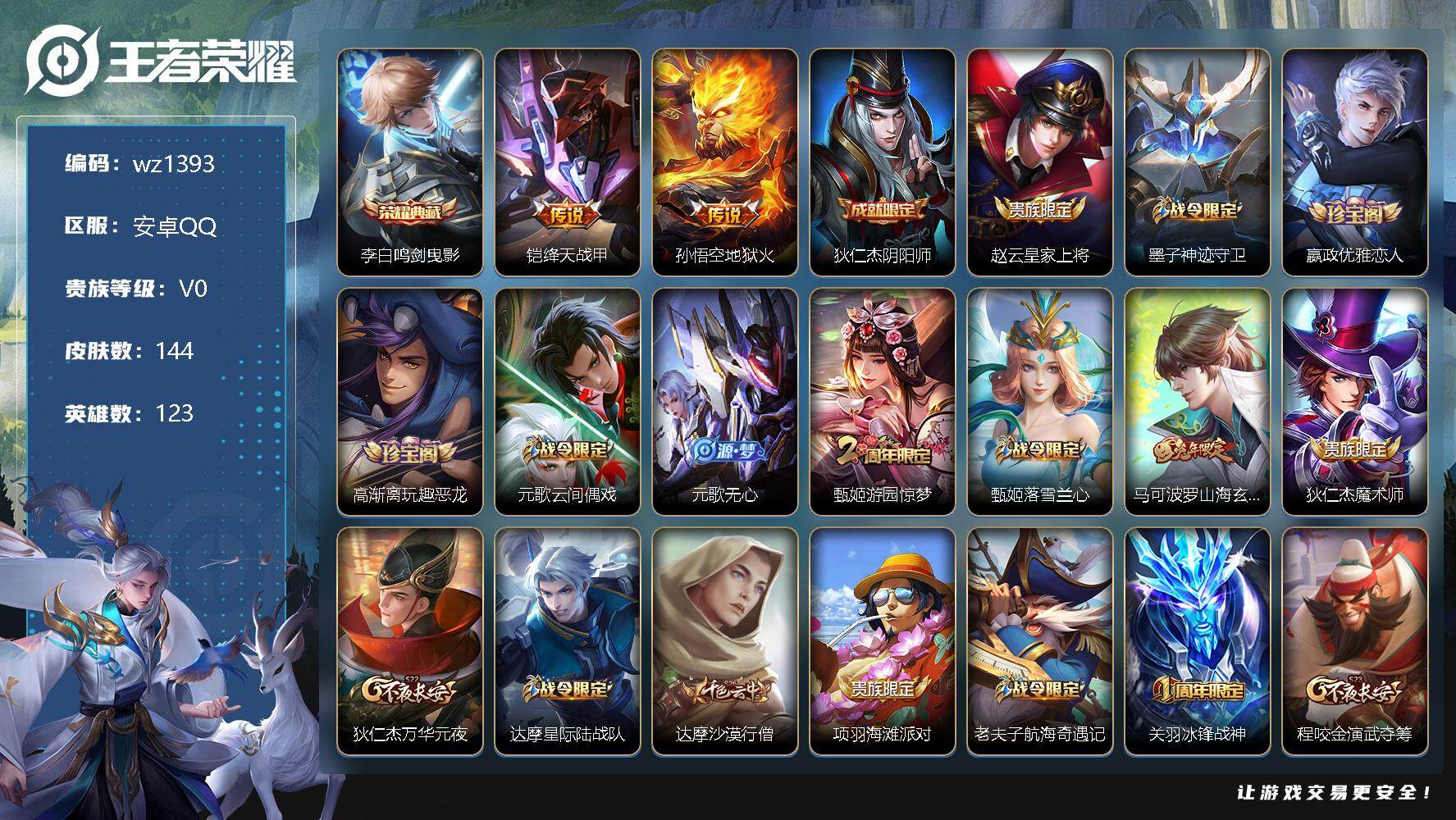 【游戏多多】 【可二次实名】【wz1393】【商品标题】:安卓Q-V0-至尊星耀II段位-123英雄-144皮肤-1典藏-0珍品无双-0无双-0珍品传说-2传说-41史诗 【荣耀典藏】:李白鸣剑曳影 【传说皮肤】:铠绛天战甲,孙悟空地狱火 【限定皮肤】:狄仁杰阴阳师,赵云皇家上将,墨子神迹守卫,嬴政优雅恋人,高渐离玩趣恶龙,元歌云间偶戏,元歌无心,甄姬游园惊梦,甄姬落雪兰心,马可波罗山海玄木吟,狄仁杰魔术师,狄仁杰万华元夜,达摩星际陆战队,达摩沙漠行僧,项羽海滩派对,老夫子航海奇遇记,关羽冰锋战神,程咬金演武夺筹,韩信逐梦之影,兰陵王金庭之子,亚瑟潮玩骑士王,李元芳云中旅人,钟馗驱傩正仪,鬼谷子原初探秘者,鬼谷子五谷丰年,铠青龙志,苏烈千军破阵,沈梦溪大漠名商,裴擒虎李小龙,米莱狄胡桃异想国,云中君纤云弄巧,上官婉儿梁祝,嫦娥拒霜思,桑启海盐诗旅,阿古朵江河有灵,张良古海寻踪,蒙犽百解令,鬼谷子天穹祈灯,周瑜熔金海岸 【年限皮肤】:铠青龙志,马可波罗山海玄木吟 【赛季限定】:狄仁杰万华元夜,达摩沙漠行僧,程咬金演武夺筹,兰陵王金庭之子,张良古海寻踪,李元芳云中旅人,钟馗驱傩正仪,鬼谷子原初探秘者,苏烈千军破阵,沈梦溪大漠名商,桑启海盐诗旅,鬼谷子天穹祈灯 【战令限定】:墨子神迹守卫,元歌云间偶戏,甄姬落雪兰心,达摩星际陆战队,老夫子航海奇遇记,亚瑟潮玩骑士王,米莱狄胡桃异想国 【史诗皮肤】:露娜紫霞仙子,赵云皇家上将,赵云未来纪元,貂蝉圣诞恋歌,狄仁杰魔术师,廉颇地狱岩魂,宫本武藏鬼剑武藏,孙尚香水果甜心,嬴政优雅恋人,妲己魅力维加斯,妲己女仆咖啡,曹操幽灵船长,吕布末日机甲,关羽冰锋战神,刘邦德古拉伯爵,韩信逐梦之影,小乔缤纷独角兽,兰陵王暗隐猎兽者,诸葛亮黄金分割率,甄姬游园惊梦,亚瑟心灵战警,百里守约特工魅影,李元芳逐浪之夏,阿轲节奏热浪,铠青龙志,狄仁杰鹰眼统帅,上官婉儿梁祝,橘右京修罗,裴擒虎李小龙,云中君纤云弄巧,元歌云间偶戏,米莱狄胡桃异想国,老夫子航海奇遇记,沈梦溪月团寄思,嫦娥拒霜思,鬼谷子五谷丰年,元歌无心,马可波罗山海玄木吟,阿古朵江河有灵,蒙犽百解令,黄忠百相守梦 【其他皮肤】:项羽海滩派对,韩信教廷特使,韩信街头霸王,露娜哥特玫瑰,达摩大发明家,赵云白执事,赵云忍炎影,白起白色死神,宫本武藏未来纪元,妲己少女阿狸,亚瑟死亡骑士,刘备万事如意,后羿阿尔法小队,狄仁杰阴阳师,刘备汉昭烈帝,关羽龙腾万里,墨子进击墨子号,钟无艳海滩丽影,宫本武藏霸王丸,王昭君幻想奇妙夜,老夫子功夫老勺,庄周奇妙博物学,小乔丁香结,高渐离玩趣恶龙,哪吒次元突破,鬼谷子原初探秘者,狄仁杰万华元夜,亚瑟潮玩骑士王,刘禅秘密基地,露娜瓷语鉴心,达摩星际陆战队,程咬金演武夺筹,张良缤纷绘卷,盘古重装意志,钟馗驱傩正仪,墨子神迹守卫,鲁班大师乓乓大师,苏烈千军破阵,典韦铁甲之心,妲己紫罗兰之誓,马可波罗潮玩牛仔,达摩沙漠行僧,刘邦虎啸剑宗,兰陵王金庭之子,沈梦溪大漠名商,甄姬落雪兰心,李元芳云中旅人,桑启海盐诗旅,海月幻泉雾影,猪八戒潮玩探月行,牛魔牛运亨通,白起乐园追猎者,赵怀真太极少年,姬小满零食大作战,李元芳妄想特派,张良古海寻踪,亚连破局者,曹操决胜大满贯,后羿完美运算,程咬金暖冬絮语,鬼谷子天穹祈灯,海诺时空谍影,朵莉亚金色潮汐,亚瑟鸿运当头,扁鹊无尽旅途,周瑜熔金海岸,影魅影绮裳,钟馗虚灵犬护,白起死霸装,甄姬逆浪荇歌,莱西奥踏浪烽翎,鬼谷子克喵,鲁班七号福禄兄弟,鲁班七号木偶奇遇记,高渐离金属狂潮,项羽帝国元帅,老夫子潮流仙人,狄仁杰锦衣卫,小乔万圣前夜,孙悟空西部大镖客,后羿精灵王,钟馗地府判官,李元芳特种部队,虞姬加勒比小姐,关羽天启骑士,马可波罗激情绿茵,杨戬埃及法老,铠龙域领主,苏烈爱与和平,裴擒虎街头旋风,元歌午夜歌剧院,孙策海之征途,李信灼热之刃,盘古创世神祝,曜归虚梦演,马超幸存者,鲁班大师归虚梦演,澜孤猎,云缨赤焰之缨,金蝉前尘 【内测皮肤】:嬴政优雅恋人,高渐离玩趣恶龙 【营地ID】:2118408296