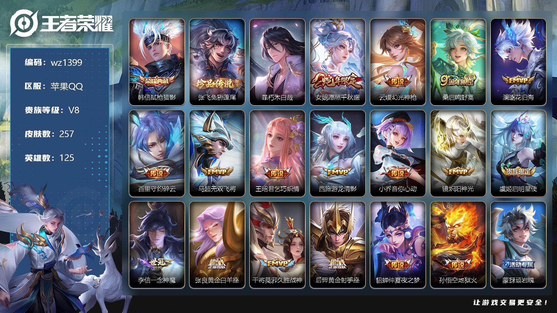 【游戏多多】 【可二次实名】【wz1399】【商品标题】:苹果Q-V8-最强王者段位-125英雄-257皮肤-1典藏-0珍品无双-0无双-2珍品传说-17传说-83史诗 【荣耀典藏】:韩信弑枪猎影 【珍品传说】:张飞兔狲蓬尾,暃朽木白哉 【传说皮肤】:女娲愿照千秋盛,云缨幻光神枪,桑启鸣野蒿,澜逐花归海,百里守约碎云,马超无双飞将,王昭君乞巧织情,西施游龙清影,小乔音你心动,镜炽阳神光,虞姬启明星使,李信一念神魔,张良黄金白羊座,干将莫邪久胜战神,后羿黄金射手座,貂蝉仲夏夜之梦,孙悟空地狱火 【限定皮肤】:蒙犽顽岩魄,蔡文姬夏日便利店,大乔绒语心约,虞姬夏日便利店,姜子牙天穹之誓,杨戬破阵退雄兵,李白谪仙醉月,狄仁杰阴阳师,赵云皇家上将,赵云引擎之心,赵云龙胆,嬴政白昼王子,鲁班七号狮舞东方,庄周高山流水,夏侯惇朔风刀,典韦岱宗,马可波罗逐梦之星,马可波罗暗影游猎,狄仁杰魔术师,项羽海滩派对,安琪拉魔法小厨娘,韩信飞衡,兰陵王驯魔猎人,孙悟空至尊宝,孙悟空孙行者,李元芳银河之约,李元芳云中旅人,虞姬启明星使,杨戬潮玩骑兵,干将莫邪胡桃夹子,蔡文姬繁星吟游,百里玄策原初追逐者,百里守约朱雀志,裴擒虎擒涛扼浪,云中君纤云弄巧,西施玲珑珍味,蒙犽狂想玩偶喵,鲁班大师探海日志,桑启海盐诗旅,艾琳流音漫舞,司空震地狱燃心,阿古朵江河有灵,张良古海寻踪,高渐离燃音魔法,妲己灵卜魔法,鬼谷子天穹祈灯,沈梦溪龙舞盛年,鲁班七号蔬乡物语,李元芳蔬乡物语,刘邦剑破天穹,程咬金群星魔术团,镜青焰无极,项羽苍威无极,周瑜熔金海岸 【年限皮肤】:百里守约朱雀志,韩信飞衡,典韦岱宗,马超神威,赵云龙胆 【赛季限定】:夏侯惇朔风刀,张良古海寻踪,李元芳云中旅人,百里玄策原初追逐者,裴擒虎擒涛扼浪,鲁班大师探海日志,桑启海盐诗旅,鬼谷子天穹祈灯,刘邦剑破天穹,姜子牙天穹之誓 【战令限定】:蔡文姬夏日便利店,虞姬夏日便利店,嬴政白昼王子,鲁班七号狮舞东方,马可波罗暗影游猎,兰陵王驯魔猎人,艾琳流音漫舞,李元芳银河之约,杨戬潮玩骑兵,西施玲珑珍味,蒙犽狂想玩偶喵,司空震地狱燃心,高渐离燃音魔法,妲己灵卜魔法,鲁班七号蔬乡物语,李元芳蔬乡物语,镜青焰无极,项羽苍威无极 【史诗皮肤】:鲁班七号电玩小子,露娜紫霞仙子,阿轲暗夜猫娘,赵云皇家上将,赵云未来纪元,貂蝉圣诞恋歌,甄姬冰雪圆舞曲,王昭君偶像歌手,狄仁杰魔术师,廉颇地狱岩魂,宫本武藏鬼剑武藏,孙尚香水果甜心,嬴政摇滚巨星,妲己魅力维加斯,妲己女仆咖啡,墨子金属风暴,吕布圣诞狂欢,刘禅绅士熊喵,曹操幽灵船长,李白千年之狐,吕布末日机甲,安琪拉魔法小厨娘,张飞乱世虎臣,孙悟空至尊宝,赵云引擎之心,花木兰水晶猎龙者,刘邦德古拉伯爵,夏侯惇乘风破浪,兰陵王暗隐猎兽者,诸葛亮黄金分割率,马可波罗逐梦之星,雅典娜冰冠公主,安琪拉心灵骇客,百里守约特工魅影,铠曙光守护者,刘禅天才门将,李元芳逐浪之夏,白起星夜王子,阿轲节奏热浪,嬴政白昼王子,孙策猫狗日记,百里守约朱雀志,伽罗箭羽风息,鲁班七号狮舞东方,狄仁杰鹰眼统帅,公孙离无限星赏官,兰陵王驯魔猎人,蔡文姬繁星吟游,李元芳银河之约,韩信飞衡,典韦岱宗,马超神威,赵云龙胆,马可波罗暗影游猎,蒙犽狂想玩偶喵,百里玄策原初追逐者,云中君纤云弄巧,蒙犽龙鼓争鸣,孙悟空孙行者,庄周高山流水,司马懿暗渊魔法,貂蝉唤灵魅影,刘禅电玩爆裂旋风,司空震地狱燃心,阿古朵江河有灵,妲己灵卜魔法,高渐离燃音魔法,鲁班七号蔬乡物语,镜青焰无极,蔡文姬夏日便利店,蒙犽顽岩魄,廉颇撼地雄心,亚连破空之剑,弈星炽弈燎原,李白谪仙醉月,牛魔星界战将,孙膑茶境仙,狄仁杰绮世丹青,阿轲化蝶舞,刘禅鸭鸭历险记,狂铁龙之律动,扁鹊灵蛊蚀心,百里守约雪豹霜爪,黄忠百相守梦 【其他皮肤】:项羽海滩派对,韩信教廷特使,韩信街头霸王,露娜哥特玫瑰,阿轲爱心护理,赵云白执事,赵云忍炎影,白起白色死神,牛魔西部大镖客,武则天东方不败,宫本武藏未来纪元,孙膑天使之翼,姜子牙时尚教父,妲己少女阿狸,典韦黄金武士,亚瑟死亡骑士,达摩拳王,花木兰兔女郎,张飞五福同心,甄姬花好人间,刘备万事如意,后羿阿尔法小队,狄仁杰阴阳师,刘备纽约教父,关羽龙腾万里,钟无艳海滩丽影,王昭君幻想奇妙夜,狂铁命运角斗场,老夫子功夫老勺,孙尚香沉稳之力,诸葛亮掌控之力,鬼谷子幻乐之宴,大乔守护之力,明世隐虹云星官,张良幽兰居士,小乔丁香结,吕布野性能量,沈梦溪鲨炮海盗猫,姜子牙炽热元素使,夏侯惇朔风刀,哪吒次元突破,狂铁特工战影,廉颇无尽征程,刘禅秘密基地,张良缤纷绘卷,鲁班大师乓乓大师,干将莫邪胡桃夹子,马可波罗潮玩牛仔,程咬金无双福将,米莱狄契约魔法,蒙恬蔚蓝守将,李元芳云中旅人,刘备潮玩造梦师,桑启海盐诗旅,猪八戒潮玩探月行,裴擒虎擒涛扼浪,杨戬潮玩骑兵,太乙真人劲辣红锅,