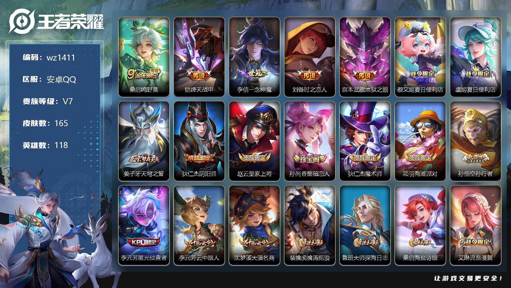 【游戏多多】 【可二次实名】【wz1411】【商品标题】:安卓Q-V7-尊贵铂金III段位-118英雄-165皮肤-0典藏-0珍品无双-0无双-0珍品传说-5传说-47史诗 【传说皮肤】:桑启鸣野蒿,铠绛天战甲,李信一念神魔,刘备时之恋人,宫本武藏地狱之眼 【限定皮肤】:蔡文姬夏日便利店,虞姬夏日便利店,姜子牙天穹之誓,狄仁杰阴阳师,赵云皇家上将,孙尚香蔷薇恋人,狄仁杰魔术师,项羽海滩派对,孙悟空孙行者,李元芳匿光侦查者,李元芳云中旅人,沈梦溪大漠名商,裴擒虎擒涛扼浪,鲁班大师探海日志,桑启海盐诗旅,艾琳流音漫舞,司空震地狱燃心,阿古朵江河有灵,张良古海寻踪,蒙犽百解令,高渐离燃音魔法,妲己灵卜魔法,鬼谷子天穹祈灯,沈梦溪龙舞盛年,鲁班七号蔬乡物语,李元芳蔬乡物语,刘邦剑破天穹,上官婉儿群星魔术团,镜青焰无极,项羽苍威无极,刘备异域游侠,周瑜熔金海岸 【赛季限定】:张良古海寻踪,李元芳云中旅人,沈梦溪大漠名商,裴擒虎擒涛扼浪,鲁班大师探海日志,桑启海盐诗旅,鬼谷子天穹祈灯,刘邦剑破天穹,姜子牙天穹之誓 【战令限定】:蔡文姬夏日便利店,虞姬夏日便利店,艾琳流音漫舞,司空震地狱燃心,高渐离燃音魔法,妲己灵卜魔法,鲁班七号蔬乡物语,李元芳蔬乡物语,镜青焰无极,项羽苍威无极 【史诗皮肤】:露娜紫霞仙子,赵云皇家上将,赵云未来纪元,貂蝉圣诞恋歌,甄姬冰雪圆舞曲,王昭君偶像歌手,狄仁杰魔术师,宫本武藏鬼剑武藏,孙尚香蔷薇恋人,孙尚香水果甜心,妲己魅力维加斯,妲己女仆咖啡,吕布圣诞狂欢,刘禅绅士熊喵,吕布末日机甲,花木兰水晶猎龙者,刘邦德古拉伯爵,夏侯惇乘风破浪,兰陵王暗隐猎兽者,百里守约特工魅影,铠曙光守护者,李元芳逐浪之夏,阿轲节奏热浪,孙策猫狗日记,狄仁杰鹰眼统帅,小乔青蛇,钟馗乐园奇幻夜,孙悟空孙行者,司马懿暗渊魔法,澜赏金猎手,李元芳匿光侦查者,司空震地狱燃心,阿古朵江河有灵,蒙犽百解令,妲己灵卜魔法,高渐离燃音魔法,鲁班七号蔬乡物语,上官婉儿群星魔术团,镜青焰无极,蔡文姬夏日便利店,姬小满战舞者,亚连破空之剑,马可波罗星界特工,孙膑茶境仙,阿轲化蝶舞,刘禅鸭鸭历险记,狂铁龙之律动,黄忠百相守梦 【其他皮肤】:项羽海滩派对,韩信教廷特使,韩信街头霸王,赵云忍炎影,安琪拉玩偶对对碰,孙膑天使之翼,妲己少女阿狸,典韦黄金武士,亚瑟死亡骑士,达摩拳王,花木兰兔女郎,刘备万事如意,宫本武藏万象初新,后羿阿尔法小队,狄仁杰阴阳师,刘备纽约教父,刘备汉昭烈帝,关羽龙腾万里,钟无艳海滩丽影,狂铁命运角斗场,老夫子功夫老勺,孙尚香沉稳之力,诸葛亮掌控之力,苏烈坚韧之力,大乔守护之力,明世隐虹云星官,小乔丁香结,刘禅秘密基地,露娜瓷语鉴心,鲁班大师乓乓大师,沈梦溪大漠名商,李元芳云中旅人,刘备潮玩造梦师,桑启海盐诗旅,裴擒虎擒涛扼浪,鲁班大师探海日志,姬小满零食大作战,李元芳妄想特派,艾琳流音漫舞,张良古海寻踪,钟无艳聚星闪耀,海月王牌新星,亚连破局者,兰陵王幻夜行动,曹操决胜大满贯,后羿完美运算,鬼谷子天穹祈灯,妲己灵卜魔法,海诺时空谍影,沈梦溪龙舞盛年,李元芳蔬乡物语,刘邦剑破天穹,项羽苍威无极,刘备异域游侠,姜子牙天穹之誓,周瑜熔金海岸,虞姬夏日便利店,孙悟空神迹守卫,盘古敬我三分,东皇太一噬灭天穹,干将莫邪雾都夜雨,吕布逐霄战戟,典韦铁骨偃魂,马超访茗客,西施雪境奇遇,明世隐景韶洛都,戈娅玫蓝誓约,沈梦溪鸭鸭历险记,苏烈春野闲踪,露娜命运加冕,白起死霸装,甄姬逆浪荇歌,庄周锦麟游梦,莱西奥踏浪烽翎,鬼谷子克喵,项羽帝国元帅,露娜绯红之刃,貂蝉异域舞娘,老夫子潮流仙人,狄仁杰锦衣卫,曹操超能战警,张良一千零一夜,孙悟空西部大镖客,后羿精灵王,刘禅英喵野望,钟馗地府判官,李元芳特种部队,雅典娜战争女神,马可波罗激情绿茵,苍维京掠夺者,杨戬埃及法老,诸葛亮星航指挥官,黄忠芝加哥教父,铠龙域领主,百里守约绝影神枪,女娲尼罗河女神,明世隐占星师,裴擒虎街头旋风,元歌午夜歌剧院,司马懿魇语军师,沈梦溪棒球奇才,李信灼热之刃,上官婉儿修竹墨客,猪八戒年年有余,云中君荷鲁斯之眼,曜归虚梦演,马超幸存者,镜冰刃幻境,蒙恬秩序猎龙将,澜孤猎,司空震启蛰,云缨赤焰之缨,暃碧珀绯影 【内测皮肤】:孙尚香蔷薇恋人 【营地ID】:1816757152