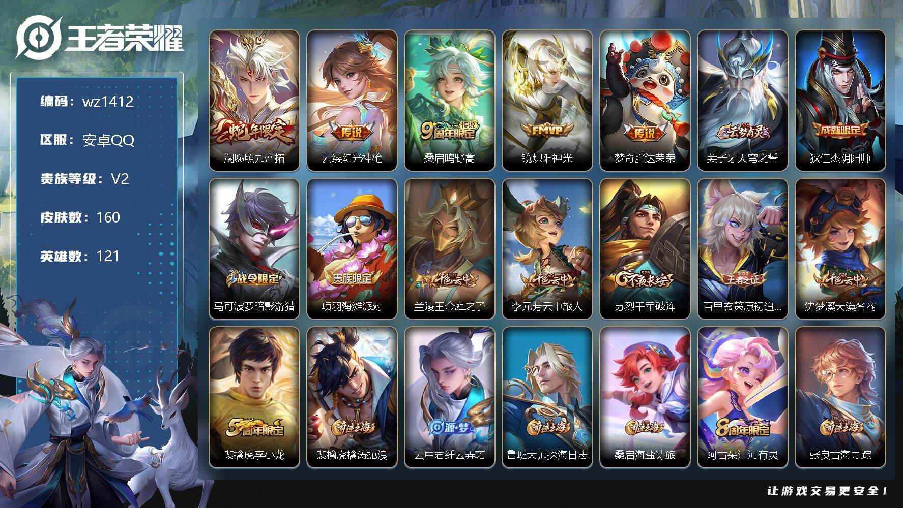 【游戏多多】 【可二次实名】【wz1412】【商品标题】:安卓Q-V2-最强王者段位-121英雄-160皮肤-0典藏-0珍品无双-0无双-0珍品传说-5传说-34史诗 【传说皮肤】:澜愿照九州拓,云缨幻光神枪,桑启鸣野蒿,镜炽阳神光,梦奇胖达荣荣 【限定皮肤】:姜子牙天穹之誓,狄仁杰阴阳师,马可波罗暗影游猎,项羽海滩派对,兰陵王金庭之子,李元芳云中旅人,苏烈千军破阵,百里玄策原初追逐者,沈梦溪大漠名商,裴擒虎李小龙,裴擒虎擒涛扼浪,云中君纤云弄巧,鲁班大师探海日志,桑启海盐诗旅,阿古朵江河有灵,张良古海寻踪,鬼谷子天穹祈灯,姬小满妄想食味,鲁班七号蔬乡物语,李元芳蔬乡物语,刘邦剑破天穹,程咬金群星魔术团,刘备异域游侠,周瑜熔金海岸 【赛季限定】:兰陵王金庭之子,张良古海寻踪,李元芳云中旅人,苏烈千军破阵,百里玄策原初追逐者,沈梦溪大漠名商,裴擒虎擒涛扼浪,鲁班大师探海日志,桑启海盐诗旅,鬼谷子天穹祈灯,刘邦剑破天穹,姜子牙天穹之誓 【战令限定】:马可波罗暗影游猎,鲁班七号蔬乡物语,李元芳蔬乡物语 【史诗皮肤】:赵云未来纪元,貂蝉圣诞恋歌,甄姬冰雪圆舞曲,宫本武藏鬼剑武藏,孙尚香水果甜心,嬴政摇滚巨星,妲己魅力维加斯,墨子金属风暴,曹操幽灵船长,吕布末日机甲,张飞乱世虎臣,花木兰水晶猎龙者,兰陵王暗隐猎兽者,诸葛亮黄金分割率,安琪拉心灵骇客,百里守约特工魅影,蔡文姬舞动绿茵,程咬金功夫厨神,白起星夜王子,阿轲节奏热浪,狄仁杰鹰眼统帅,公孙离无限星赏官,马可波罗暗影游猎,百里玄策原初追逐者,裴擒虎李小龙,云中君纤云弄巧,阿古朵江河有灵,姬小满妄想食味,鲁班七号蔬乡物语,牛魔星界战将,孙膑茶境仙,赵怀真器灵浮梦炉,阿轲化蝶舞,狂铁龙之律动 【其他皮肤】:项羽海滩派对,韩信教廷特使,韩信街头霸王,露娜哥特玫瑰,阿轲爱心护理,达摩大发明家,赵云忍炎影,芈月红桃皇后,白起白色死神,武则天东方不败,扁鹊化身博士,宫本武藏未来纪元,安琪拉玩偶对对碰,孙膑天使之翼,妲己少女阿狸,典韦黄金武士,亚瑟死亡骑士,花木兰兔女郎,甄姬花好人间,刘备万事如意,后羿阿尔法小队,狄仁杰阴阳师,刘备纽约教父,李元芳黑猫爱糖果,关羽龙腾万里,钟无艳海滩丽影,王昭君幻想奇妙夜,老夫子功夫老勺,孙尚香沉稳之力,苏烈坚韧之力,大乔守护之力,吕布野性能量,沈梦溪鲨炮海盗猫,哪吒次元突破,盾山圆桌骑士,狂铁特工战影,刘禅秘密基地,露娜瓷语鉴心,鲁班大师乓乓大师,苏烈千军破阵,兰陵王金庭之子,沈梦溪大漠名商,蒙恬蔚蓝守将,李元芳云中旅人,戈娅危途狂花,刘备潮玩造梦师,桑启海盐诗旅,猪八戒潮玩探月行,裴擒虎擒涛扼浪,太乙真人劲辣红锅,莱西奥西部游侠,鲁班大师探海日志,李元芳妄想特派,张良古海寻踪,钟无艳聚星闪耀,亚连破局者,后羿完美运算,鬼谷子天穹祈灯,钟无艳春野之旅,李元芳蔬乡物语,扁鹊无尽旅途,刘邦剑破天穹,程咬金群星魔术团,大司命暗都幽影,刘备异域游侠,姜子牙天穹之誓,周瑜熔金海岸,盘古敬我三分,东皇太一噬灭天穹,干将莫邪雾都夜雨,苍苍林狼骑,太乙真人谧流熔炉,典韦铁骨偃魂,马超访茗客,影魅影绮裳,西施雪境奇遇,姜子牙星梦巡礼,东皇太一金福满堂,达摩爆裂喵拳,明世隐景韶洛都,戈娅玫蓝誓约,刘备浪漫序章,钟馗虚灵犬护,苏烈春野闲踪,张良灵野札记,阿古朵布丁狗之约,鲁班七号木偶奇遇记,露娜绯红之刃,貂蝉异域舞娘,老夫子潮流仙人,曹操超能战警,孙悟空西部大镖客,李白范海辛,李元芳特种部队,虞姬加勒比小姐,夏侯惇战争骑士,马可波罗激情绿茵,诸葛亮星航指挥官,黄忠芝加哥教父,铠龙域领主,百里守约绝影神枪,梦奇美梦成真,明世隐占星师,公孙离花间舞,裴擒虎街头旋风,弈星踏雪寻梅,司马懿魇语军师,伽罗花见巫女,李信灼热之刃,上官婉儿修竹墨客,猪八戒年年有余,曜归虚梦演,马超幸存者,鲁班大师归虚梦演,蒙犽归虚梦演,镜冰刃幻境,蒙恬秩序猎龙将,澜孤猎,司空震启蛰,云缨赤焰之缨,暃碧珀绯影 【内测皮肤】:狂铁特工战影 【营地ID】:1713595690