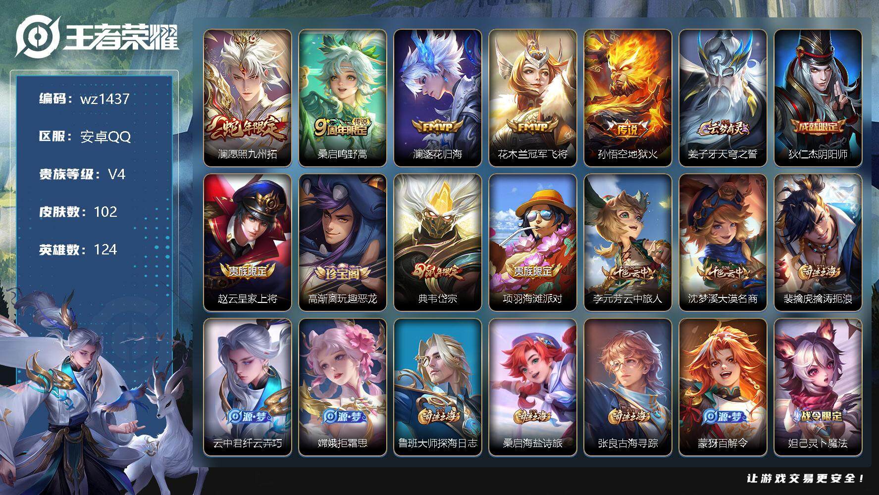 【游戏多多】 【可二次实名】【wz1437】【商品标题】:安卓Q-V4-至尊星耀IV段位-124英雄-102皮肤-0典藏-0珍品无双-0无双-0珍品传说-5传说-23史诗 【传说皮肤】:澜愿照九州拓,桑启鸣野蒿,澜逐花归海,花木兰冠军飞将,孙悟空地狱火 【限定皮肤】:姜子牙天穹之誓,狄仁杰阴阳师,赵云皇家上将,高渐离玩趣恶龙,典韦岱宗,项羽海滩派对,李元芳云中旅人,沈梦溪大漠名商,裴擒虎擒涛扼浪,云中君纤云弄巧,嫦娥拒霜思,鲁班大师探海日志,桑启海盐诗旅,张良古海寻踪,蒙犽百解令,妲己灵卜魔法,鬼谷子天穹祈灯,沈梦溪龙舞盛年 【年限皮肤】:典韦岱宗 【赛季限定】:张良古海寻踪,李元芳云中旅人,沈梦溪大漠名商,裴擒虎擒涛扼浪,鲁班大师探海日志,桑启海盐诗旅,鬼谷子天穹祈灯,姜子牙天穹之誓 【战令限定】:妲己灵卜魔法 【史诗皮肤】:露娜紫霞仙子,赵云皇家上将,貂蝉圣诞恋歌,甄姬冰雪圆舞曲,宫本武藏鬼剑武藏,孙尚香水果甜心,墨子金属风暴,吕布圣诞狂欢,李白千年之狐,刘邦德古拉伯爵,兰陵王暗隐猎兽者,诸葛亮黄金分割率,百里守约特工魅影,阿轲节奏热浪,狄仁杰鹰眼统帅,典韦岱宗,小乔青蛇,云中君纤云弄巧,嫦娥拒霜思,蒙犽百解令,妲己灵卜魔法,孙膑茶境仙,阿轲化蝶舞,刘禅鸭鸭历险记 【其他皮肤】:项羽海滩派对,韩信教廷特使,露娜哥特玫瑰,达摩大发明家,白起白色死神,牛魔西部大镖客,安琪拉玩偶对对碰,妲己少女阿狸,花木兰兔女郎,刘备万事如意,狄仁杰阴阳师,刘备汉昭烈帝,钟无艳海滩丽影,李白敏锐之力,苏烈坚韧之力,大乔守护之力,小乔丁香结,高渐离玩趣恶龙,沈梦溪鲨炮海盗猫,刘禅秘密基地,沈梦溪大漠名商,蒙恬蔚蓝守将,李元芳云中旅人,桑启海盐诗旅,猪八戒潮玩探月行,裴擒虎擒涛扼浪,太乙真人劲辣红锅,鲁班大师探海日志,李元芳妄想特派,张良古海寻踪,后羿完美运算,鬼谷子天穹祈灯,妲己灵卜魔法,沈梦溪龙舞盛年,姜子牙天穹之誓,盘古敬我三分,东皇太一噬灭天穹,干将莫邪雾都夜雨,吕布逐霄战戟,苍苍林狼骑,太乙真人谧流熔炉,典韦铁骨偃魂,马超访茗客,西施雪境奇遇,姜子牙星梦巡礼,明世隐景韶洛都,戈娅玫蓝誓约,钟馗虚灵犬护,沈梦溪鸭鸭历险记,阿古朵布丁狗之约,露娜命运加冕,白起死霸装,鲁班七号木偶奇遇记,貂蝉异域舞娘,王昭君精灵公主,孙悟空西部大镖客,钟馗地府判官,李元芳特种部队,夏侯惇战争骑士,雅典娜战争女神,马可波罗激情绿茵,哪吒三太子,黄忠芝加哥教父,女娲尼罗河女神,公孙离花间舞,司马懿魇语军师,沈梦溪棒球奇才,李信灼热之刃,瑶森,曜归虚梦演,西施归虚梦演,澜孤猎,司空震启蛰,云缨赤焰之缨 【内测皮肤】:高渐离玩趣恶龙 【营地ID】:1713579102