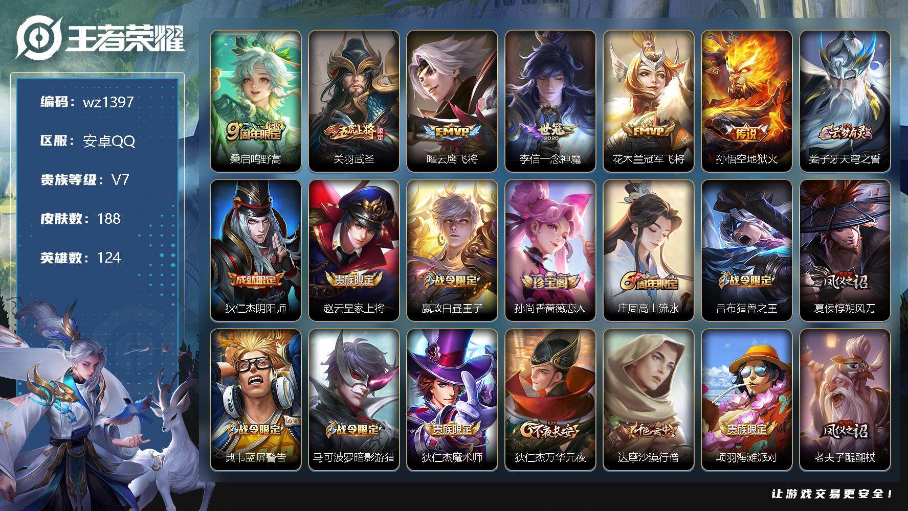【游戏多多】 【可二次实名】【wz1397】【商品标题】:安卓Q-V7-最强王者段位-124英雄-188皮肤-0典藏-0珍品无双-0无双-0珍品传说-6传说-51史诗 【传说皮肤】:桑启鸣野蒿,关羽武圣,曜云鹰飞将,李信一念神魔,花木兰冠军飞将,孙悟空地狱火 【限定皮肤】:姜子牙天穹之誓,狄仁杰阴阳师,赵云皇家上将,嬴政白昼王子,孙尚香蔷薇恋人,庄周高山流水,吕布猎兽之王,夏侯惇朔风刀,典韦蓝屏警告,马可波罗暗影游猎,狄仁杰魔术师,狄仁杰万华元夜,达摩沙漠行僧,项羽海滩派对,老夫子醍醐杖,关羽武圣,程咬金演武夺筹,孙悟空至尊宝,孙悟空大圣娶亲,孙悟空孙行者,牛魔御旌,后羿圣弓游侠,李元芳云中旅人,钟馗驱傩正仪,杨玉环遇见飞天,女娲朔望之晖,干将莫邪真爱魔法,雅典娜黎明之约,东皇太一逐梦之光,鬼谷子原初探秘者,鬼谷子五谷丰年,苏烈千军破阵,百里玄策原初追逐者,百里守约朱雀志,弈星混沌棋,沈梦溪大漠名商,明世隐疑决卦,裴擒虎李小龙,裴擒虎擒涛扼浪,狂铁御狮,米莱狄御霄,盾山御銮,猪八戒西部大镖客,上官婉儿梁祝,嫦娥拒霜思,鲁班大师探海日志,桑启海盐诗旅,张良古海寻踪,鬼谷子天穹祈灯,刘邦剑破天穹 【年限皮肤】:百里守约朱雀志,马超神威,关羽武圣 【赛季限定】:夏侯惇朔风刀,狄仁杰万华元夜,达摩沙漠行僧,老夫子醍醐杖,程咬金演武夺筹,张良古海寻踪,牛魔御旌,李元芳云中旅人,钟馗驱傩正仪,雅典娜黎明之约,鬼谷子原初探秘者,苏烈千军破阵,百里玄策原初追逐者,弈星混沌棋,沈梦溪大漠名商,明世隐疑决卦,裴擒虎擒涛扼浪,狂铁御狮,米莱狄御霄,盾山御銮,鲁班大师探海日志,桑启海盐诗旅,鬼谷子天穹祈灯,刘邦剑破天穹,姜子牙天穹之誓 【战令限定】:嬴政白昼王子,吕布猎兽之王,典韦蓝屏警告,马可波罗暗影游猎,后羿圣弓游侠,女娲朔望之晖,干将莫邪真爱魔法,猪八戒西部大镖客 【史诗皮肤】:露娜紫霞仙子,赵云皇家上将,赵云未来纪元,貂蝉圣诞恋歌,狄仁杰魔术师,宫本武藏鬼剑武藏,孙尚香蔷薇恋人,孙尚香水果甜心,嬴政暗夜贵公子,妲己魅力维加斯,妲己女仆咖啡,墨子金属风暴,曹操幽灵船长,李白千年之狐,吕布末日机甲,张飞乱世虎臣,韩信白龙吟,孙悟空至尊宝,花木兰水晶猎龙者,夏侯惇乘风破浪,小乔缤纷独角兽,兰陵王暗隐猎兽者,安琪拉心灵骇客,百里守约特工魅影,铠曙光守护者,蔡文姬舞动绿茵,刘禅天才门将,杨玉环遇见飞天,东皇太一逐梦之光,嬴政白昼王子,孙策猫狗日记,百里守约朱雀志,孙悟空大圣娶亲,典韦蓝屏警告,狄仁杰鹰眼统帅,上官婉儿梁祝,橘右京修罗,马超神威,马可波罗暗影游猎,百里玄策原初追逐者,裴擒虎李小龙,干将莫邪真爱魔法,孙悟空孙行者,庄周高山流水,嫦娥拒霜思,雅典娜黎明之约,鬼谷子五谷丰年,牛魔星界战将,狂铁龙之律动,后羿石田雨龙,黄忠百相守梦 【其他皮肤】:项羽海滩派对,韩信教廷特使,韩信街头霸王,露娜哥特玫瑰,阿轲爱心护理,达摩大发明家,赵云忍炎影,芈月红桃皇后,程咬金星际陆战队,白起白色死神,牛魔西部大镖客,宫本武藏未来纪元,安琪拉玩偶对对碰,孙膑天使之翼,典韦黄金武士,亚瑟死亡骑士,花木兰兔女郎,张飞五福同心,甄姬花好人间,刘备万事如意,后羿阿尔法小队,狄仁杰阴阳师,关羽龙腾万里,钟无艳海滩丽影,宫本武藏霸王丸,狂铁命运角斗场,老夫子功夫老勺,孙尚香沉稳之力,诸葛亮掌控之力,李白敏锐之力,鬼谷子幻乐之宴,狂铁御狮,苏烈坚韧之力,米莱狄御霄,吕布猎兽之王,庄周奇妙博物学,牛魔御旌,女娲朔望之晖,小乔丁香结,吕布野性能量,盾山御銮,沈梦溪鲨炮海盗猫,姜子牙炽热元素使,夏侯惇朔风刀,弈星混沌棋,明世隐疑决卦,老夫子醍醐杖,猪八戒西部大镖客,狂铁特工战影,鬼谷子原初探秘者,狄仁杰万华元夜,程咬金演武夺筹,盘古重装意志,钟馗驱傩正仪,鲁班大师乓乓大师,苏烈千军破阵,后羿圣弓游侠,典韦铁甲之心,达摩沙漠行僧,程咬金无双福将,沈梦溪大漠名商,李元芳云中旅人,桑启海盐诗旅,猪八戒潮玩探月行,裴擒虎擒涛扼浪,鲁班大师探海日志,张良古海寻踪,海月王牌新星,鬼谷子天穹祈灯,廉颇功夫炙烤,刘邦剑破天穹,姜子牙天穹之誓,盘古敬我三分,东皇太一噬灭天穹,苍苍林狼骑,典韦铁骨偃魂,西施雪境奇遇,姜子牙星梦巡礼,钟馗虚灵犬护,阿古朵布丁狗之约,露娜命运加冕,姬小满小满鸭,白起死霸装,甄姬逆浪荇歌,庄周锦麟游梦,高渐离落日弦歌,莱西奥踏浪烽翎,鬼谷子克喵,鲁班七号福禄兄弟,高渐离金属狂潮,项羽帝国元帅,貂蝉异域舞娘,老夫子潮流仙人,王昭君精灵公主,张良一千零一夜,孙悟空西部大镖客,孙尚香火炮千金,后羿精灵王,兰陵王隐刃,李白范海辛,钟馗地府判官,李元芳特种部队,刘邦圣殿之光,关羽天启骑士,夏侯惇战争骑士,雅典娜战争女神,杨戬埃及法老,太乙真人圆桌骑士,哪吒三太子,黄忠芝加哥教父,大乔伊势巫女,干将莫邪第七人偶
