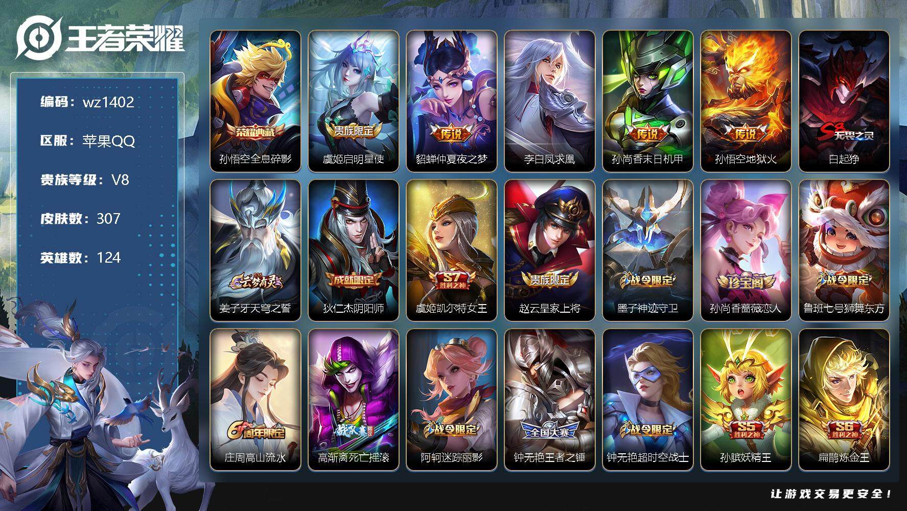 【游戏多多】 【可二次实名】【wz1402】【商品标题】:苹果Q-V8-永恒钻石III段位-124英雄-307皮肤-1典藏-0珍品无双-0无双-0珍品传说-5传说-81史诗 【荣耀典藏】:孙悟空全息碎影 【传说皮肤】:虞姬启明星使,貂蝉仲夏夜之梦,李白凤求凰,孙尚香末日机甲,孙悟空地狱火 【限定皮肤】:白起狰,姜子牙天穹之誓,狄仁杰阴阳师,虞姬凯尔特女王,赵云皇家上将,墨子神迹守卫,孙尚香蔷薇恋人,鲁班七号狮舞东方,庄周高山流水,高渐离死亡摇滚,阿轲迷踪丽影,钟无艳王者之锤,钟无艳超时空战士,孙膑妖精王,扁鹊炼金王,白起夜都怪侠,芈月重明,芈月幻夜卜梦,吕布御风骁将,周瑜赤莲之焰,元歌云间偶戏,元歌无心,夏侯惇朔风刀,甄姬游园惊梦,甄姬落雪兰心,曹操烛龙,马可波罗暗影游猎,狄仁杰魔术师,狄仁杰万华元夜,达摩星际陆战队,达摩沙漠行僧,项羽海滩派对,老夫子醍醐杖,老夫子航海奇遇记,程咬金演武夺筹,刘邦夺宝奇兵,王昭君午后时光,兰陵王驯魔猎人,兰陵王金庭之子,亚瑟潮玩骑士王,孙悟空大圣娶亲,牛魔御旌,后羿圣弓游侠,李元芳银河之约,李元芳云中旅人,虞姬启明星使,钟馗神迹守卫,钟馗驱傩正仪,干将莫邪冰霜恋舞曲,干将莫邪真爱魔法,雅典娜单词大作战,雅典娜黎明之约,蔡文姬繁星吟游,太乙真人饕餮,鬼谷子原初探秘者,鬼谷子五谷丰年,黄忠烈魂,黄忠火炮绅士,苏烈千军破阵,百里守约朱雀志,弈星混沌棋,沈梦溪星空之诺,沈梦溪大漠名商,明世隐疑决卦,明世隐吟游魔法,裴擒虎李小龙,狂铁御狮,米莱狄御霄,米莱狄胡桃异想国,云中君纤云弄巧,盾山御銮,猪八戒西部大镖客,上官婉儿梁祝,蒙犽狂想玩偶喵,桑启海盐诗旅,阿古朵江河有灵,张良古海寻踪,李元芳蔬乡物语,刘邦剑破天穹 【年限皮肤】:百里守约朱雀志,李白凤求凰,吕布御风骁将,黄忠烈魂 【赛季限定】:孙膑妖精王,扁鹊炼金王,白起狰,芈月重明,夏侯惇朔风刀,曹操烛龙,狄仁杰万华元夜,达摩沙漠行僧,老夫子醍醐杖,程咬金演武夺筹,兰陵王金庭之子,张良古海寻踪,牛魔御旌,李元芳云中旅人,虞姬凯尔特女王,钟馗驱傩正仪,雅典娜黎明之约,太乙真人饕餮,鬼谷子原初探秘者,苏烈千军破阵,弈星混沌棋,沈梦溪大漠名商,明世隐疑决卦,狂铁御狮,米莱狄御霄,盾山御銮,桑启海盐诗旅,刘邦剑破天穹,姜子牙天穹之誓 【战令限定】:墨子神迹守卫,鲁班七号狮舞东方,阿轲迷踪丽影,钟无艳超时空战士,白起夜都怪侠,芈月幻夜卜梦,周瑜赤莲之焰,元歌云间偶戏,甄姬落雪兰心,马可波罗暗影游猎,达摩星际陆战队,老夫子航海奇遇记,刘邦夺宝奇兵,王昭君午后时光,兰陵王驯魔猎人,亚瑟潮玩骑士王,后羿圣弓游侠,李元芳银河之约,钟馗神迹守卫,干将莫邪真爱魔法,雅典娜单词大作战,黄忠火炮绅士,沈梦溪星空之诺,明世隐吟游魔法,米莱狄胡桃异想国,猪八戒西部大镖客,蒙犽狂想玩偶喵,李元芳蔬乡物语 【史诗皮肤】:鲁班七号电玩小子,项羽苍穹之光,露娜紫霞仙子,阿轲暗夜猫娘,钟无艳王者之锤,赵云皇家上将,赵云未来纪元,貂蝉圣诞恋歌,甄姬冰雪圆舞曲,王昭君偶像歌手,狄仁杰魔术师,廉颇地狱岩魂,宫本武藏鬼剑武藏,孙尚香蔷薇恋人,孙尚香水果甜心,嬴政摇滚巨星,妲己魅力维加斯,妲己女仆咖啡,墨子金属风暴,吕布圣诞狂欢,刘禅绅士熊喵,曹操幽灵船长,吕布末日机甲,张飞乱世虎臣,韩信白龙吟,花木兰水晶猎龙者,夏侯惇乘风破浪,小乔缤纷独角兽,兰陵王暗隐猎兽者,诸葛亮黄金分割率,甄姬游园惊梦,亚瑟心灵战警,雅典娜冰冠公主,安琪拉心灵骇客,百里守约特工魅影,铠曙光守护者,蔡文姬舞动绿茵,刘禅天才门将,李元芳逐浪之夏,白起星夜王子,百里守约朱雀志,干将莫邪冰霜恋舞曲,孙悟空大圣娶亲,伽罗箭羽风息,鲁班七号狮舞东方,狄仁杰鹰眼统帅,公孙离无限星赏官,兰陵王驯魔猎人,上官婉儿梁祝,蔡文姬繁星吟游,李元芳银河之约,娜可露露晚萤,不知火舞魅语,阿轲迷踪丽影,瑶遇见神鹿,黄忠烈魂,孙尚香时之恋人,马可波罗暗影游猎,蒙犽狂想玩偶喵,裴擒虎李小龙,云中君纤云弄巧,元歌云间偶戏,吕布御风骁将,米莱狄胡桃异想国,老夫子航海奇遇记,干将莫邪真爱魔法,钟馗乐园奇幻夜,庄周高山流水,黄忠火炮绅士,雅典娜黎明之约,澜赏金猎手,明世隐吟游魔法,钟无艳超时空战士,鬼谷子五谷丰年,元歌无心,阿古朵江河有灵,百里守约百相守梦,阿轲化蝶舞,刘禅鸭鸭历险记,狂铁龙之律动,百里守约雪豹霜爪 【其他皮肤】:项羽海滩派对,韩信教廷特使,韩信街头霸王,露娜哥特玫瑰,阿轲致命风华,阿轲爱心护理,达摩大发明家,赵云白执事,赵云忍炎影,芈月红桃皇后,程咬金爱与正义,白起白色死神,牛魔西部大镖客,扁鹊化身博士,扁鹊救世之瞳,宫本武藏未来纪元,安琪拉玩偶对对碰,孙膑天使之翼,姜子牙时尚教父,妲己少女阿狸,典韦黄金武士,亚瑟死亡骑士,达摩拳王,花木兰兔女郎,张飞五福同心,甄姬花好人间