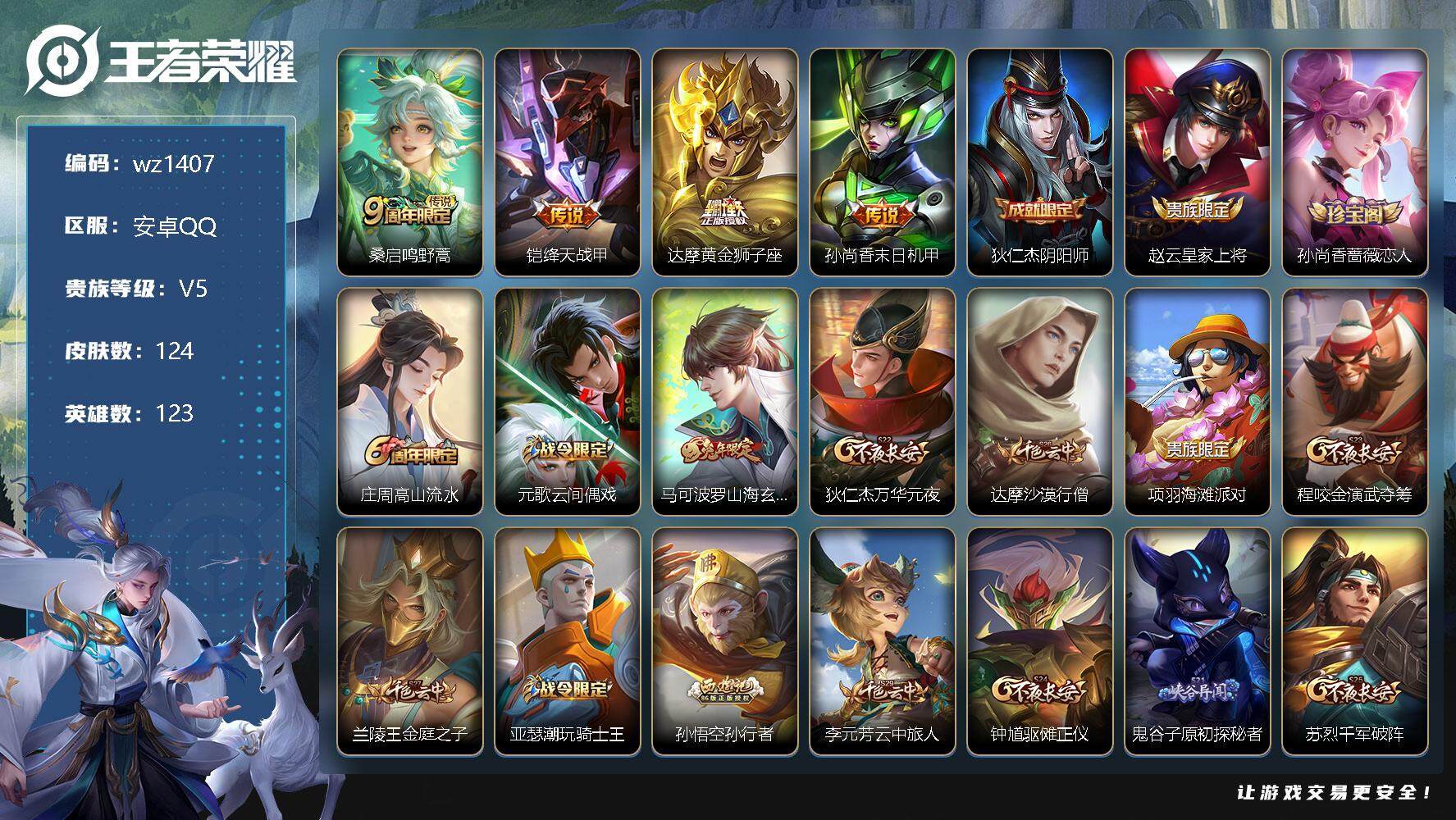 【游戏多多】 【可二次实名】【wz1407】【商品标题】:安卓Q-V5-至尊星耀V段位-123英雄-124皮肤-0典藏-0珍品无双-0无双-0珍品传说-4传说-27史诗 【传说皮肤】:桑启鸣野蒿,铠绛天战甲,达摩黄金狮子座,孙尚香末日机甲 【限定皮肤】:狄仁杰阴阳师,赵云皇家上将,孙尚香蔷薇恋人,庄周高山流水,元歌云间偶戏,马可波罗山海玄木吟,狄仁杰万华元夜,达摩沙漠行僧,项羽海滩派对,程咬金演武夺筹,兰陵王金庭之子,亚瑟潮玩骑士王,孙悟空孙行者,李元芳云中旅人,钟馗驱傩正仪,鬼谷子原初探秘者,苏烈千军破阵,沈梦溪大漠名商,明世隐疑决卦,裴擒虎李小龙,裴擒虎擒涛扼浪,鲁班大师探海日志,桑启海盐诗旅,张良古海寻踪,蒙犽百解令,鬼谷子天穹祈灯,刘邦剑破天穹 【年限皮肤】:马可波罗山海玄木吟 【赛季限定】:狄仁杰万华元夜,达摩沙漠行僧,程咬金演武夺筹,兰陵王金庭之子,张良古海寻踪,李元芳云中旅人,钟馗驱傩正仪,鬼谷子原初探秘者,苏烈千军破阵,沈梦溪大漠名商,明世隐疑决卦,裴擒虎擒涛扼浪,鲁班大师探海日志,桑启海盐诗旅,鬼谷子天穹祈灯,刘邦剑破天穹 【战令限定】:元歌云间偶戏,亚瑟潮玩骑士王 【史诗皮肤】:赵云皇家上将,赵云未来纪元,甄姬冰雪圆舞曲,廉颇地狱岩魂,宫本武藏鬼剑武藏,孙尚香蔷薇恋人,孙尚香水果甜心,妲己魅力维加斯,墨子金属风暴,吕布圣诞狂欢,曹操幽灵船长,张飞乱世虎臣,花木兰水晶猎龙者,亚瑟心灵战警,百里守约特工魅影,程咬金功夫厨神,阿轲节奏热浪,狄仁杰鹰眼统帅,橘右京修罗,裴擒虎李小龙,元歌云间偶戏,孙悟空孙行者,庄周高山流水,马可波罗山海玄木吟,蒙犽百解令,狂铁龙之律动,黄忠百相守梦 【其他皮肤】:项羽海滩派对,韩信教廷特使,露娜哥特玫瑰,阿轲爱心护理,达摩大发明家,赵云忍炎影,芈月红桃皇后,程咬金爱与正义,安琪拉玩偶对对碰,亚瑟死亡骑士,达摩拳王,花木兰兔女郎,狄仁杰阴阳师,刘备纽约教父,王昭君幻想奇妙夜,狂铁命运角斗场,老夫子功夫老勺,孙尚香沉稳之力,诸葛亮掌控之力,鬼谷子幻乐之宴,吕布野性能量,姜子牙炽热元素使,哪吒次元突破,明世隐疑决卦,鬼谷子原初探秘者,狄仁杰万华元夜,亚瑟潮玩骑士王,刘禅秘密基地,杨戬次元傲视,程咬金演武夺筹,张良缤纷绘卷,钟馗驱傩正仪,鲁班大师乓乓大师,苏烈千军破阵,达摩沙漠行僧,兰陵王金庭之子,沈梦溪大漠名商,李元芳云中旅人,桑启海盐诗旅,猪八戒潮玩探月行,牛魔牛运亨通,裴擒虎擒涛扼浪,鲁班大师探海日志,李元芳妄想特派,张良古海寻踪,后羿完美运算,鬼谷子天穹祈灯,廉颇功夫炙烤,刘邦剑破天穹,东皇太一噬灭天穹,苍苍林狼骑,典韦铁骨偃魂,西施雪境奇遇,露娜命运加冕,姬小满小满鸭,白起死霸装,甄姬逆浪荇歌,庄周锦麟游梦,莱西奥踏浪烽翎,鲁班七号福禄兄弟,貂蝉异域舞娘,狄仁杰锦衣卫,曹操超能战警,孙悟空西部大镖客,周瑜海军大将,刘禅英喵野望,兰陵王隐刃,虞姬加勒比小姐,关羽天启骑士,雅典娜战争女神,马可波罗激情绿茵,杨戬埃及法老,太乙真人圆桌骑士,百里守约绝影神枪,苏烈爱与和平,公孙离花间舞,米莱狄精准探案法,元歌午夜歌剧院,孙策海之征途,司马懿魇语军师,伽罗花见巫女,李信灼热之刃,上官婉儿修竹墨客,嫦娥露花倒影,猪八戒年年有余,盘古创世神祝,瑶森,曜归虚梦演,马超幸存者,蒙恬秩序猎龙将,澜孤猎,金蝉前尘,桑启画中游 【内测皮肤】:孙尚香蔷薇恋人 【营地ID】:1816361554