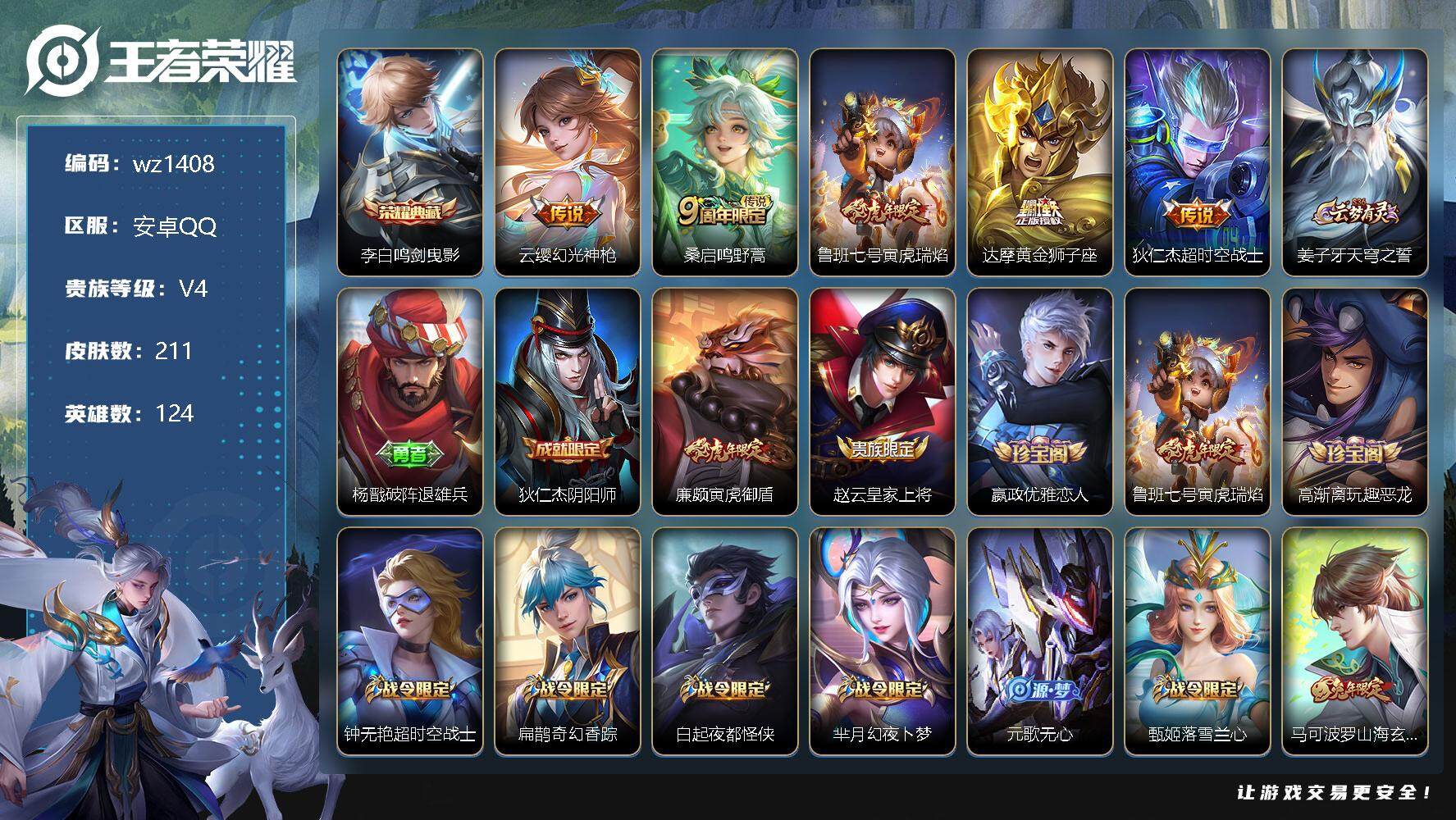 【游戏多多】 【可二次实名】【wz1408】【商品标题】:安卓Q-V4-最强王者段位-124英雄-211皮肤-1典藏-0珍品无双-0无双-0珍品传说-5传说-64史诗 【荣耀典藏】:李白鸣剑曳影 【传说皮肤】:云缨幻光神枪,桑启鸣野蒿,鲁班七号寅虎瑞焰,达摩黄金狮子座,狄仁杰超时空战士 【限定皮肤】:姜子牙天穹之誓,杨戬破阵退雄兵,狄仁杰阴阳师,廉颇寅虎御盾,赵云皇家上将,嬴政优雅恋人,鲁班七号寅虎瑞焰,高渐离玩趣恶龙,钟无艳超时空战士,扁鹊奇幻香踪,白起夜都怪侠,芈月幻夜卜梦,元歌无心,甄姬落雪兰心,马可波罗山海玄木吟,狄仁杰魔术师,达摩沙漠行僧,项羽海滩派对,关羽百相守梦,王昭君午后时光,兰陵王金庭之子,花木兰默契交锋,后羿圣弓游侠,刘备百相守梦,李元芳银河之约,李元芳云中旅人,杨戬潮玩骑兵,鬼谷子原初探秘者,鬼谷子五谷丰年,黄忠火炮绅士,苏烈千军破阵,梦奇顽趣,沈梦溪大漠名商,沈梦溪匿光破解者,明世隐吟游魔法,裴擒虎李小龙,裴擒虎擒涛扼浪,狂铁电玩高手,云中君纤云弄巧,上官婉儿梁祝,嫦娥拒霜思,嫦娥暖冬兔眠,西施玲珑珍味,蒙犽狂想玩偶喵,鲁班大师探海日志,桑启海盐诗旅,暃星界游侠,戈娅驭风魔法,阿古朵江河有灵,张良古海寻踪,蒙犽百解令,蒙恬荣光圣徽,鬼谷子天穹祈灯,伽罗琥珀纪元,沈梦溪龙舞盛年,鲁班七号蔬乡物语,李元芳蔬乡物语,刘邦剑破天穹,程咬金群星魔术团,周瑜熔金海岸 【年限皮肤】:鲁班七号寅虎瑞焰,廉颇寅虎御盾,马可波罗山海玄木吟 【赛季限定】:达摩沙漠行僧,兰陵王金庭之子,张良古海寻踪,李元芳云中旅人,鬼谷子原初探秘者,苏烈千军破阵,梦奇顽趣,沈梦溪大漠名商,裴擒虎擒涛扼浪,鲁班大师探海日志,桑启海盐诗旅,鬼谷子天穹祈灯,蒙恬荣光圣徽,刘邦剑破天穹,姜子牙天穹之誓 【战令限定】:钟无艳超时空战士,扁鹊奇幻香踪,白起夜都怪侠,芈月幻夜卜梦,甄姬落雪兰心,王昭君午后时光,后羿圣弓游侠,李元芳银河之约,杨戬潮玩骑兵,黄忠火炮绅士,明世隐吟游魔法,狂铁电玩高手,嫦娥暖冬兔眠,西施玲珑珍味,蒙犽狂想玩偶喵,暃星界游侠,戈娅驭风魔法,鲁班七号蔬乡物语,李元芳蔬乡物语 【史诗皮肤】:阿轲暗夜猫娘,赵云皇家上将,赵云未来纪元,甄姬冰雪圆舞曲,狄仁杰魔术师,宫本武藏鬼剑武藏,孙尚香水果甜心,嬴政优雅恋人,嬴政摇滚巨星,妲己魅力维加斯,妲己女仆咖啡,墨子金属风暴,吕布圣诞狂欢,吕布末日机甲,花木兰水晶猎龙者,夏侯惇乘风破浪,小乔缤纷独角兽,诸葛亮黄金分割率,亚瑟心灵战警,安琪拉心灵骇客,百里守约特工魅影,铠曙光守护者,蔡文姬舞动绿茵,刘禅天才门将,李元芳逐浪之夏,程咬金功夫厨神,白起星夜王子,孙策猫狗日记,大乔猫狗日记,狄仁杰鹰眼统帅,公孙离无限星赏官,上官婉儿梁祝,李元芳银河之约,橘右京修罗,蒙犽狂想玩偶喵,裴擒虎李小龙,云中君纤云弄巧,花木兰默契交锋,嫦娥拒霜思,黄忠火炮绅士,廉颇寅虎御盾,哪吒雪上飞焰,夏洛特永昼,明世隐吟游魔法,貂蝉唤灵魅影,狂铁电玩高手,钟无艳超时空战士,鬼谷子五谷丰年,元歌无心,梦奇顽趣,暃星界游侠,马可波罗山海玄木吟,扁鹊奇幻香踪,刘备百相守梦,关羽百相守梦,沈梦溪匿光破解者,刘禅电玩爆裂旋风,戈娅驭风魔法,阿古朵江河有灵,蒙犽百解令,周瑜雪夜绮愿,蒙恬荣光圣徽,伽罗琥珀纪元,鲁班七号蔬乡物语 【其他皮肤】:项羽海滩派对,韩信教廷特使,韩信街头霸王,露娜哥特玫瑰,达摩大发明家,赵云白执事,赵云忍炎影,白起白色死神,牛魔西部大镖客,扁鹊化身博士,扁鹊救世之瞳,宫本武藏未来纪元,安琪拉玩偶对对碰,妲己少女阿狸,典韦黄金武士,亚瑟死亡骑士,达摩拳王,花木兰兔女郎,张飞五福同心,刘备万事如意,后羿阿尔法小队,狄仁杰阴阳师,关羽龙腾万里,墨子进击墨子号,钟无艳海滩丽影,王昭君幻想奇妙夜,老夫子功夫老勺,孙尚香沉稳之力,鬼谷子幻乐之宴,大乔守护之力,明世隐虹云星官,孙膑归虚梦演,高渐离玩趣恶龙,沈梦溪鲨炮海盗猫,姜子牙炽热元素使,哪吒次元突破,盾山圆桌骑士,狂铁特工战影,鬼谷子原初探秘者,刘禅秘密基地,张良缤纷绘卷,鲁班大师乓乓大师,苏烈千军破阵,后羿圣弓游侠,马可波罗潮玩牛仔,达摩沙漠行僧,芈月幻夜卜梦,白起夜都怪侠,兰陵王金庭之子,刘禅唤灵魔甲,米莱狄契约魔法,王昭君午后时光,沈梦溪大漠名商,蒙恬蔚蓝守将,甄姬落雪兰心,李元芳云中旅人,桑启海盐诗旅,嫦娥暖冬兔眠,海月幻泉雾影,猪八戒潮玩探月行,牛魔牛运亨通,裴擒虎擒涛扼浪,杨戬潮玩骑兵,太乙真人劲辣红锅,莱西奥西部游侠,鲁班大师探海日志,西施玲珑珍味,李元芳妄想特派,哪吒热血海滩,张良古海寻踪,钟无艳聚星闪耀,亚连破局者,兰陵王幻夜行动,曹操决胜大满贯,后羿完美运算,程咬金暖冬絮语,鬼谷子天穹祈灯,海诺时空谍影,嫦娥漠中幻影,廉颇功夫炙烤,沈梦溪龙舞盛年,钟无艳春野之旅,李元芳蔬乡物
