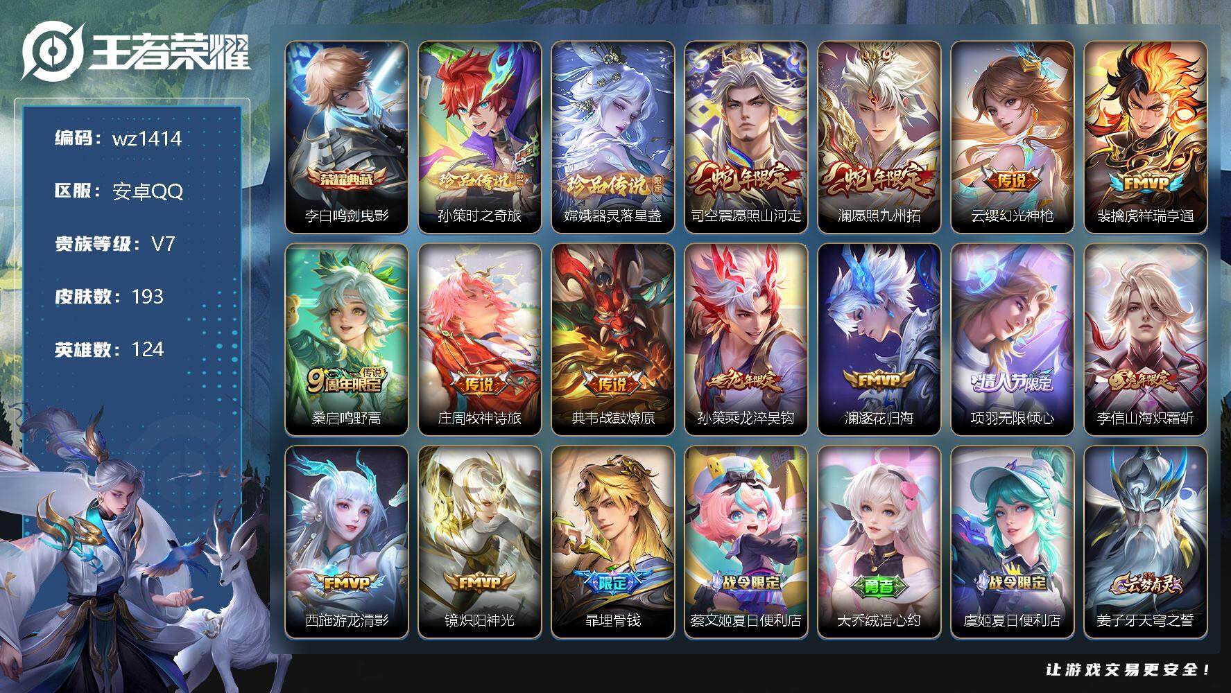 【游戏多多】 【可二次实名】【wz1414】【商品标题】:安卓Q-V7-最强王者段位-124英雄-193皮肤-1典藏-0珍品无双-0无双-2珍品传说-13传说-53史诗 【荣耀典藏】:李白鸣剑曳影 【珍品传说】:孙策时之奇旅,嫦娥器灵落星盏 【传说皮肤】:司空震愿照山河定,澜愿照九州拓,云缨幻光神枪,裴擒虎祥瑞亨通,桑启鸣野蒿,庄周牧神诗旅,典韦战鼓燎原,孙策乘龙淬吴钩,澜逐花归海,项羽无限倾心,李信山海炽霜斩,西施游龙清影,镜炽阳神光 【限定皮肤】:暃埋骨钱,蔡文姬夏日便利店,大乔绒语心约,虞姬夏日便利店,姜子牙天穹之誓,狄仁杰阴阳师,赵云皇家上将,阿轲迷踪丽影,狄仁杰魔术师,达摩沙漠行僧,项羽海滩派对,项羽无限倾心,兰陵王金庭之子,干将莫邪胡桃夹子,鬼谷子五谷丰年,沈梦溪大漠名商,裴擒虎擒涛扼浪,李信山海炽霜斩,鲁班大师探海日志,桑启海盐诗旅,阿古朵江河有灵,张良古海寻踪,高渐离燃音魔法,妲己灵卜魔法,鬼谷子天穹祈灯,孙策乘龙淬吴钩,沈梦溪龙舞盛年,刘邦剑破天穹,程咬金群星魔术团,镜青焰无极,项羽苍威无极,周瑜熔金海岸 【年限皮肤】:马超神威,李信山海炽霜斩,孙策乘龙淬吴钩 【赛季限定】:达摩沙漠行僧,兰陵王金庭之子,张良古海寻踪,沈梦溪大漠名商,裴擒虎擒涛扼浪,鲁班大师探海日志,桑启海盐诗旅,鬼谷子天穹祈灯,刘邦剑破天穹,姜子牙天穹之誓 【战令限定】:蔡文姬夏日便利店,虞姬夏日便利店,阿轲迷踪丽影,高渐离燃音魔法,妲己灵卜魔法,镜青焰无极,项羽苍威无极 【史诗皮肤】:项羽苍穹之光,赵云皇家上将,貂蝉圣诞恋歌,甄姬冰雪圆舞曲,王昭君偶像歌手,狄仁杰魔术师,廉颇地狱岩魂,宫本武藏鬼剑武藏,孙尚香水果甜心,嬴政暗夜贵公子,嬴政摇滚巨星,妲己魅力维加斯,妲己女仆咖啡,墨子金属风暴,吕布圣诞狂欢,刘禅绅士熊喵,曹操幽灵船长,张飞乱世虎臣,花木兰水晶猎龙者,夏侯惇乘风破浪,兰陵王暗隐猎兽者,诸葛亮黄金分割率,百里守约特工魅影,李元芳逐浪之夏,程咬金功夫厨神,白起星夜王子,阿轲节奏热浪,狄仁杰鹰眼统帅,娜可露露晚萤,小乔青蛇,阿轲迷踪丽影,橘右京修罗,瑶遇见神鹿,马超神威,澜赏金猎手,鬼谷子五谷丰年,阿古朵江河有灵,妲己灵卜魔法,高渐离燃音魔法,桑启奇遇星旅,镜青焰无极,蔡文姬夏日便利店,暃埋骨钱,亚连破空之剑,弈星炽弈燎原,马可波罗星界特工,艾琳陌上桑,百里守约百相守梦,牛魔星界战将,白起苍鳞隐世,赵怀真器灵浮梦炉,阿轲化蝶舞,狂铁龙之律动,黄忠百相守梦 【其他皮肤】:项羽海滩派对,韩信教廷特使,韩信街头霸王,赵云忍炎影,白起白色死神,安琪拉玩偶对对碰,孙膑天使之翼,妲己少女阿狸,典韦黄金武士,亚瑟死亡骑士,达摩拳王,张飞五福同心,狄仁杰阴阳师,刘备纽约教父,刘备汉昭烈帝,关羽龙腾万里,墨子进击墨子号,王昭君幻想奇妙夜,孙尚香沉稳之力,诸葛亮掌控之力,鬼谷子幻乐之宴,大乔守护之力,明世隐虹云星官,沈梦溪鲨炮海盗猫,姜子牙炽热元素使,哪吒次元突破,鲁班七号黑桃队长,狂铁特工战影,刘禅秘密基地,鲁班大师乓乓大师,典韦铁甲之心,干将莫邪胡桃夹子,马可波罗潮玩牛仔,达摩沙漠行僧,兰陵王金庭之子,刘禅唤灵魔甲,沈梦溪大漠名商,蒙犽胡桃狂想曲,蒙恬蔚蓝守将,桑启海盐诗旅,海月幻泉雾影,猪八戒潮玩探月行,牛魔牛运亨通,白起乐园追猎者,赵怀真太极少年,裴擒虎擒涛扼浪,太乙真人劲辣红锅,莱西奥西部游侠,鲁班大师探海日志,李元芳妄想特派,哪吒热血海滩,张良古海寻踪,钟无艳聚星闪耀,曹操决胜大满贯,后羿完美运算,鬼谷子天穹祈灯,妲己灵卜魔法,海诺时空谍影,朵莉亚金色潮汐,亚瑟鸿运当头,沈梦溪龙舞盛年,钟无艳春野之旅,扁鹊无尽旅途,刘邦剑破天穹,程咬金群星魔术团,项羽苍威无极,大司命暗都幽影,姜子牙天穹之誓,周瑜熔金海岸,虞姬夏日便利店,大乔绒语心约,孙悟空神迹守卫,盘古敬我三分,东皇太一噬灭天穹,亚瑟动物派对,老夫子百相守梦,米莱狄怪诞之夜,干将莫邪雾都夜雨,吕布逐霄战戟,苍苍林狼骑,太乙真人谧流熔炉,典韦铁骨偃魂,西施雪境奇遇,姜子牙星梦巡礼,东皇太一金福满堂,达摩爆裂喵拳,少司缘灵卦秘语,明世隐景韶洛都,戈娅玫蓝誓约,刘备浪漫序章,钟馗虚灵犬护,苏烈春野闲踪,小乔秘证寻踪,张良灵野札记,阿古朵布丁狗之约,露娜命运加冕,雅典娜潮玩士官长,姬小满小满鸭,白起死霸装,甄姬逆浪荇歌,庄周锦麟游梦,莱西奥踏浪烽翎,鬼谷子克喵,老夫子潮流仙人,周瑜海军大将,雅典娜战争女神,马可波罗激情绿茵,苍维京掠夺者,诸葛亮星航指挥官,鬼谷子阿摩司公爵,百里守约绝影神枪,苏烈爱与和平,公孙离花间舞,裴擒虎街头旋风,弈星踏雪寻梅,司马懿魇语军师,瑶森,马超幸存者,澜孤猎,司空震启蛰,云缨赤焰之缨,金蝉前尘,暃碧珀绯影,桑启画中游 【内测皮肤】:狂铁特工战影,干将莫邪胡桃夹子 【营地ID】:180147