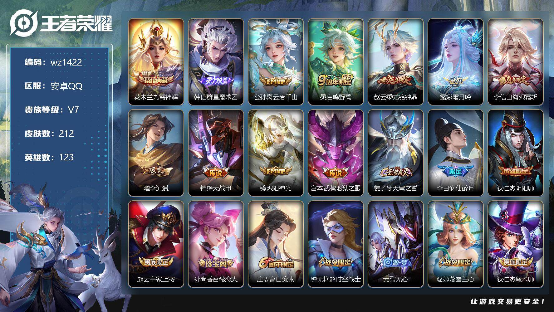【游戏多多】 【可二次实名】【wz1422】【商品标题】:安卓Q-V7-至尊星耀V段位-123英雄-212皮肤-1典藏-0珍品无双-1无双-0珍品传说-9传说-52史诗 【荣耀典藏】:花木兰九霄神辉 【无双皮肤】:韩信群星魔术团 【传说皮肤】:公孙离云诺千山,桑启鸣野蒿,赵云乘龙铭钟鼎,露娜霜月吟,李信山海炽霜斩,曜李逍遥 ,铠绛天战甲,镜炽阳神光,宫本武藏地狱之眼 【限定皮肤】:姜子牙天穹之誓,李白谪仙醉月,狄仁杰阴阳师,赵云皇家上将,孙尚香蔷薇恋人,庄周高山流水,钟无艳超时空战士,元歌无心,甄姬落雪兰心,狄仁杰魔术师,达摩沙漠行僧,项羽海滩派对,程咬金演武夺筹,兰陵王金庭之子,花木兰默契交锋,孙悟空美猴王,孙悟空孙行者,李元芳云中旅人,钟馗驱傩正仪,鬼谷子五谷丰年,沈梦溪大漠名商,裴擒虎李小龙,裴擒虎擒涛扼浪,云中君纤云弄巧,李信山海炽霜斩,嫦娥暖冬兔眠,曜李逍遥 ,西施玲珑珍味,蒙犽狂想玩偶喵,鲁班大师探海日志,桑启海盐诗旅,暃星界游侠,戈娅驭风魔法,阿古朵江河有灵,张良古海寻踪,蒙犽百解令,鬼谷子天穹祈灯,姬小满妄想食味,赵云乘龙铭钟鼎,百里玄策超元猎域,沈梦溪龙舞盛年,鲁班七号蔬乡物语,李元芳蔬乡物语,刘邦剑破天穹,程咬金群星魔术团,韩信群星魔术团,周瑜熔金海岸 【年限皮肤】:孙悟空美猴王,李信山海炽霜斩,赵云乘龙铭钟鼎 【赛季限定】:达摩沙漠行僧,程咬金演武夺筹,兰陵王金庭之子,张良古海寻踪,李元芳云中旅人,钟馗驱傩正仪,沈梦溪大漠名商,裴擒虎擒涛扼浪,鲁班大师探海日志,桑启海盐诗旅,鬼谷子天穹祈灯,刘邦剑破天穹,姜子牙天穹之誓 【战令限定】:钟无艳超时空战士,甄姬落雪兰心,嫦娥暖冬兔眠,西施玲珑珍味,蒙犽狂想玩偶喵,暃星界游侠,戈娅驭风魔法,鲁班七号蔬乡物语,李元芳蔬乡物语 【史诗皮肤】:赵云皇家上将,赵云未来纪元,貂蝉圣诞恋歌,甄姬冰雪圆舞曲,狄仁杰魔术师,宫本武藏鬼剑武藏,孙尚香蔷薇恋人,孙尚香水果甜心,妲己魅力维加斯,妲己女仆咖啡,墨子金属风暴,曹操幽灵船长,吕布末日机甲,刘邦德古拉伯爵,夏侯惇乘风破浪,小乔缤纷独角兽,兰陵王暗隐猎兽者,诸葛亮黄金分割率,亚瑟心灵战警,安琪拉心灵骇客,铠曙光守护者,蔡文姬舞动绿茵,刘禅天才门将,李元芳逐浪之夏,程咬金功夫厨神,白起星夜王子,阿轲节奏热浪,狄仁杰鹰眼统帅,蒙犽狂想玩偶喵,裴擒虎李小龙,云中君纤云弄巧,花木兰默契交锋,孙悟空孙行者,庄周高山流水,夏洛特永昼,钟无艳超时空战士,鬼谷子五谷丰年,元歌无心,暃星界游侠,刘禅电玩爆裂旋风,戈娅驭风魔法,阿古朵江河有灵,蒙犽百解令,姬小满妄想食味,百里玄策超元猎域,鲁班七号蔬乡物语,亚连破空之剑,李白谪仙醉月,刘禅鸭鸭历险记,狂铁龙之律动,后羿石田雨龙,黄忠百相守梦 【其他皮肤】:项羽海滩派对,韩信教廷特使,韩信街头霸王,露娜哥特玫瑰,达摩大发明家,赵云忍炎影,芈月红桃皇后,白起白色死神,扁鹊化身博士,姜子牙时尚教父,妲己少女阿狸,典韦黄金武士,亚瑟死亡骑士,达摩拳王,孙悟空美猴王,花木兰兔女郎,张飞五福同心,甄姬花好人间,刘备万事如意,狄仁杰阴阳师,刘备纽约教父,刘备汉昭烈帝,关羽龙腾万里,钟无艳海滩丽影,狂铁命运角斗场,老夫子功夫老勺,孙尚香沉稳之力,诸葛亮掌控之力,李白敏锐之力,苏烈坚韧之力,明世隐虹云星官,吕布野性能量,孙膑归虚梦演,沈梦溪鲨炮海盗猫,姜子牙炽热元素使,哪吒次元突破,盾山圆桌骑士,狂铁特工战影,刘禅秘密基地,露娜瓷语鉴心,程咬金演武夺筹,张良缤纷绘卷,钟馗驱傩正仪,鲁班大师乓乓大师,典韦铁甲之心,达摩沙漠行僧,程咬金无双福将,兰陵王金庭之子,沈梦溪大漠名商,蒙恬蔚蓝守将,甄姬落雪兰心,李元芳云中旅人,刘备潮玩造梦师,桑启海盐诗旅,嫦娥暖冬兔眠,猪八戒潮玩探月行,白起乐园追猎者,赵怀真太极少年,裴擒虎擒涛扼浪,太乙真人劲辣红锅,莱西奥西部游侠,鲁班大师探海日志,西施玲珑珍味,姬小满零食大作战,李元芳妄想特派,哪吒热血海滩,张良古海寻踪,钟无艳聚星闪耀,兰陵王幻夜行动,后羿完美运算,鬼谷子天穹祈灯,廉颇功夫炙烤,亚瑟鸿运当头,沈梦溪龙舞盛年,钟无艳春野之旅,李元芳蔬乡物语,刘邦剑破天穹,盘古经纬探寻者,程咬金群星魔术团,大司命暗都幽影,姜子牙天穹之誓,周瑜熔金海岸,孙悟空神迹守卫,盘古敬我三分,东皇太一噬灭天穹,干将莫邪雾都夜雨,姜子牙星梦巡礼,钟馗虚灵犬护,沈梦溪鸭鸭历险记,苏烈春野闲踪,张良灵野札记,阿古朵布丁狗之约,露娜命运加冕,姬小满小满鸭,白起死霸装,甄姬逆浪荇歌,庄周锦麟游梦,莱西奥踏浪烽翎,鲁班七号福禄兄弟,鲁班七号木偶奇遇记,高渐离金属狂潮,老夫子潮流仙人,王昭君精灵公主,狄仁杰锦衣卫,孙膑未来旅行,孙悟空西部大镖客,后羿精灵王,李白范海辛,李元芳特种部队,刘邦圣殿之光,关羽天启骑士,夏侯惇战争骑士,雅典娜战争