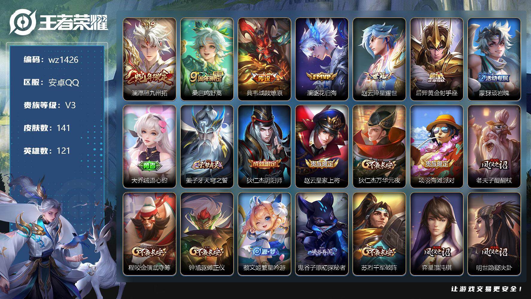 【游戏多多】 【可二次实名】【wz1426】【商品标题】:安卓Q-V3-至尊星耀I段位-121英雄-141皮肤-0典藏-0珍品无双-0无双-0珍品传说-6传说-32史诗 【传说皮肤】:澜愿照九州拓,桑启鸣野蒿,典韦战鼓燎原,澜逐花归海,赵云淬星耀世,后羿黄金射手座 【限定皮肤】:蒙犽顽岩魄,大乔绒语心约,姜子牙天穹之誓,狄仁杰阴阳师,赵云皇家上将,狄仁杰万华元夜,项羽海滩派对,老夫子醍醐杖,程咬金演武夺筹,钟馗驱傩正仪,蔡文姬繁星吟游,鬼谷子原初探秘者,苏烈千军破阵,弈星混沌棋,明世隐疑决卦,裴擒虎李小龙,云中君纤云弄巧,张良古海寻踪,鬼谷子天穹祈灯,姬小满妄想食味,沈梦溪龙舞盛年,刘邦剑破天穹,程咬金群星魔术团,周瑜熔金海岸 【赛季限定】:狄仁杰万华元夜,老夫子醍醐杖,程咬金演武夺筹,张良古海寻踪,钟馗驱傩正仪,鬼谷子原初探秘者,苏烈千军破阵,弈星混沌棋,明世隐疑决卦,鬼谷子天穹祈灯,刘邦剑破天穹,姜子牙天穹之誓 【史诗皮肤】:鲁班七号电玩小子,露娜紫霞仙子,赵云皇家上将,赵云未来纪元,貂蝉圣诞恋歌,甄姬冰雪圆舞曲,宫本武藏鬼剑武藏,孙尚香水果甜心,嬴政摇滚巨星,妲己魅力维加斯,妲己女仆咖啡,墨子金属风暴,吕布圣诞狂欢,刘邦德古拉伯爵,兰陵王暗隐猎兽者,亚瑟心灵战警,铠曙光守护者,李元芳逐浪之夏,程咬金功夫厨神,白起星夜王子,孙策猫狗日记,伽罗箭羽风息,狄仁杰鹰眼统帅,蔡文姬繁星吟游,裴擒虎李小龙,云中君纤云弄巧,姬小满妄想食味,蒙犽顽岩魄,赵怀真器灵浮梦炉,阿轲化蝶舞,刘禅鸭鸭历险记,狂铁龙之律动 【其他皮肤】:项羽海滩派对,韩信教廷特使,韩信街头霸王,阿轲爱心护理,赵云忍炎影,程咬金星际陆战队,白起白色死神,安琪拉玩偶对对碰,孙膑天使之翼,妲己少女阿狸,典韦黄金武士,亚瑟死亡骑士,花木兰兔女郎,张飞五福同心,甄姬花好人间,后羿阿尔法小队,狄仁杰阴阳师,刘备汉昭烈帝,关羽龙腾万里,钟无艳海滩丽影,老夫子功夫老勺,孙尚香沉稳之力,李白敏锐之力,鬼谷子幻乐之宴,苏烈坚韧之力,大乔守护之力,明世隐虹云星官,孙膑归虚梦演,沈梦溪鲨炮海盗猫,姜子牙炽热元素使,弈星混沌棋,哪吒次元突破,鲁班七号黑桃队长,明世隐疑决卦,盾山圆桌骑士,老夫子醍醐杖,鬼谷子原初探秘者,狄仁杰万华元夜,刘禅秘密基地,露娜瓷语鉴心,程咬金演武夺筹,钟馗驱傩正仪,鲁班大师乓乓大师,苏烈千军破阵,马可波罗潮玩牛仔,程咬金无双福将,刘禅唤灵魔甲,猪八戒潮玩探月行,太乙真人劲辣红锅,哪吒热血海滩,张良古海寻踪,后羿完美运算,鬼谷子天穹祈灯,廉颇功夫炙烤,沈梦溪龙舞盛年,钟无艳春野之旅,刘邦剑破天穹,程咬金群星魔术团,姜子牙天穹之誓,周瑜熔金海岸,大乔绒语心约,盘古敬我三分,东皇太一噬灭天穹,干将莫邪雾都夜雨,苍苍林狼骑,太乙真人谧流熔炉,典韦铁骨偃魂,西施雪境奇遇,姜子牙星梦巡礼,明世隐景韶洛都,戈娅玫蓝誓约,钟馗虚灵犬护,沈梦溪鸭鸭历险记,苏烈春野闲踪,张良灵野札记,阿古朵布丁狗之约,露娜命运加冕,甄姬逆浪荇歌,莱西奥踏浪烽翎,鲁班七号木偶奇遇记,项羽帝国元帅,钟无艳生化警戒,貂蝉异域舞娘,王昭君精灵公主,小乔万圣前夜,孙悟空西部大镖客,周瑜海军大将,太乙真人圆桌骑士,大乔伊势巫女,铠龙域领主,明世隐占星师,裴擒虎街头旋风,米莱狄精准探案法,孙策海之征途,伽罗花见巫女,上官婉儿修竹墨客,猪八戒年年有余,盘古创世神祝,瑶森,西施归虚梦演,蒙犽归虚梦演,澜孤猎,暃碧珀绯影 【营地ID】:1629713254