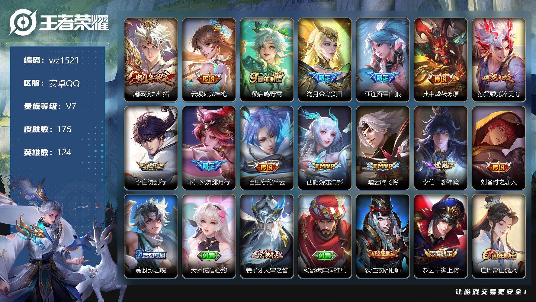 【游戏多多】 【可二次实名】【wz1552】【商品标题】:安卓Q-V7-最强王者段位-124英雄-192皮肤-1典藏-0珍品无双-0无双-1珍品传说-7传说-45史诗 【英雄全皮】:影全皮 【荣耀典藏】:李白鸣剑曳影 【珍品传说】:嫦娥器灵落星盏 【传说皮肤】:司马懿九山相柳,虞姬愿照岁时盈,桑启鸣野蒿,裴擒虎寅虎赤拳,诸葛亮时雨天司,镜炽阳神光,曜云鹰飞将 【限定皮肤】:姜子牙天穹之誓,狄仁杰阴阳师,赵云皇家上将,孙尚香蔷薇恋人,夏侯惇朔风刀,典韦穷奇,马可波罗暗影游猎,狄仁杰魔术师,狄仁杰万华元夜,达摩沙漠行僧,项羽海滩派对,老夫子醍醐杖,关羽冰锋战神,程咬金演武夺筹,韩信飞衡,兰陵王金庭之子,花木兰默契交锋,孙悟空至尊宝,孙悟空大圣娶亲,牛魔御旌,钟馗驱傩正仪,雅典娜单词大作战,雅典娜黎明之约,鬼谷子原初探秘者,诸葛亮时雨天司,铠青龙志,苏烈千军破阵,弈星混沌棋,沈梦溪大漠名商,明世隐疑决卦,裴擒虎李小龙,裴擒虎寅虎赤拳,米莱狄御霄,盾山御銮,猪八戒西部大镖客,上官婉儿梁祝,西施至美乘鲤谣,蒙犽狂想玩偶喵,鲁班大师探海日志,桑启海盐诗旅,张良古海寻踪 【年限皮肤】:铠青龙志,裴擒虎寅虎赤拳,诸葛亮时雨天司,韩信飞衡 【赛季限定】:夏侯惇朔风刀,典韦穷奇,狄仁杰万华元夜,达摩沙漠行僧,老夫子醍醐杖,程咬金演武夺筹,兰陵王金庭之子,张良古海寻踪,牛魔御旌,钟馗驱傩正仪,雅典娜黎明之约,鬼谷子原初探秘者,苏烈千军破阵,弈星混沌棋,沈梦溪大漠名商,明世隐疑决卦,米莱狄御霄,盾山御銮,鲁班大师探海日志,桑启海盐诗旅,姜子牙天穹之誓 【战令限定】:马可波罗暗影游猎,雅典娜单词大作战,猪八戒西部大镖客,蒙犽狂想玩偶喵 【史诗皮肤】:露娜紫霞仙子,赵云皇家上将,甄姬冰雪圆舞曲,王昭君偶像歌手,狄仁杰魔术师,宫本武藏鬼剑武藏,孙尚香蔷薇恋人,孙尚香水果甜心,妲己魅力维加斯,妲己女仆咖啡,吕布圣诞狂欢,曹操幽灵船长,李白千年之狐,张飞乱世虎臣,关羽冰锋战神,孙悟空至尊宝,刘邦德古拉伯爵,兰陵王暗隐猎兽者,亚瑟心灵战警,百里守约特工魅影,蔡文姬舞动绿茵,李元芳逐浪之夏,白起星夜王子,孙策猫狗日记,铠青龙志,孙悟空大圣娶亲,狄仁杰鹰眼统帅,上官婉儿梁祝,韩信飞衡,大乔白蛇,瑶遇见神鹿,马可波罗暗影游猎,蒙犽狂想玩偶喵,裴擒虎李小龙,花木兰默契交锋,雅典娜黎明之约,西施至美乘鲤谣,孙膑茶境仙,赵怀真器灵浮梦炉,阿轲化蝶舞,刘禅鸭鸭历险记,狂铁龙之律动,老夫子藏狐褐绒,后羿石田雨龙,黄忠百相守梦 【其他皮肤】:项羽海滩派对,韩信教廷特使,韩信街头霸王,露娜哥特玫瑰,达摩大发明家,赵云白执事,赵云忍炎影,白起白色死神,武则天东方不败,扁鹊化身博士,孙膑天使之翼,妲己少女阿狸,典韦黄金武士,亚瑟死亡骑士,达摩拳王,花木兰兔女郎,张飞五福同心,甄姬花好人间,刘备万事如意,宫本武藏万象初新,狄仁杰阴阳师,刘备汉昭烈帝,关羽龙腾万里,钟无艳海滩丽影,宫本武藏霸王丸,王昭君幻想奇妙夜,狂铁命运角斗场,老夫子功夫老勺,牛魔制霸全明星,孙尚香沉稳之力,典韦穷奇,李白敏锐之力,安琪拉如懿,苏烈坚韧之力,项羽科学大爆炸,米莱狄御霄,明世隐虹云星官,庄周奇妙博物学,牛魔御旌,小乔丁香结,吕布野性能量,盾山御銮,孙膑归虚梦演,沈梦溪鲨炮海盗猫,姜子牙炽热元素使,夏侯惇朔风刀,弈星混沌棋,哪吒次元突破,鲁班七号黑桃队长,明世隐疑决卦,盾山圆桌骑士,老夫子醍醐杖,猪八戒西部大镖客,鬼谷子原初探秘者,雅典娜单词大作战,狄仁杰万华元夜,刘禅秘密基地,杨戬次元傲视,程咬金演武夺筹,张良缤纷绘卷,钟馗驱傩正仪,鲁班大师乓乓大师,苏烈千军破阵,达摩沙漠行僧,程咬金无双福将,兰陵王金庭之子,沈梦溪大漠名商,戈娅危途狂花,桑启海盐诗旅,猪八戒潮玩探月行,鲁班大师探海日志,姬小满零食大作战,张良古海寻踪,曹操决胜大满贯,后羿完美运算,廉颇功夫炙烤,姜子牙天穹之誓,东皇太一噬灭天穹,苍苍林狼骑,太乙真人谧流熔炉,典韦铁骨偃魂,马超访茗客,影魅影绮裳,西施雪境奇遇,姜子牙星梦巡礼,明世隐景韶洛都,戈娅玫蓝誓约,钟馗虚灵犬护,沈梦溪鸭鸭历险记,苏烈春野闲踪,张良灵野札记,阿古朵布丁狗之约,露娜命运加冕,姬小满小满鸭,白起死霸装,甄姬逆浪荇歌,庄周锦麟游梦,莱西奥踏浪烽翎,鬼谷子克喵,鲁班七号福禄兄弟,鲁班七号木偶奇遇记,高渐离金属狂潮,钟无艳生化警戒,狄仁杰锦衣卫,小乔万圣前夜,孙悟空西部大镖客,周瑜海军大将,后羿精灵王,兰陵王隐刃,李白范海辛,夏侯惇战争骑士,杨戬埃及法老,诸葛亮星航指挥官,黄忠芝加哥教父,东皇太一东海龙王,铠龙域领主,百里守约绝影神枪,百里玄策威尼斯狂欢,苏烈爱与和平,梦奇美梦成真,公孙离花间舞,裴擒虎街头旋风,元歌午夜歌剧院,孙策海之征途,司马懿魇语军师,盾山极冰防御线,伽罗花见巫女,李信灼热之刃,