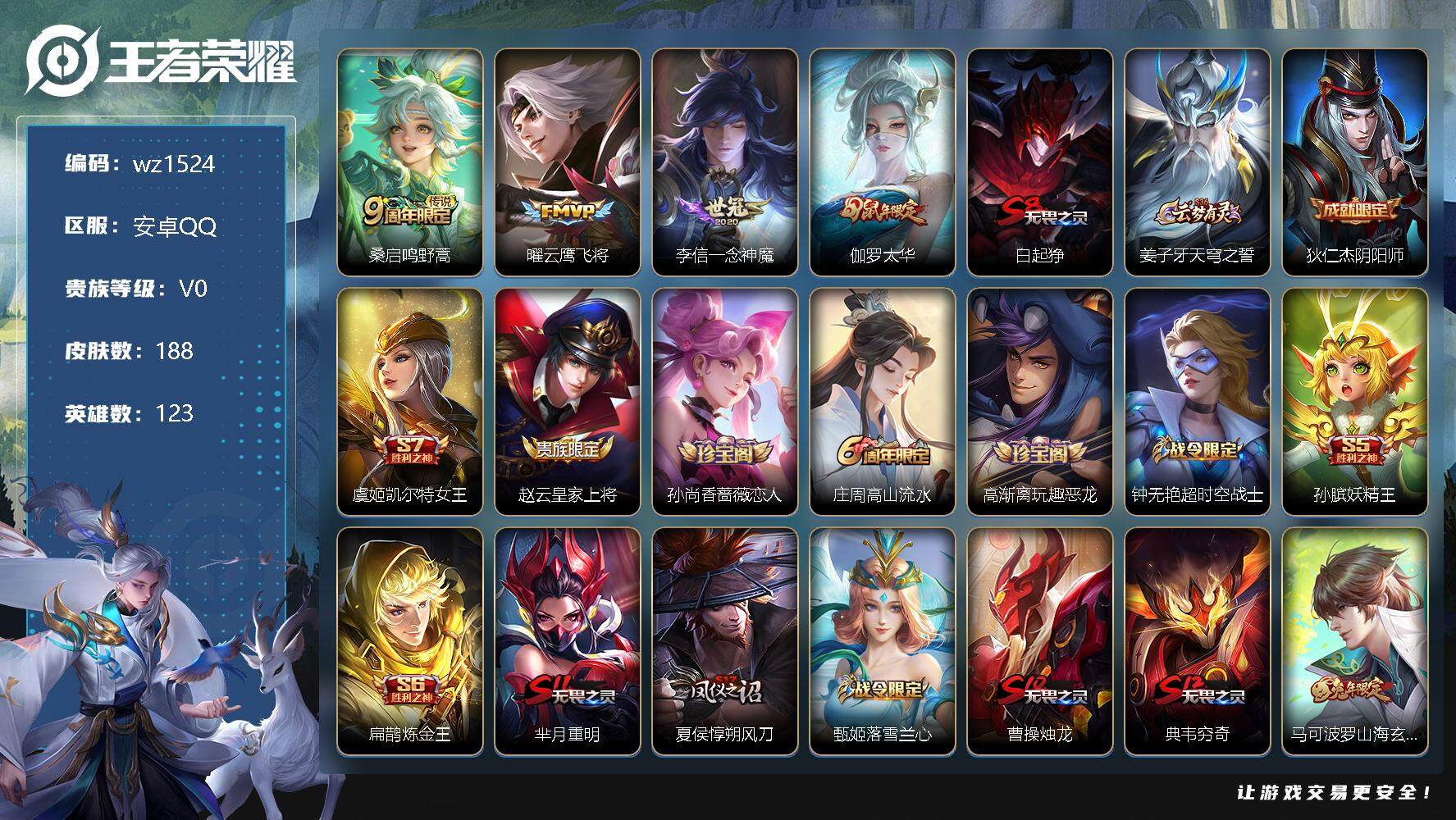 【游戏多多】 【可二次实名】【wz1524】【商品标题】:安卓Q-V0-最强王者段位-123英雄-188皮肤-0典藏-0珍品无双-0无双-0珍品传说-4传说-55史诗 【传说皮肤】:桑启鸣野蒿,曜云鹰飞将,李信一念神魔,伽罗太华 【限定皮肤】:白起狰,姜子牙天穹之誓,狄仁杰阴阳师,虞姬凯尔特女王,赵云皇家上将,孙尚香蔷薇恋人,庄周高山流水,高渐离玩趣恶龙,钟无艳超时空战士,孙膑妖精王,扁鹊炼金王,芈月重明,夏侯惇朔风刀,甄姬落雪兰心,曹操烛龙,典韦穷奇,马可波罗山海玄木吟,狄仁杰魔术师,狄仁杰万华元夜,达摩沙漠行僧,项羽海滩派对,老夫子醍醐杖,程咬金演武夺筹,韩信傲雪梅枪,王昭君午后时光,兰陵王金庭之子,牛魔御旌,李元芳银河之约,李元芳云中旅人,钟馗驱傩正仪,雅典娜黎明之约,太乙真人饕餮,鬼谷子原初探秘者,鬼谷子五谷丰年,苏烈千军破阵,弈星混沌棋,梦奇顽趣,沈梦溪星空之诺,沈梦溪大漠名商,明世隐疑决卦,裴擒虎李小龙,裴擒虎擒涛扼浪,狂铁御狮,狂铁电玩高手,云中君纤云弄巧,伽罗太华,盾山御銮,上官婉儿梁祝,嫦娥拒霜思,鲁班大师探海日志,桑启海盐诗旅,阿古朵江河有灵,张良古海寻踪,蒙犽百解令,鬼谷子天穹祈灯,沈梦溪龙舞盛年,刘邦剑破天穹,镜青焰无极,项羽苍威无极,周瑜熔金海岸 【年限皮肤】:伽罗太华,马可波罗山海玄木吟 【赛季限定】:孙膑妖精王,扁鹊炼金王,白起狰,芈月重明,夏侯惇朔风刀,曹操烛龙,典韦穷奇,狄仁杰万华元夜,达摩沙漠行僧,老夫子醍醐杖,程咬金演武夺筹,兰陵王金庭之子,张良古海寻踪,牛魔御旌,李元芳云中旅人,虞姬凯尔特女王,钟馗驱傩正仪,雅典娜黎明之约,太乙真人饕餮,鬼谷子原初探秘者,苏烈千军破阵,弈星混沌棋,梦奇顽趣,沈梦溪大漠名商,明世隐疑决卦,裴擒虎擒涛扼浪,狂铁御狮,盾山御銮,鲁班大师探海日志,桑启海盐诗旅,鬼谷子天穹祈灯,刘邦剑破天穹,姜子牙天穹之誓 【战令限定】:钟无艳超时空战士,甄姬落雪兰心,王昭君午后时光,李元芳银河之约,沈梦溪星空之诺,狂铁电玩高手,镜青焰无极,项羽苍威无极 【史诗皮肤】:鲁班七号电玩小子,露娜紫霞仙子,赵云皇家上将,赵云未来纪元,甄姬冰雪圆舞曲,王昭君偶像歌手,狄仁杰魔术师,廉颇地狱岩魂,宫本武藏鬼剑武藏,孙尚香蔷薇恋人,孙尚香水果甜心,妲己魅力维加斯,妲己女仆咖啡,墨子金属风暴,吕布圣诞狂欢,曹操幽灵船长,李白千年之狐,吕布末日机甲,韩信白龙吟,花木兰水晶猎龙者,刘邦德古拉伯爵,夏侯惇乘风破浪,小乔缤纷独角兽,兰陵王暗隐猎兽者,诸葛亮黄金分割率,雅典娜冰冠公主,安琪拉心灵骇客,百里守约特工魅影,铠曙光守护者,李元芳逐浪之夏,程咬金功夫厨神,白起星夜王子,阿轲节奏热浪,孙策猫狗日记,狄仁杰鹰眼统帅,公孙离无限星赏官,上官婉儿梁祝,李元芳银河之约,孙尚香时之恋人,裴擒虎李小龙,云中君纤云弄巧,庄周高山流水,嫦娥拒霜思,雅典娜黎明之约,韩信傲雪梅枪,狂铁电玩高手,钟无艳超时空战士,鬼谷子五谷丰年,梦奇顽趣,马可波罗山海玄木吟,刘禅电玩爆裂旋风,阿古朵江河有灵,蒙犽百解令,镜青焰无极,黄忠百相守梦 【其他皮肤】:项羽海滩派对,韩信教廷特使,韩信街头霸王,露娜哥特玫瑰,阿轲爱心护理,达摩大发明家,赵云忍炎影,白起白色死神,扁鹊化身博士,扁鹊救世之瞳,宫本武藏未来纪元,安琪拉玩偶对对碰,孙膑天使之翼,典韦黄金武士,亚瑟死亡骑士,花木兰兔女郎,张飞五福同心,甄姬花好人间,宫本武藏万象初新,狄仁杰阴阳师,刘备纽约教父,孙膑妖精王,扁鹊炼金王,关羽龙腾万里,虞姬凯尔特女王,白起狰,钟无艳海滩丽影,太乙真人饕餮,宫本武藏霸王丸,曹操烛龙,芈月重明,狂铁命运角斗场,老夫子功夫老勺,典韦穷奇,李白敏锐之力,狂铁御狮,安琪拉如懿,苏烈坚韧之力,大乔守护之力,明世隐虹云星官,牛魔御旌,小乔丁香结,吕布野性能量,盾山御銮,高渐离玩趣恶龙,姜子牙炽热元素使,夏侯惇朔风刀,沈梦溪星空之诺,弈星混沌棋,哪吒次元突破,明世隐疑决卦,老夫子醍醐杖,狂铁特工战影,鬼谷子原初探秘者,狄仁杰万华元夜,刘禅秘密基地,程咬金演武夺筹,张良缤纷绘卷,钟馗驱傩正仪,鲁班大师乓乓大师,苏烈千军破阵,达摩沙漠行僧,程咬金无双福将,兰陵王金庭之子,刘禅唤灵魔甲,王昭君午后时光,沈梦溪大漠名商,蒙恬蔚蓝守将,甄姬落雪兰心,李元芳云中旅人,桑启海盐诗旅,猪八戒潮玩探月行,白起乐园追猎者,裴擒虎擒涛扼浪,太乙真人劲辣红锅,鲁班大师探海日志,姬小满零食大作战,李元芳妄想特派,张良古海寻踪,后羿完美运算,鬼谷子天穹祈灯,廉颇功夫炙烤,沈梦溪龙舞盛年,钟无艳春野之旅,刘邦剑破天穹,项羽苍威无极,姜子牙天穹之誓,周瑜熔金海岸,苍苍林狼骑,太乙真人谧流熔炉,典韦铁骨偃魂,姜子牙星梦巡礼,钟馗虚灵犬护,张良灵野札记,阿古朵布丁狗之约,白起死霸装,甄姬逆浪荇歌,莱西奥踏浪烽翎,鬼谷