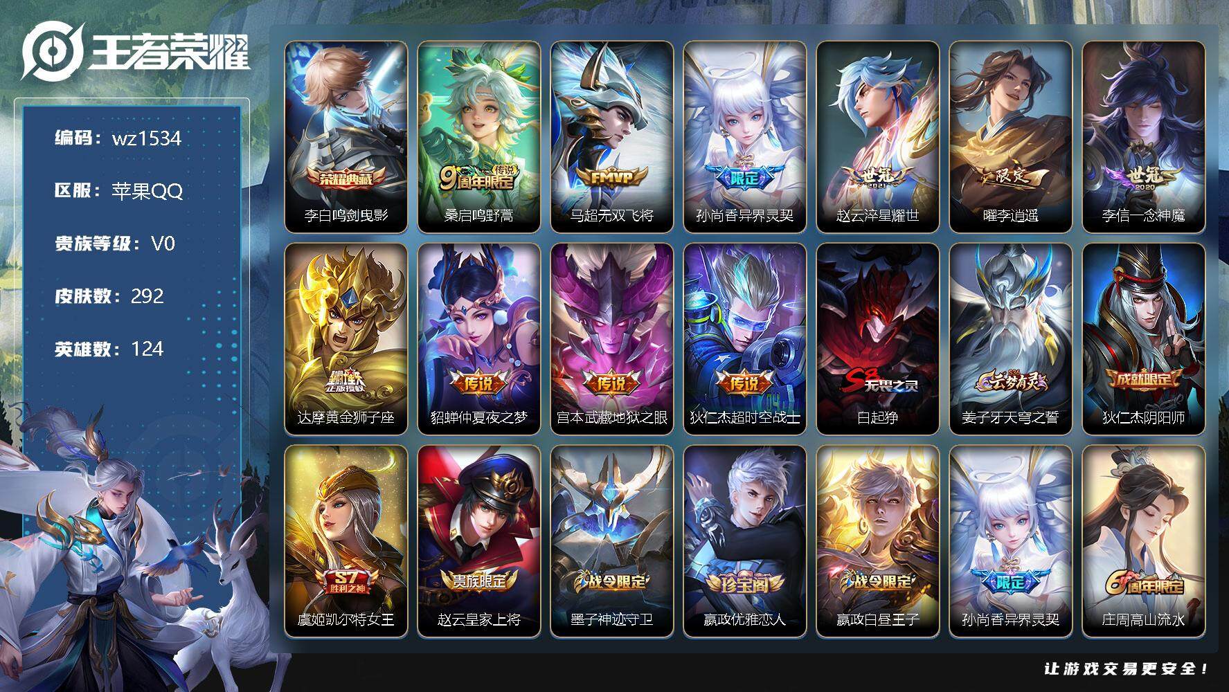 【游戏多多】 【可二次实名】【wz1542】【商品标题】:苹果Q-V9-最强王者段位-124英雄-290皮肤-2典藏-0珍品无双-0无双-0珍品传说-22传说-83史诗 【荣耀典藏】:夏侯惇无限飓风号,花木兰九霄神辉 【传说皮肤】:司空震愿照山河定,桑启鸣野蒿,孙悟空齐天大圣,曜山海苍雷引,李信山海炽霜斩,橘右京枫霜尽,孙尚香音你闪耀,马可波罗深海之息,周瑜音你心动,虞姬启明星使,刘备时之恋人,干将莫邪久胜战神,百里玄策白虎志,花木兰冠军飞将,后羿黄金射手座,诸葛亮武陵仙君,貂蝉仲夏夜之梦,孙尚香末日机甲,宫本武藏地狱之眼,孙悟空地狱火,吕布天魔缭乱,狄仁杰超时空战士 【限定皮肤】:白起狰,姜子牙天穹之誓,李白谪仙醉月,狄仁杰阴阳师,赵云皇家上将,赵云百木心枪,墨子神迹守卫,嬴政白昼王子,庄周高山流水,高渐离死亡摇滚,白起夜都怪侠,芈月重明,吕布天魔缭乱,吕布猎兽之王,元歌云间偶戏,元歌无心,夏侯惇朔风刀,甄姬游园惊梦,曹操烛龙,典韦穷奇,马可波罗逐梦之星,马可波罗暗影游猎,马可波罗深海之息,马可波罗山海玄木吟,狄仁杰魔术师,狄仁杰万华元夜,达摩沙漠行僧,项羽海滩派对,老夫子醍醐杖,老夫子航海奇遇记,关羽冰锋战神,程咬金演武夺筹,露娜一生所爱,韩信逐梦之影,韩信飞衡,兰陵王金庭之子,花木兰青春决赛季,橘右京枫霜尽,亚瑟潮玩骑士王,孙悟空大圣娶亲,孙悟空孙行者,孙悟空齐天大圣,牛魔御旌,后羿辉光之辰,李元芳云中旅人,虞姬启明星使,钟馗驱傩正仪,干将莫邪冰霜恋舞曲,雅典娜单词大作战,雅典娜黎明之约,蔡文姬繁星吟游,太乙真人饕餮,东皇太一逐梦之光,鬼谷子原初探秘者,诸葛亮武陵仙君,苏烈千军破阵,百里玄策白虎志,百里玄策原初追逐者,百里守约朱雀志,弈星混沌棋,沈梦溪大漠名商,明世隐疑决卦,裴擒虎天狼狩猎者,裴擒虎李小龙,裴擒虎擒涛扼浪,狂铁御狮,米莱狄御霄,云中君纤云弄巧,李信山海炽霜斩,盾山御銮,猪八戒西部大镖客,嫦娥暖冬兔眠,曜山海苍雷引,蒙犽狂想玩偶喵,鲁班大师探海日志,桑启海盐诗旅,暃星界游侠,艾琳女武神,阿古朵江河有灵,张良古海寻踪,裴擒虎梅西,蒙恬荣光圣徽,姬小满妄想食味 【年限皮肤】:百里玄策白虎志,百里守约朱雀志,后羿辉光之辰,韩信飞衡,马超神威,马可波罗山海玄木吟,李信山海炽霜斩,曜山海苍雷引 【赛季限定】:白起狰,芈月重明,夏侯惇朔风刀,曹操烛龙,典韦穷奇,狄仁杰万华元夜,达摩沙漠行僧,老夫子醍醐杖,程咬金演武夺筹,兰陵王金庭之子,张良古海寻踪,牛魔御旌,李元芳云中旅人,钟馗驱傩正仪,雅典娜黎明之约,太乙真人饕餮,鬼谷子原初探秘者,苏烈千军破阵,百里玄策原初追逐者,弈星混沌棋,沈梦溪大漠名商,明世隐疑决卦,裴擒虎擒涛扼浪,狂铁御狮,米莱狄御霄,盾山御銮,鲁班大师探海日志,桑启海盐诗旅,蒙恬荣光圣徽,姜子牙天穹之誓 【战令限定】:墨子神迹守卫,嬴政白昼王子,白起夜都怪侠,吕布猎兽之王,元歌云间偶戏,马可波罗暗影游猎,老夫子航海奇遇记,亚瑟潮玩骑士王,雅典娜单词大作战,猪八戒西部大镖客,嫦娥暖冬兔眠,蒙犽狂想玩偶喵,暃星界游侠 【史诗皮肤】:鲁班七号电玩小子,项羽苍穹之光,露娜紫霞仙子,赵云皇家上将,赵云未来纪元,貂蝉圣诞恋歌,甄姬冰雪圆舞曲,王昭君偶像歌手,狄仁杰魔术师,廉颇地狱岩魂,宫本武藏鬼剑武藏,孙尚香水果甜心,嬴政暗夜贵公子,嬴政摇滚巨星,妲己魅力维加斯,妲己女仆咖啡,墨子龙骑士,墨子金属风暴,吕布圣诞狂欢,曹操幽灵船长,李白千年之狐,吕布末日机甲,张飞乱世虎臣,韩信白龙吟,关羽冰锋战神,花木兰水晶猎龙者,刘邦德古拉伯爵,韩信逐梦之影,夏侯惇乘风破浪,小乔缤纷独角兽,兰陵王暗隐猎兽者,诸葛亮黄金分割率,甄姬游园惊梦,马可波罗逐梦之星,亚瑟心灵战警,雅典娜冰冠公主,安琪拉心灵骇客,后羿辉光之辰,花木兰青春决赛季,百里守约特工魅影,铠曙光守护者,蔡文姬舞动绿茵,裴擒虎梅西,刘禅天才门将,李元芳逐浪之夏,程咬金功夫厨神,白起星夜王子,阿轲节奏热浪,东皇太一逐梦之光,嬴政白昼王子,百里守约朱雀志,干将莫邪冰霜恋舞曲,露娜一生所爱,孙悟空大圣娶亲,伽罗箭羽风息,裴擒虎天狼狩猎者,狄仁杰鹰眼统帅,蔡文姬繁星吟游,韩信飞衡,不知火舞魅语,马超神威,马可波罗暗影游猎,蒙犽狂想玩偶喵,百里玄策原初追逐者,裴擒虎李小龙,云中君纤云弄巧,元歌云间偶戏,老夫子航海奇遇记,杨戬天秀启明,沈梦溪月团寄思,孙悟空孙行者,庄周高山流水,雅典娜黎明之约,赵云百木心枪,元歌无心,暃星界游侠,马可波罗山海玄木吟,刘禅电玩爆裂旋风,阿古朵江河有灵,蒙恬荣光圣徽,姬小满妄想食味,李白谪仙醉月,黄忠百相守梦 【其他皮肤】:项羽海滩派对,韩信教廷特使,韩信街头霸王,露娜哥特玫瑰,阿轲爱心护理,达摩大发明家,赵云白执事,赵云忍炎影,艾琳女武神,程咬金爱与正义,白起白色死神,牛魔西