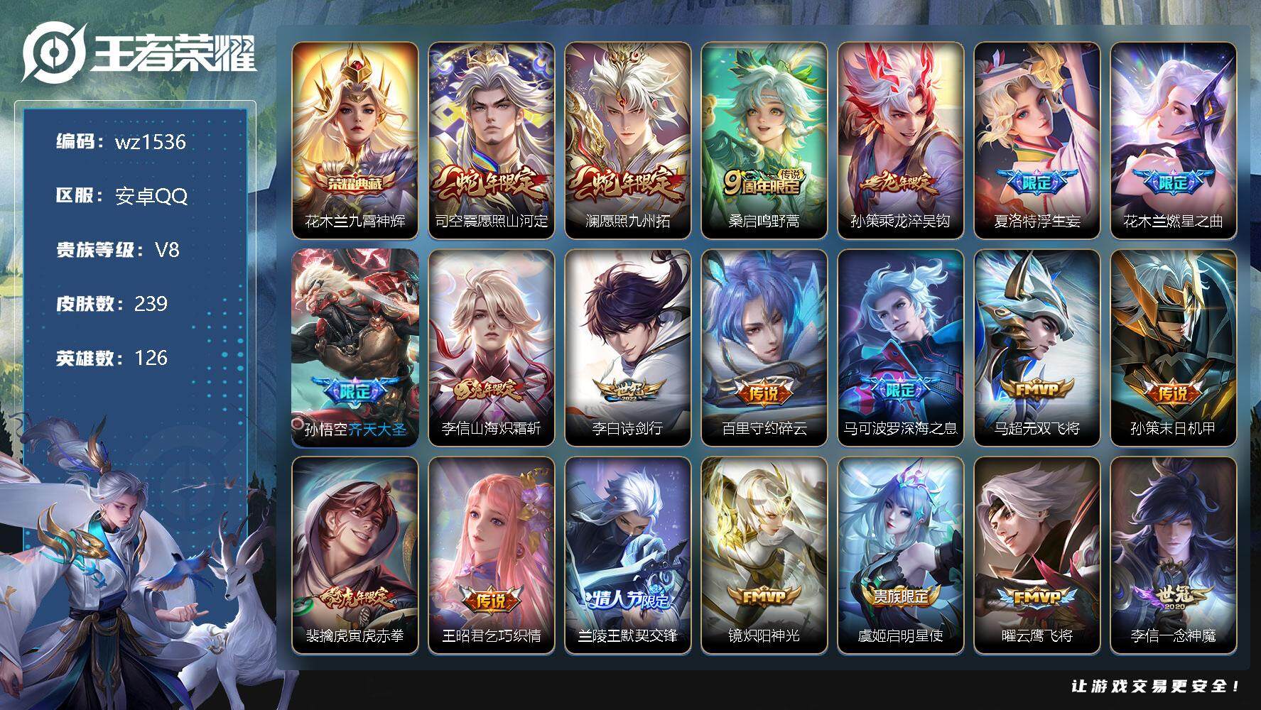 【游戏多多】 【可二次实名】【wz1536】【商品标题】:安卓Q-V8-永恒钻石IV段位-126英雄-239皮肤-1典藏-0珍品无双-0无双-0珍品传说-24传说-54史诗 【英雄全皮】:李信全皮 【荣耀典藏】:花木兰九霄神辉 【传说皮肤】:司空震愿照山河定,澜愿照九州拓,桑启鸣野蒿,孙策乘龙淬吴钩,夏洛特浮生妄,花木兰燃星之曲,孙悟空齐天大圣,李信山海炽霜斩,李白诗剑行,百里守约碎云,马可波罗深海之息,马超无双飞将,孙策末日机甲,裴擒虎寅虎赤拳,王昭君乞巧织情,兰陵王默契交锋,镜炽阳神光,虞姬启明星使,曜云鹰飞将,李信一念神魔,刘备时之恋人,干将莫邪久胜战神,达摩黄金狮子座,孙悟空地狱火 【限定皮肤】:姜子牙天穹之誓,李白谪仙醉月,狄仁杰阴阳师,赵云皇家上将,庄周高山流水,高渐离玩趣恶龙,元歌云间偶戏,元歌无心,马可波罗深海之息,狄仁杰魔术师,狄仁杰万华元夜,达摩沙漠行僧,项羽海滩派对,老夫子醍醐杖,关羽百相守梦,程咬金演武夺筹,兰陵王默契交锋,兰陵王金庭之子,花木兰瑞麟志,花木兰默契交锋,花木兰燃星之曲,孙悟空至尊宝,孙悟空齐天大圣,李元芳云中旅人,虞姬启明星使,钟馗驱傩正仪,鬼谷子原初探秘者,鬼谷子五谷丰年,苏烈千军破阵,百里守约朱雀志,沈梦溪大漠名商,裴擒虎李小龙,裴擒虎寅虎赤拳,裴擒虎擒涛扼浪,云中君纤云弄巧,李信山海炽霜斩,猪八戒猪悟能,上官婉儿梁祝,嫦娥暖冬兔眠,西施玲珑珍味,鲁班大师探海日志,桑启海盐诗旅,夏洛特浮生妄,暃星界游侠,戈娅驭风魔法,阿古朵江河有灵,张良古海寻踪,鬼谷子天穹祈灯,姬小满妄想食味,孙策乘龙淬吴钩,沈梦溪龙舞盛年,刘邦剑破天穹,程咬金群星魔术团,周瑜熔金海岸 【年限皮肤】:百里守约朱雀志,花木兰瑞麟志,裴擒虎寅虎赤拳,李信山海炽霜斩,孙策乘龙淬吴钩 【赛季限定】:狄仁杰万华元夜,达摩沙漠行僧,老夫子醍醐杖,程咬金演武夺筹,兰陵王金庭之子,张良古海寻踪,李元芳云中旅人,钟馗驱傩正仪,鬼谷子原初探秘者,苏烈千军破阵,沈梦溪大漠名商,裴擒虎擒涛扼浪,鲁班大师探海日志,桑启海盐诗旅,鬼谷子天穹祈灯,刘邦剑破天穹,姜子牙天穹之誓 【战令限定】:元歌云间偶戏,嫦娥暖冬兔眠,西施玲珑珍味,暃星界游侠,戈娅驭风魔法 【史诗皮肤】:露娜紫霞仙子,赵云皇家上将,甄姬冰雪圆舞曲,王昭君偶像歌手,狄仁杰魔术师,廉颇地狱岩魂,宫本武藏鬼剑武藏,孙尚香水果甜心,嬴政暗夜贵公子,墨子龙骑士,墨子金属风暴,曹操幽灵船长,吕布末日机甲,张飞乱世虎臣,孙悟空至尊宝,花木兰水晶猎龙者,刘邦德古拉伯爵,夏侯惇乘风破浪,诸葛亮黄金分割率,百里守约特工魅影,铠曙光守护者,蔡文姬舞动绿茵,李元芳逐浪之夏,程咬金功夫厨神,白起星夜王子,孙策猫狗日记,百里守约朱雀志,花木兰瑞麟志,狄仁杰鹰眼统帅,上官婉儿梁祝,小乔青蛇,不知火舞魅语,橘右京修罗,裴擒虎李小龙,云中君纤云弄巧,元歌云间偶戏,花木兰默契交锋,钟馗乐园奇幻夜,猪八戒猪悟能,庄周高山流水,澜赏金猎手,鬼谷子五谷丰年,元歌无心,暃星界游侠,关羽百相守梦,刘禅电玩爆裂旋风,戈娅驭风魔法,阿古朵江河有灵,姬小满妄想食味,亚连破空之剑,李白谪仙醉月,弈星万物之道,赵怀真器灵浮梦炉,黄忠百相守梦 【其他皮肤】:项羽海滩派对,韩信教廷特使,韩信街头霸王,露娜哥特玫瑰,阿轲爱心护理,达摩大发明家,赵云白执事,赵云忍炎影,芈月红桃皇后,程咬金星际陆战队,白起白色死神,牛魔西部大镖客,扁鹊化身博士,扁鹊救世之瞳,宫本武藏未来纪元,安琪拉玩偶对对碰,姜子牙时尚教父,妲己少女阿狸,典韦黄金武士,亚瑟死亡骑士,达摩拳王,花木兰兔女郎,张飞五福同心,甄姬花好人间,刘备万事如意,宫本武藏万象初新,后羿阿尔法小队,狄仁杰阴阳师,刘备纽约教父,刘备汉昭烈帝,关羽龙腾万里,钟无艳海滩丽影,王昭君幻想奇妙夜,狂铁命运角斗场,老夫子功夫老勺,孙尚香沉稳之力,诸葛亮掌控之力,李白敏锐之力,鬼谷子幻乐之宴,苏烈坚韧之力,大乔守护之力,项羽科学大爆炸,明世隐虹云星官,小乔丁香结,孙膑归虚梦演,高渐离玩趣恶龙,沈梦溪鲨炮海盗猫,姜子牙炽热元素使,哪吒次元突破,老夫子醍醐杖,狂铁特工战影,鬼谷子原初探秘者,狄仁杰万华元夜,刘禅秘密基地,程咬金演武夺筹,张良缤纷绘卷,钟馗驱傩正仪,鲁班大师乓乓大师,苏烈千军破阵,达摩沙漠行僧,程咬金无双福将,兰陵王金庭之子,沈梦溪大漠名商,蒙犽胡桃狂想曲,蒙恬蔚蓝守将,李元芳云中旅人,桑启海盐诗旅,嫦娥暖冬兔眠,海月幻泉雾影,猪八戒潮玩探月行,赵怀真太极少年,裴擒虎擒涛扼浪,太乙真人劲辣红锅,鲁班大师探海日志,西施玲珑珍味,姬小满零食大作战,李元芳妄想特派,张良古海寻踪,钟无艳聚星闪耀,后羿完美运算,鬼谷子天穹祈灯,嫦娥漠中幻影,廉颇功夫炙烤,沈梦溪龙舞盛年,刘邦剑破天穹,程咬金群星魔术团,姜子牙天穹之誓,周瑜熔金海