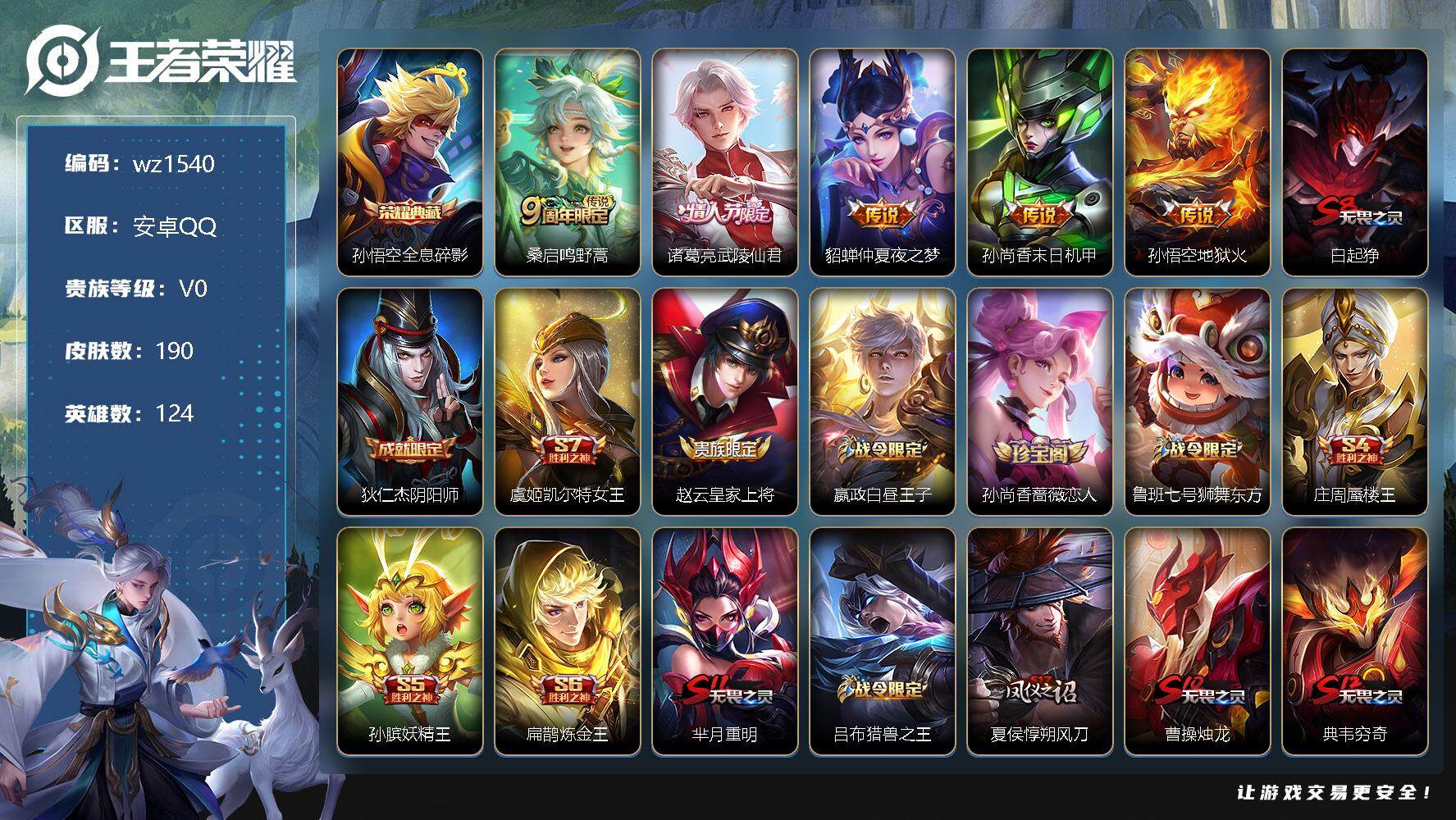 【游戏多多】 【可二次实名】【wz1540】【商品标题】:安卓Q-V0-至尊星耀III段位-124英雄-190皮肤-1典藏-0珍品无双-0无双-0珍品传说-5传说-41史诗 【英雄全皮】:鬼谷子全皮 【荣耀典藏】:孙悟空全息碎影 【传说皮肤】:桑启鸣野蒿,诸葛亮武陵仙君,貂蝉仲夏夜之梦,孙尚香末日机甲,孙悟空地狱火 【限定皮肤】:白起狰,狄仁杰阴阳师,虞姬凯尔特女王,赵云皇家上将,嬴政白昼王子,孙尚香蔷薇恋人,鲁班七号狮舞东方,庄周蜃楼王,孙膑妖精王,扁鹊炼金王,芈月重明,吕布猎兽之王,夏侯惇朔风刀,曹操烛龙,典韦穷奇,典韦蓝屏警告,狄仁杰魔术师,狄仁杰万华元夜,达摩沙漠行僧,项羽海滩派对,老夫子醍醐杖,关羽冰锋战神,程咬金演武夺筹,露娜一生所爱,兰陵王金庭之子,花木兰青春决赛季,孙悟空美猴王,孙悟空大圣娶亲,牛魔御旌,李元芳云中旅人,钟馗神迹守卫,钟馗驱傩正仪,杨玉环遇见飞天,女娲朔望之晖,哪吒逐梦之翼,太乙真人饕餮,鬼谷子原初探秘者,鬼谷子五谷丰年,诸葛亮武陵仙君,弈星混沌棋,沈梦溪大漠名商,明世隐疑决卦,裴擒虎天狼狩猎者,裴擒虎李小龙,裴擒虎擒涛扼浪,狂铁御狮,米莱狄御霄,盾山御銮,上官婉儿梁祝,鲁班大师探海日志,桑启海盐诗旅,阿古朵江河有灵,张良古海寻踪,鬼谷子天穹祈灯,刘邦剑破天穹,程咬金群星魔术团 【年限皮肤】:孙悟空美猴王 【赛季限定】:庄周蜃楼王,孙膑妖精王,扁鹊炼金王,白起狰,芈月重明,夏侯惇朔风刀,曹操烛龙,典韦穷奇,狄仁杰万华元夜,达摩沙漠行僧,老夫子醍醐杖,程咬金演武夺筹,兰陵王金庭之子,张良古海寻踪,牛魔御旌,李元芳云中旅人,虞姬凯尔特女王,钟馗驱傩正仪,太乙真人饕餮,鬼谷子原初探秘者,弈星混沌棋,沈梦溪大漠名商,明世隐疑决卦,裴擒虎擒涛扼浪,狂铁御狮,米莱狄御霄,盾山御銮,鲁班大师探海日志,桑启海盐诗旅,鬼谷子天穹祈灯,刘邦剑破天穹 【战令限定】:嬴政白昼王子,鲁班七号狮舞东方,吕布猎兽之王,典韦蓝屏警告,钟馗神迹守卫,女娲朔望之晖 【史诗皮肤】:露娜紫霞仙子,赵云皇家上将,赵云未来纪元,甄姬冰雪圆舞曲,王昭君偶像歌手,狄仁杰魔术师,宫本武藏鬼剑武藏,孙尚香蔷薇恋人,孙尚香水果甜心,墨子金属风暴,刘禅绅士熊喵,曹操幽灵船长,李白千年之狐,吕布末日机甲,韩信白龙吟,关羽冰锋战神,花木兰水晶猎龙者,刘邦德古拉伯爵,小乔缤纷独角兽,诸葛亮黄金分割率,雅典娜冰冠公主,花木兰青春决赛季,百里守约特工魅影,哪吒逐梦之翼,阿轲节奏热浪,杨玉环遇见飞天,嬴政白昼王子,露娜一生所爱,孙悟空大圣娶亲,典韦蓝屏警告,裴擒虎天狼狩猎者,鲁班七号狮舞东方,狄仁杰鹰眼统帅,上官婉儿梁祝,裴擒虎李小龙,鬼谷子五谷丰年,阿古朵江河有灵,弈星万物之道,阿轲化蝶舞,后羿石田雨龙,黄忠百相守梦 【其他皮肤】:项羽海滩派对,韩信教廷特使,韩信街头霸王,赵云忍炎影,芈月红桃皇后,扁鹊化身博士,妲己少女阿狸,典韦黄金武士,达摩拳王,孙悟空美猴王,花木兰兔女郎,张飞五福同心,宫本武藏万象初新,后羿阿尔法小队,狄仁杰阴阳师,庄周蜃楼王,刘备纽约教父,孙膑妖精王,刘备汉昭烈帝,扁鹊炼金王,关羽龙腾万里,虞姬凯尔特女王,白起狰,钟无艳海滩丽影,太乙真人饕餮,宫本武藏霸王丸,曹操烛龙,王昭君幻想奇妙夜,芈月重明,老夫子功夫老勺,孙尚香沉稳之力,典韦穷奇,诸葛亮掌控之力,李白敏锐之力,鬼谷子幻乐之宴,狂铁御狮,安琪拉如懿,苏烈坚韧之力,大乔守护之力,项羽科学大爆炸,米莱狄御霄,吕布猎兽之王,明世隐虹云星官,庄周奇妙博物学,牛魔御旌,女娲朔望之晖,小乔丁香结,钟馗神迹守卫,盾山御銮,孙膑归虚梦演,沈梦溪鲨炮海盗猫,夏侯惇朔风刀,弈星混沌棋,哪吒次元突破,明世隐疑决卦,老夫子醍醐杖,狂铁特工战影,鬼谷子原初探秘者,狄仁杰万华元夜,刘禅秘密基地,程咬金演武夺筹,钟馗驱傩正仪,达摩沙漠行僧,程咬金无双福将,兰陵王金庭之子,沈梦溪大漠名商,李元芳云中旅人,桑启海盐诗旅,海月幻泉雾影,猪八戒潮玩探月行,裴擒虎擒涛扼浪,莱西奥西部游侠,鲁班大师探海日志,李元芳妄想特派,张良古海寻踪,亚连破局者,鬼谷子天穹祈灯,嫦娥漠中幻影,廉颇功夫炙烤,刘邦剑破天穹,程咬金群星魔术团,盘古敬我三分,姜子牙星梦巡礼,戈娅玫蓝誓约,苏烈春野闲踪,阿古朵布丁狗之约,露娜命运加冕,白起死霸装,甄姬逆浪荇歌,云中君云械蓝图,庄周锦麟游梦,莱西奥踏浪烽翎,鬼谷子克喵,鲁班七号木偶奇遇记,高渐离金属狂潮,钟无艳生化警戒,貂蝉异域舞娘,花木兰剑舞者,狄仁杰锦衣卫,曹操死神来了,小乔万圣前夜,孙膑未来旅行,孙悟空西部大镖客,周瑜海军大将,后羿精灵王,刘禅英喵野望,兰陵王隐刃,李白范海辛,钟馗地府判官,李元芳特种部队,虞姬加勒比小姐,关羽天启骑士,夏侯惇战争骑士,杨戬埃及法老,太乙真人圆桌骑士,哪吒三太子,诸葛亮星航指挥官,黄