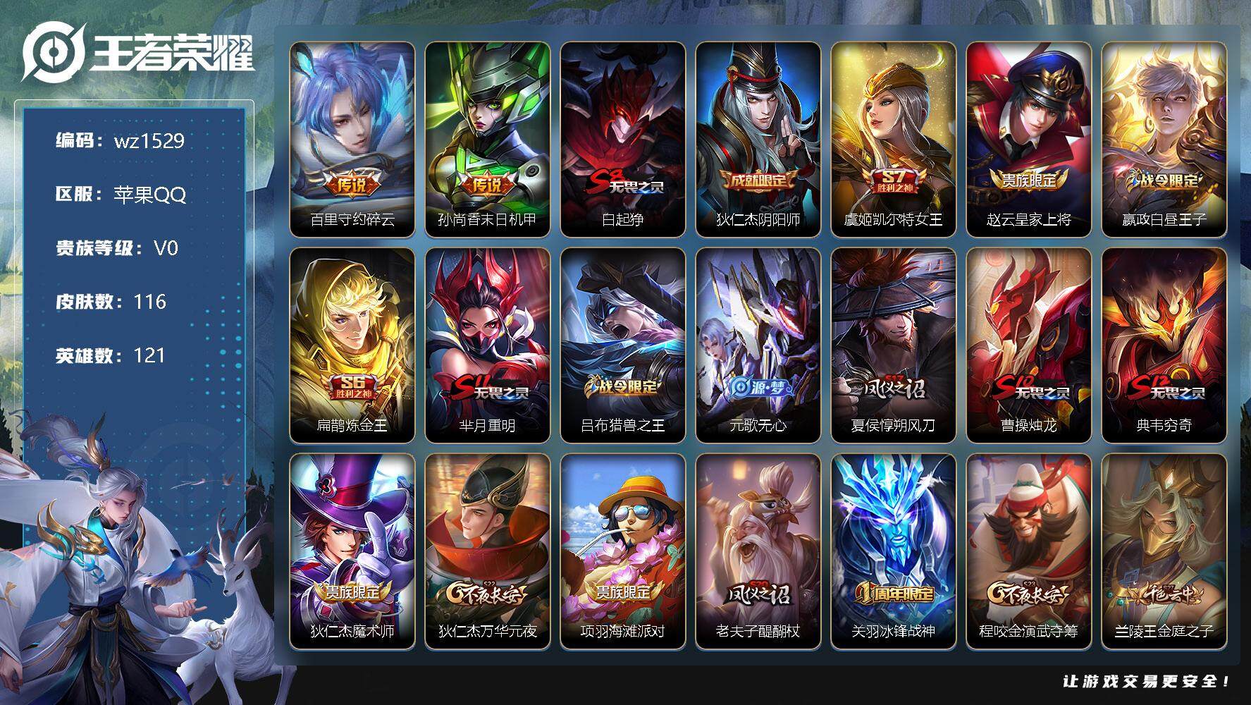 【游戏多多】 【可二次实名】【wz1529】【商品标题】:苹果Q-V0-至尊星耀V段位-121英雄-116皮肤-0典藏-0珍品无双-0无双-0珍品传说-2传说-22史诗 【传说皮肤】:百里守约碎云,孙尚香末日机甲 【限定皮肤】:白起狰,狄仁杰阴阳师,虞姬凯尔特女王,赵云皇家上将,嬴政白昼王子,扁鹊炼金王,芈月重明,吕布猎兽之王,元歌无心,夏侯惇朔风刀,曹操烛龙,典韦穷奇,狄仁杰魔术师,狄仁杰万华元夜,项羽海滩派对,老夫子醍醐杖,关羽冰锋战神,程咬金演武夺筹,兰陵王金庭之子,牛魔御旌,李元芳云中旅人,钟馗驱傩正仪,干将莫邪胡桃夹子,太乙真人饕餮,鬼谷子原初探秘者,鬼谷子五谷丰年,弈星混沌棋,沈梦溪大漠名商,沈梦溪匿光破解者,明世隐疑决卦,裴擒虎擒涛扼浪,狂铁御狮,米莱狄御霄,盾山御銮,上官婉儿梁祝,鲁班大师探海日志,桑启海盐诗旅,张良古海寻踪,鬼谷子天穹祈灯 【赛季限定】:扁鹊炼金王,白起狰,芈月重明,夏侯惇朔风刀,曹操烛龙,典韦穷奇,狄仁杰万华元夜,老夫子醍醐杖,程咬金演武夺筹,兰陵王金庭之子,张良古海寻踪,牛魔御旌,李元芳云中旅人,虞姬凯尔特女王,钟馗驱傩正仪,太乙真人饕餮,鬼谷子原初探秘者,弈星混沌棋,沈梦溪大漠名商,明世隐疑决卦,裴擒虎擒涛扼浪,狂铁御狮,米莱狄御霄,盾山御銮,鲁班大师探海日志,桑启海盐诗旅,鬼谷子天穹祈灯 【战令限定】:嬴政白昼王子,吕布猎兽之王 【史诗皮肤】:阿轲暗夜猫娘,赵云皇家上将,赵云未来纪元,貂蝉圣诞恋歌,狄仁杰魔术师,宫本武藏鬼剑武藏,孙尚香水果甜心,妲己魅力维加斯,吕布圣诞狂欢,韩信白龙吟,关羽冰锋战神,花木兰水晶猎龙者,刘邦德古拉伯爵,夏侯惇乘风破浪,兰陵王暗隐猎兽者,嬴政白昼王子,狄仁杰鹰眼统帅,上官婉儿梁祝,鬼谷子五谷丰年,元歌无心,沈梦溪匿光破解者,刘禅电玩爆裂旋风 【其他皮肤】:项羽海滩派对,韩信教廷特使,韩信街头霸王,阿轲爱心护理,赵云忍炎影,扁鹊化身博士,妲己少女阿狸,典韦黄金武士,亚瑟死亡骑士,张飞五福同心,刘备万事如意,宫本武藏万象初新,狄仁杰阴阳师,刘备纽约教父,扁鹊炼金王,关羽龙腾万里,虞姬凯尔特女王,白起狰,钟无艳海滩丽影,太乙真人饕餮,曹操烛龙,芈月重明,典韦穷奇,狂铁御狮,苏烈坚韧之力,项羽科学大爆炸,米莱狄御霄,吕布猎兽之王,明世隐虹云星官,庄周奇妙博物学,牛魔御旌,小乔丁香结,吕布野性能量,盾山御銮,孙膑归虚梦演,姜子牙炽热元素使,夏侯惇朔风刀,弈星混沌棋,哪吒次元突破,鲁班七号黑桃队长,明世隐疑决卦,盾山圆桌骑士,老夫子醍醐杖,鬼谷子原初探秘者,狄仁杰万华元夜,杨戬次元傲视,程咬金演武夺筹,张良缤纷绘卷,钟馗驱傩正仪,干将莫邪胡桃夹子,兰陵王金庭之子,沈梦溪大漠名商,蒙恬蔚蓝守将,李元芳云中旅人,桑启海盐诗旅,猪八戒潮玩探月行,裴擒虎擒涛扼浪,太乙真人劲辣红锅,鲁班大师探海日志,李元芳妄想特派,张良古海寻踪,后羿完美运算,鬼谷子天穹祈灯,海诺时空谍影,廉颇功夫炙烤,东皇太一噬灭天穹,鲁班七号木偶奇遇记,露娜绯红之刃,花木兰剑舞者,曹操超能战警,孙悟空西部大镖客,后羿精灵王,李白范海辛,钟馗地府判官,关羽天启骑士,夏侯惇战争骑士,雅典娜战争女神,马可波罗激情绿茵,诸葛亮星航指挥官,干将莫邪第七人偶,铠龙域领主,百里守约绝影神枪,百里玄策威尼斯狂欢,苏烈爱与和平,元歌午夜歌剧院,李信灼热之刃,盘古创世神祝,曜归虚梦演,马超幸存者,蒙恬秩序猎龙将,云缨赤焰之缨,暃碧珀绯影 【内测皮肤】:干将莫邪胡桃夹子 【营地ID】:465030674