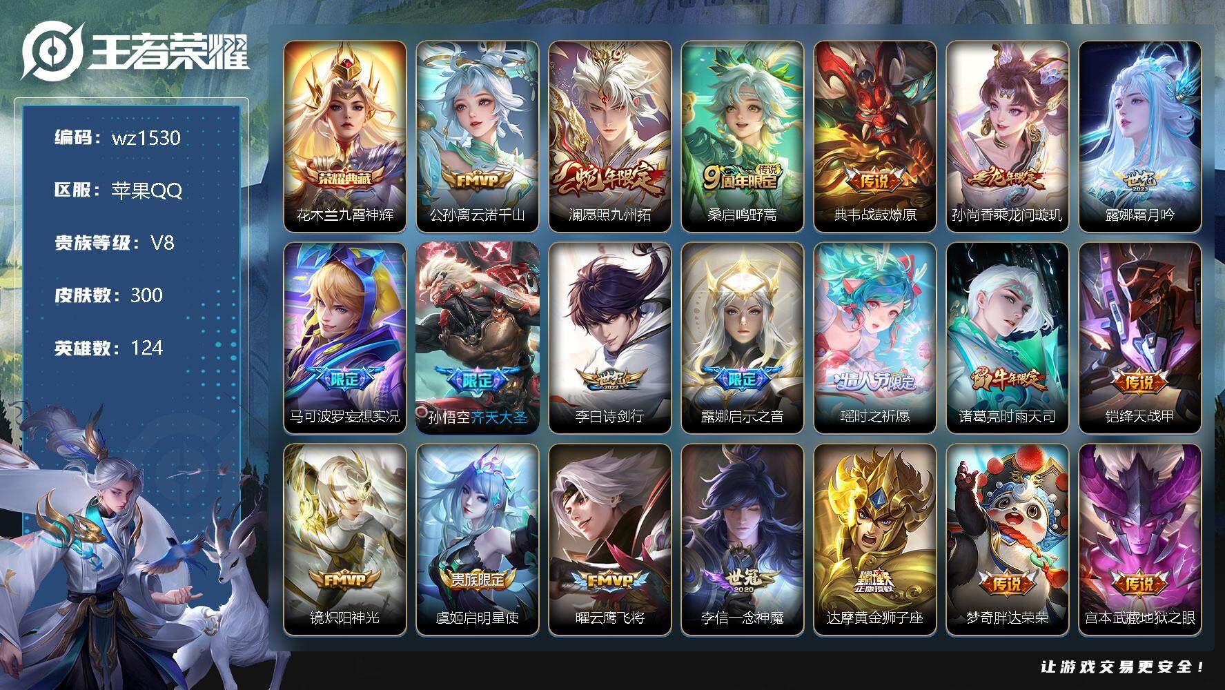【游戏多多】 【可二次实名】【wz1530】【商品标题】:苹果Q-V8-永恒钻石II段位-124英雄-300皮肤-1典藏-0珍品无双-0无双-0珍品传说-21传说-82史诗 【英雄全皮】:蒙恬全皮,戈娅全皮,海诺全皮 【荣耀典藏】:花木兰九霄神辉 【传说皮肤】:公孙离云诺千山,澜愿照九州拓,桑启鸣野蒿,典韦战鼓燎原,孙尚香乘龙问璇玑,露娜霜月吟,马可波罗妄想实况,孙悟空齐天大圣,李白诗剑行,露娜启示之音,瑶时之祈愿,诸葛亮时雨天司,铠绛天战甲,镜炽阳神光,虞姬启明星使,曜云鹰飞将,李信一念神魔,达摩黄金狮子座,梦奇胖达荣荣,宫本武藏地狱之眼,狄仁杰超时空战士 【限定皮肤】:暃埋骨钱,蒙犽顽岩魄,蔡文姬夏日便利店,大乔绒语心约,虞姬夏日便利店,姜子牙天穹之誓,李白谪仙醉月,狄仁杰阴阳师,赵云皇家上将,赵云百木心枪,扁鹊奇幻香踪,元歌无心,马可波罗暗影游猎,马可波罗妄想实况,狄仁杰魔术师,达摩沙漠行僧,项羽海滩派对,老夫子航海奇遇记,关羽冰锋战神,关羽百相守梦,露娜启示之音,韩信傲雪梅枪,兰陵王驯魔猎人,孙悟空美猴王,孙悟空至尊宝,孙悟空孙行者,孙悟空齐天大圣,李元芳匿光侦查者,李元芳云中旅人,虞姬启明星使,杨戬潮玩骑兵,女娲朔望之晖,鬼谷子五谷丰年,诸葛亮时雨天司,沈梦溪大漠名商,裴擒虎李小龙,裴擒虎擒涛扼浪,瑶时之祈愿,云中君纤云弄巧,嫦娥拒霜思,嫦娥暖冬兔眠,西施玲珑珍味,蒙犽狂想玩偶喵,鲁班大师探海日志,桑启海盐诗旅,暃星界游侠,戈娅驭风魔法,艾琳流音漫舞,司空震地狱燃心,阿古朵江河有灵,张良古海寻踪,蒙犽百解令,蒙恬荣光圣徽,高渐离燃音魔法,妲己灵卜魔法,鬼谷子天穹祈灯,伽罗琥珀纪元,姬小满妄想食味,孙尚香乘龙问璇玑,百里玄策超元猎域,沈梦溪龙舞盛年,鲁班七号蔬乡物语,李元芳蔬乡物语,刘邦剑破天穹,程咬金群星魔术团,镜青焰无极,项羽苍威无极,海诺心动手记,刘备异域游侠,周瑜熔金海岸 【年限皮肤】:孙悟空美猴王,诸葛亮时雨天司,马超神威,孙尚香乘龙问璇玑 【赛季限定】:达摩沙漠行僧,张良古海寻踪,李元芳云中旅人,沈梦溪大漠名商,裴擒虎擒涛扼浪,鲁班大师探海日志,桑启海盐诗旅,鬼谷子天穹祈灯,蒙恬荣光圣徽,刘邦剑破天穹,姜子牙天穹之誓 【战令限定】:蔡文姬夏日便利店,虞姬夏日便利店,扁鹊奇幻香踪,马可波罗暗影游猎,老夫子航海奇遇记,兰陵王驯魔猎人,艾琳流音漫舞,杨戬潮玩骑兵,女娲朔望之晖,嫦娥暖冬兔眠,西施玲珑珍味,蒙犽狂想玩偶喵,司空震地狱燃心,暃星界游侠,戈娅驭风魔法,高渐离燃音魔法,妲己灵卜魔法,鲁班七号蔬乡物语,李元芳蔬乡物语,镜青焰无极,项羽苍威无极 【史诗皮肤】:鲁班七号电玩小子,露娜紫霞仙子,赵云皇家上将,赵云未来纪元,甄姬冰雪圆舞曲,王昭君偶像歌手,狄仁杰魔术师,宫本武藏鬼剑武藏,孙尚香水果甜心,嬴政摇滚巨星,妲己魅力维加斯,妲己女仆咖啡,墨子金属风暴,吕布末日机甲,关羽冰锋战神,孙悟空至尊宝,花木兰水晶猎龙者,刘邦德古拉伯爵,夏侯惇乘风破浪,小乔缤纷独角兽,兰陵王暗隐猎兽者,诸葛亮黄金分割率,亚瑟心灵战警,雅典娜冰冠公主,蔡文姬舞动绿茵,刘禅天才门将,李元芳逐浪之夏,程咬金功夫厨神,白起星夜王子,阿轲节奏热浪,伽罗箭羽风息,狄仁杰鹰眼统帅,兰陵王驯魔猎人,小乔青蛇,瑶遇见神鹿,马超神威,孙尚香时之恋人,马可波罗暗影游猎,蒙犽狂想玩偶喵,裴擒虎李小龙,云中君纤云弄巧,老夫子航海奇遇记,杨戬天秀启明,孙悟空孙行者,司马懿暗渊魔法,嫦娥拒霜思,韩信傲雪梅枪,赵云百木心枪,澜赏金猎手,鬼谷子五谷丰年,元歌无心,暃星界游侠,扁鹊奇幻香踪,关羽百相守梦,戈娅驭风魔法,李元芳匿光侦查者,司空震地狱燃心,阿古朵江河有灵,蒙犽百解令,妲己灵卜魔法,高渐离燃音魔法,蒙恬荣光圣徽,伽罗琥珀纪元,姬小满妄想食味,百里玄策超元猎域,鲁班七号蔬乡物语,镜青焰无极,海诺心动手记,黄忠怒海争锋,蔡文姬夏日便利店,蒙犽顽岩魄,暃埋骨钱,大司命东方月初,亚连破空之剑,李白谪仙醉月,百里守约百相守梦,牛魔星界战将,孙膑茶境仙,弈星万物之道,赵怀真器灵浮梦炉,阿轲化蝶舞,刘禅鸭鸭历险记,狂铁龙之律动 【其他皮肤】:项羽海滩派对,韩信教廷特使,韩信街头霸王,露娜哥特玫瑰,赵云白执事,赵云忍炎影,芈月红桃皇后,程咬金星际陆战队,白起白色死神,牛魔西部大镖客,扁鹊化身博士,扁鹊救世之瞳,宫本武藏未来纪元,安琪拉玩偶对对碰,孙膑天使之翼,姜子牙时尚教父,妲己少女阿狸,典韦黄金武士,亚瑟死亡骑士,孙悟空美猴王,花木兰兔女郎,甄姬花好人间,宫本武藏万象初新,狄仁杰阴阳师,刘备纽约教父,刘备汉昭烈帝,李元芳黑猫爱糖果,关羽龙腾万里,钟无艳海滩丽影,王昭君幻想奇妙夜,狂铁命运角斗场,老夫子功夫老勺,孙尚香沉稳之力,鬼谷子幻乐之宴,苏烈坚韧之力,明世隐虹云星官,张良幽兰居士,女娲朔望之晖