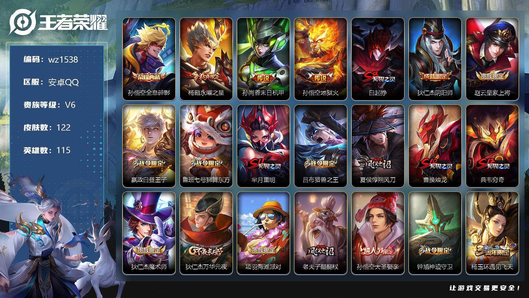【游戏多多】 【可二次实名】【wz1538】【商品标题】:安卓Q-V6-最强王者段位-115英雄-122皮肤-1典藏-0珍品无双-0无双-0珍品传说-3传说-18史诗 【荣耀典藏】:孙悟空全息碎影 【传说皮肤】:杨戬永曜之星,孙尚香末日机甲,孙悟空地狱火 【限定皮肤】:白起狰,狄仁杰阴阳师,赵云皇家上将,嬴政白昼王子,鲁班七号狮舞东方,芈月重明,吕布猎兽之王,夏侯惇朔风刀,曹操烛龙,典韦穷奇,狄仁杰魔术师,狄仁杰万华元夜,项羽海滩派对,老夫子醍醐杖,孙悟空大圣娶亲,钟馗神迹守卫,杨玉环遇见飞天,杨戬永曜之星,蔡文姬繁星吟游,太乙真人饕餮,鬼谷子原初探秘者,弈星混沌棋,明世隐疑决卦,裴擒虎李小龙,裴擒虎擒涛扼浪,狂铁御狮,盾山御銮,上官婉儿梁祝,鲁班大师探海日志,周瑜熔金海岸 【年限皮肤】:杨戬永曜之星 【赛季限定】:白起狰,芈月重明,夏侯惇朔风刀,曹操烛龙,典韦穷奇,狄仁杰万华元夜,老夫子醍醐杖,太乙真人饕餮,鬼谷子原初探秘者,弈星混沌棋,明世隐疑决卦,裴擒虎擒涛扼浪,狂铁御狮,盾山御銮,鲁班大师探海日志 【战令限定】:嬴政白昼王子,鲁班七号狮舞东方,吕布猎兽之王,钟馗神迹守卫 【史诗皮肤】:赵云皇家上将,狄仁杰魔术师,孙尚香水果甜心,嬴政摇滚巨星,妲己魅力维加斯,李白千年之狐,韩信白龙吟,雅典娜冰冠公主,李元芳逐浪之夏,杨玉环遇见飞天,嬴政白昼王子,孙悟空大圣娶亲,鲁班七号狮舞东方,狄仁杰鹰眼统帅,上官婉儿梁祝,蔡文姬繁星吟游,裴擒虎李小龙,黄忠百相守梦 【其他皮肤】:项羽海滩派对,韩信教廷特使,露娜哥特玫瑰,阿轲爱心护理,达摩大发明家,赵云忍炎影,芈月红桃皇后,白起白色死神,扁鹊化身博士,宫本武藏未来纪元,妲己少女阿狸,典韦黄金武士,亚瑟死亡骑士,达摩拳王,宫本武藏万象初新,后羿阿尔法小队,狄仁杰阴阳师,刘备纽约教父,刘备汉昭烈帝,关羽龙腾万里,白起狰,钟无艳海滩丽影,太乙真人饕餮,宫本武藏霸王丸,曹操烛龙,王昭君幻想奇妙夜,芈月重明,狂铁命运角斗场,老夫子功夫老勺,典韦穷奇,鬼谷子幻乐之宴,狂铁御狮,安琪拉如懿,项羽科学大爆炸,吕布猎兽之王,明世隐虹云星官,庄周奇妙博物学,钟馗神迹守卫,盾山御銮,孙膑归虚梦演,沈梦溪鲨炮海盗猫,姜子牙炽热元素使,夏侯惇朔风刀,弈星混沌棋,哪吒次元突破,鲁班七号黑桃队长,明世隐疑决卦,老夫子醍醐杖,鬼谷子原初探秘者,狄仁杰万华元夜,刘禅秘密基地,裴擒虎擒涛扼浪,鲁班大师探海日志,周瑜熔金海岸,钟馗虚灵犬护,白起死霸装,甄姬逆浪荇歌,云中君云械蓝图,庄周锦麟游梦,莱西奥踏浪烽翎,鲁班七号福禄兄弟,鲁班七号木偶奇遇记,露娜绯红之刃,钟无艳生化警戒,花木兰剑舞者,老夫子潮流仙人,程咬金华尔街大亨,王昭君精灵公主,曹操死神来了,张良一千零一夜,小乔万圣前夜,孙悟空西部大镖客,周瑜海军大将,后羿精灵王,兰陵王隐刃,李白范海辛,虞姬加勒比小姐,关羽天启骑士,蔡文姬蔷薇王座,雅典娜战争女神,马可波罗激情绿茵,苍维京掠夺者,杨戬埃及法老,哪吒三太子,黄忠芝加哥教父,干将莫邪第七人偶,铠龙域领主,百里守约绝影神枪,百里玄策威尼斯狂欢,裴擒虎街头旋风,弈星踏雪寻梅,元歌午夜歌剧院,李信灼热之刃,猪八戒年年有余,盘古创世神祝,曜归虚梦演,蒙犽归虚梦演,镜冰刃幻境,澜孤猎,云缨赤焰之缨 【营地ID】:450812150