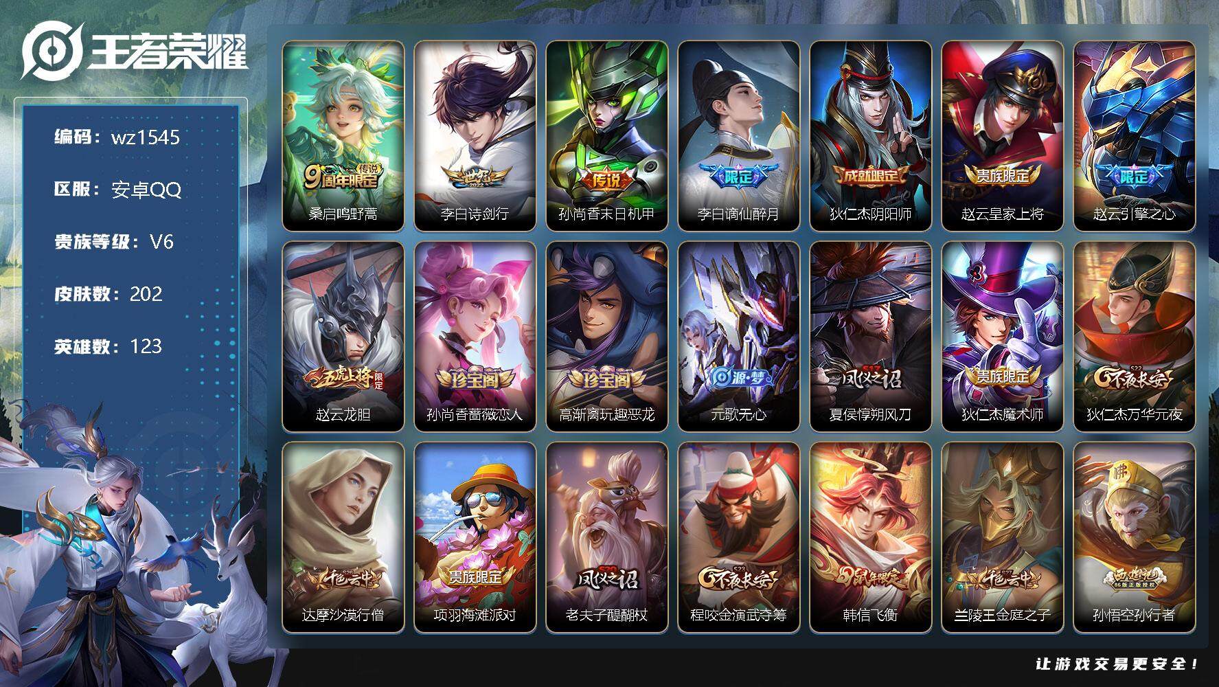 【游戏多多】 【可二次实名】【wz1545】【商品标题】:安卓Q-V6-至尊星耀III段位-123英雄-202皮肤-0典藏-0珍品无双-0无双-0珍品传说-3传说-47史诗 【传说皮肤】:桑启鸣野蒿,李白诗剑行,孙尚香末日机甲 【限定皮肤】:李白谪仙醉月,狄仁杰阴阳师,赵云皇家上将,赵云引擎之心,赵云龙胆,孙尚香蔷薇恋人,高渐离玩趣恶龙,元歌无心,夏侯惇朔风刀,狄仁杰魔术师,狄仁杰万华元夜,达摩沙漠行僧,项羽海滩派对,老夫子醍醐杖,程咬金演武夺筹,韩信飞衡,兰陵王金庭之子,孙悟空孙行者,李元芳银河之约,李元芳云中旅人,钟馗驱傩正仪,蔡文姬繁星吟游,鬼谷子原初探秘者,鬼谷子五谷丰年,黄忠烈魂,铠青龙志,苏烈千军破阵,弈星混沌棋,沈梦溪星空之诺,沈梦溪大漠名商,明世隐疑决卦,裴擒虎李小龙,裴擒虎擒涛扼浪,米莱狄御霄,云中君纤云弄巧,盾山御銮,猪八戒猪悟能,上官婉儿梁祝,嫦娥拒霜思,鲁班大师探海日志,桑启海盐诗旅,阿古朵江河有灵,张良古海寻踪,鬼谷子天穹祈灯,沈梦溪龙舞盛年,刘邦剑破天穹 【年限皮肤】:铠青龙志,韩信飞衡,黄忠烈魂,赵云龙胆 【赛季限定】:夏侯惇朔风刀,狄仁杰万华元夜,达摩沙漠行僧,老夫子醍醐杖,程咬金演武夺筹,兰陵王金庭之子,张良古海寻踪,李元芳云中旅人,钟馗驱傩正仪,鬼谷子原初探秘者,苏烈千军破阵,弈星混沌棋,沈梦溪大漠名商,明世隐疑决卦,裴擒虎擒涛扼浪,米莱狄御霄,盾山御銮,鲁班大师探海日志,桑启海盐诗旅,鬼谷子天穹祈灯,刘邦剑破天穹 【战令限定】:李元芳银河之约,沈梦溪星空之诺 【史诗皮肤】:露娜紫霞仙子,赵云皇家上将,赵云未来纪元,甄姬冰雪圆舞曲,狄仁杰魔术师,宫本武藏鬼剑武藏,孙尚香蔷薇恋人,孙尚香水果甜心,妲己魅力维加斯,妲己女仆咖啡,墨子金属风暴,吕布圣诞狂欢,曹操幽灵船长,李白千年之狐,吕布末日机甲,赵云引擎之心,花木兰水晶猎龙者,兰陵王暗隐猎兽者,诸葛亮黄金分割率,亚瑟心灵战警,百里守约特工魅影,铠曙光守护者,蔡文姬舞动绿茵,程咬金功夫厨神,孙策猫狗日记,铠青龙志,狄仁杰鹰眼统帅,上官婉儿梁祝,蔡文姬繁星吟游,李元芳银河之约,韩信飞衡,橘右京修罗,赵云龙胆,黄忠烈魂,孙尚香时之恋人,裴擒虎李小龙,云中君纤云弄巧,孙悟空孙行者,猪八戒猪悟能,嫦娥拒霜思,夏洛特永昼,鬼谷子五谷丰年,元歌无心,阿古朵江河有灵,马可波罗星界特工,李白谪仙醉月,黄忠百相守梦 【其他皮肤】:项羽海滩派对,韩信教廷特使,韩信街头霸王,赵云白执事,赵云忍炎影,芈月红桃皇后,程咬金星际陆战队,白起白色死神,牛魔西部大镖客,扁鹊化身博士,宫本武藏未来纪元,妲己少女阿狸,典韦黄金武士,亚瑟死亡骑士,花木兰兔女郎,张飞五福同心,甄姬花好人间,刘备万事如意,后羿阿尔法小队,狄仁杰阴阳师,刘备纽约教父,刘备汉昭烈帝,关羽龙腾万里,墨子进击墨子号,钟无艳海滩丽影,宫本武藏霸王丸,狂铁命运角斗场,老夫子功夫老勺,孙尚香沉稳之力,诸葛亮掌控之力,李白敏锐之力,鬼谷子幻乐之宴,苏烈坚韧之力,米莱狄御霄,明世隐虹云星官,小乔丁香结,吕布野性能量,盾山御銮,高渐离玩趣恶龙,沈梦溪鲨炮海盗猫,姜子牙炽热元素使,夏侯惇朔风刀,沈梦溪星空之诺,弈星混沌棋,哪吒次元突破,鲁班七号黑桃队长,明世隐疑决卦,盾山圆桌骑士,老夫子醍醐杖,狂铁特工战影,鬼谷子原初探秘者,狄仁杰万华元夜,刘禅秘密基地,程咬金演武夺筹,钟馗驱傩正仪,鲁班大师乓乓大师,苏烈千军破阵,达摩沙漠行僧,程咬金无双福将,刘邦虎啸剑宗,兰陵王金庭之子,沈梦溪大漠名商,蒙犽胡桃狂想曲,李元芳云中旅人,刘备潮玩造梦师,桑启海盐诗旅,海月幻泉雾影,猪八戒潮玩探月行,牛魔牛运亨通,白起乐园追猎者,赵怀真太极少年,裴擒虎擒涛扼浪,鲁班大师探海日志,李元芳妄想特派,张良古海寻踪,钟无艳聚星闪耀,兰陵王幻夜行动,后羿完美运算,鬼谷子天穹祈灯,廉颇功夫炙烤,沈梦溪龙舞盛年,钟无艳春野之旅,刘邦剑破天穹,东皇太一噬灭天穹,亚瑟动物派对,干将莫邪雾都夜雨,苍苍林狼骑,太乙真人谧流熔炉,典韦铁骨偃魂,西施雪境奇遇,姜子牙星梦巡礼,戈娅玫蓝誓约,刘备浪漫序章,钟馗虚灵犬护,张良灵野札记,阿古朵布丁狗之约,甄姬逆浪荇歌,莱西奥踏浪烽翎,鲁班七号福禄兄弟,露娜绯红之刃,貂蝉异域舞娘,老夫子潮流仙人,王昭君精灵公主,狄仁杰锦衣卫,曹操超能战警,小乔万圣前夜,孙悟空西部大镖客,刘禅英喵野望,兰陵王隐刃,李白范海辛,钟馗地府判官,李元芳特种部队,虞姬加勒比小姐,蔡文姬蔷薇王座,夏侯惇战争骑士,雅典娜战争女神,马可波罗激情绿茵,苍维京掠夺者,杨戬埃及法老,哪吒三太子,诸葛亮星航指挥官,黄忠芝加哥教父,鬼谷子阿摩司公爵,铠龙域领主,百里守约绝影神枪,百里玄策威尼斯狂欢,苏烈爱与和平,梦奇美梦成真,女娲尼罗河女神,公孙离花间舞,裴擒虎街头旋风,米莱狄精准探案法,元