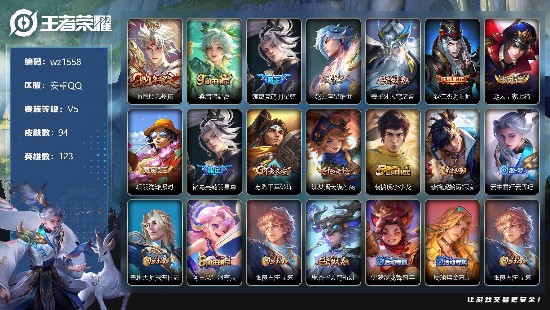 【游戏多多】 【可二次实名】【wz1558】【商品标题】:安卓Q-V5-至尊星耀IV段位-123英雄-94皮肤-0典藏-0珍品无双-0无双-0珍品传说-4传说-22史诗 【传说皮肤】:澜愿照九州拓,桑启鸣野蒿,诸葛亮鹤羽星尊,赵云淬星耀世 【限定皮肤】:姜子牙天穹之誓,狄仁杰阴阳师,赵云皇家上将,项羽海滩派对,诸葛亮鹤羽星尊,苏烈千军破阵,沈梦溪大漠名商,裴擒虎李小龙,裴擒虎擒涛扼浪,云中君纤云弄巧,鲁班大师探海日志,阿古朵江河有灵,张良古海寻踪,鬼谷子天穹祈灯,沈梦溪龙舞盛年,周瑜熔金海岸 【赛季限定】:张良古海寻踪,苏烈千军破阵,沈梦溪大漠名商,裴擒虎擒涛扼浪,鲁班大师探海日志,鬼谷子天穹祈灯,姜子牙天穹之誓 【史诗皮肤】:赵云皇家上将,赵云未来纪元,甄姬冰雪圆舞曲,廉颇地狱岩魂,宫本武藏鬼剑武藏,孙尚香水果甜心,妲己魅力维加斯,墨子金属风暴,张飞乱世虎臣,花木兰水晶猎龙者,小乔缤纷独角兽,兰陵王暗隐猎兽者,诸葛亮黄金分割率,安琪拉心灵骇客,阿轲节奏热浪,狄仁杰鹰眼统帅,裴擒虎李小龙,云中君纤云弄巧,阿古朵江河有灵,弈星万物之道,阿轲化蝶舞,狂铁龙之律动 【其他皮肤】:项羽海滩派对,韩信街头霸王,露娜哥特玫瑰,阿轲爱心护理,芈月红桃皇后,白起白色死神,牛魔西部大镖客,扁鹊化身博士,孙膑天使之翼,妲己少女阿狸,典韦黄金武士,亚瑟死亡骑士,甄姬花好人间,后羿阿尔法小队,狄仁杰阴阳师,关羽龙腾万里,老夫子功夫老勺,诸葛亮掌控之力,李白敏锐之力,沈梦溪鲨炮海盗猫,狂铁特工战影,廉颇无尽征程,刘禅秘密基地,苏烈千军破阵,马可波罗潮玩牛仔,程咬金无双福将,沈梦溪大漠名商,蒙恬蔚蓝守将,猪八戒潮玩探月行,赵怀真太极少年,裴擒虎擒涛扼浪,太乙真人劲辣红锅,鲁班大师探海日志,李元芳妄想特派,哪吒热血海滩,张良古海寻踪,钟无艳聚星闪耀,后羿完美运算,鬼谷子天穹祈灯,嫦娥漠中幻影,廉颇功夫炙烤,沈梦溪龙舞盛年,钟无艳春野之旅,姜子牙天穹之誓,周瑜熔金海岸,盘古敬我三分,东皇太一噬灭天穹,干将莫邪雾都夜雨,苍苍林狼骑,太乙真人谧流熔炉,典韦铁骨偃魂,明世隐景韶洛都,戈娅玫蓝誓约,刘备浪漫序章,钟馗虚灵犬护,苏烈春野闲踪,张良灵野札记,阿古朵布丁狗之约,露娜命运加冕,雅典娜潮玩士官长,甄姬逆浪荇歌,项羽帝国元帅,孙悟空西部大镖客,马可波罗激情绿茵,百里玄策威尼斯狂欢,马超幸存者,云缨赤焰之缨,暃碧珀绯影 【内测皮肤】:狂铁特工战影 【营地ID】:1880722067