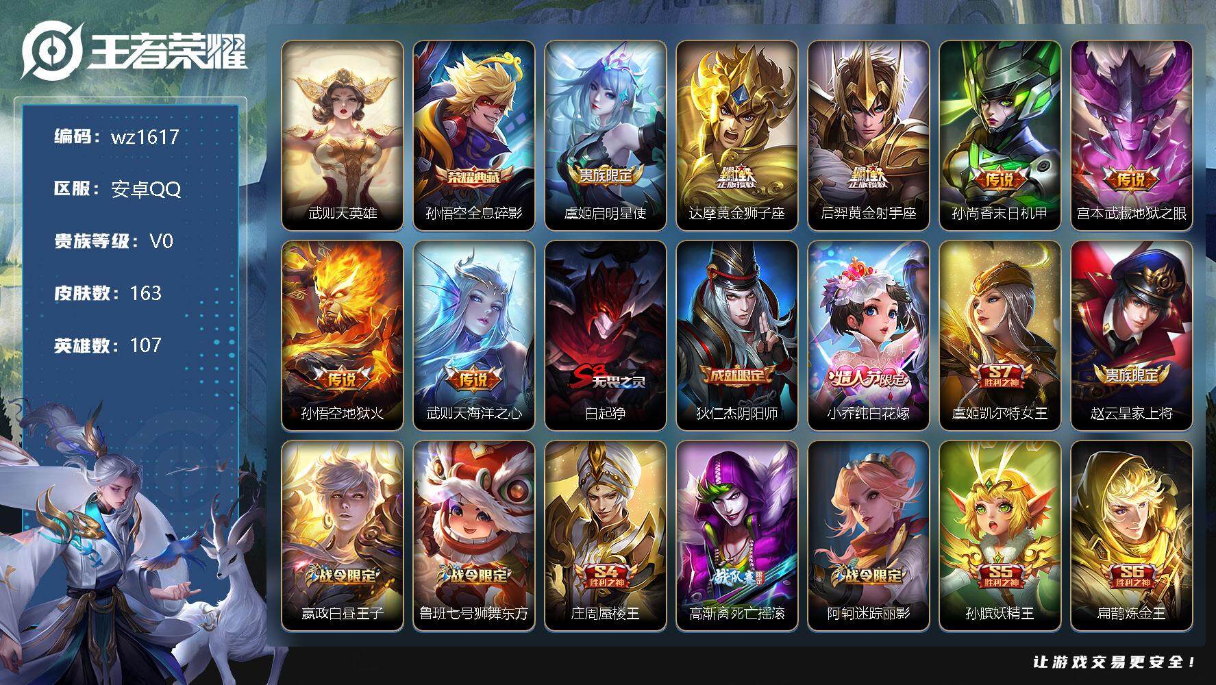 【游戏多多】 【可二次实名】【wz7】【商品标题】:安卓Q-V0-荣耀黄金III段位-107英雄-163皮肤-1典藏-0珍品无双-0无双-0珍品传说-7传说-43史诗 【荣耀典藏】:武则天英雄,孙悟空全息碎影 【传说皮肤】:虞姬启明星使,达摩黄金狮子座,后羿黄金射手座,孙尚香末日机甲,宫本武藏地狱之眼,孙悟空地狱火,武则天海洋之心 【限定皮肤】:白起狰,狄仁杰阴阳师,小乔纯白花嫁,虞姬凯尔特女王,赵云皇家上将,嬴政白昼王子,鲁班七号狮舞东方,庄周蜃楼王,高渐离死亡摇滚,阿轲迷踪丽影,孙膑妖精王,扁鹊炼金王,芈月重明,吕布猎兽之王,周瑜赤莲之焰,夏侯惇朔风刀,甄姬游园惊梦,曹操烛龙,典韦穷奇,典韦蓝屏警告,狄仁杰魔术师,狄仁杰万华元夜,项羽海滩派对,老夫子醍醐杖,安琪拉魔法小厨娘,露娜一生所爱,刘邦夺宝奇兵,韩信飞衡,兰陵王驯魔猎人,花木兰青春决赛季,牛魔御旌,李元芳银河之约,虞姬启明星使,钟馗神迹守卫,杨玉环遇见飞天,女娲朔望之晖,太乙真人饕餮,太乙真人华丽摇滚,鬼谷子原初探秘者,百里玄策原初追逐者,弈星混沌棋,沈梦溪星空之诺,明世隐疑决卦,裴擒虎天狼狩猎者,裴擒虎李小龙,狂铁御狮,米莱狄御霄,盾山御銮,上官婉儿梁祝 【年限皮肤】:韩信飞衡 【赛季限定】:庄周蜃楼王,孙膑妖精王,扁鹊炼金王,白起狰,芈月重明,夏侯惇朔风刀,曹操烛龙,典韦穷奇,狄仁杰万华元夜,老夫子醍醐杖,牛魔御旌,虞姬凯尔特女王,太乙真人饕餮,鬼谷子原初探秘者,百里玄策原初追逐者,弈星混沌棋,明世隐疑决卦,狂铁御狮,米莱狄御霄,盾山御銮 【战令限定】:嬴政白昼王子,鲁班七号狮舞东方,阿轲迷踪丽影,吕布猎兽之王,周瑜赤莲之焰,典韦蓝屏警告,刘邦夺宝奇兵,兰陵王驯魔猎人,李元芳银河之约,钟馗神迹守卫,女娲朔望之晖,沈梦溪星空之诺 【史诗皮肤】:项羽苍穹之光,阿轲暗夜猫娘,赵云皇家上将,赵云未来纪元,甄姬冰雪圆舞曲,狄仁杰魔术师,廉颇地狱岩魂,孙尚香水果甜心,妲己魅力维加斯,妲己女仆咖啡,墨子金属风暴,吕布圣诞狂欢,小乔纯白花嫁,李白千年之狐,安琪拉魔法小厨娘,张飞乱世虎臣,韩信白龙吟,刘邦德古拉伯爵,夏侯惇乘风破浪,小乔缤纷独角兽,甄姬游园惊梦,雅典娜冰冠公主,安琪拉心灵骇客,花木兰青春决赛季,百里守约特工魅影,铠曙光守护者,李元芳逐浪之夏,白起星夜王子,杨玉环遇见飞天,嬴政白昼王子,孙策猫狗日记,露娜一生所爱,典韦蓝屏警告,裴擒虎天狼狩猎者,鲁班七号狮舞东方,狄仁杰鹰眼统帅,兰陵王驯魔猎人,上官婉儿梁祝,李元芳银河之约,韩信飞衡,阿轲迷踪丽影,百里玄策原初追逐者,裴擒虎李小龙 【其他皮肤】:项羽海滩派对,韩信教廷特使,阿轲致命风华,阿轲爱心护理,达摩大发明家,芈月红桃皇后,白起白色死神,扁鹊化身博士,安琪拉玩偶对对碰,妲己少女阿狸,亚瑟死亡骑士,达摩拳王,张飞五福同心,宫本武藏万象初新,后羿阿尔法小队,狄仁杰阴阳师,庄周蜃楼王,刘备纽约教父,高渐离死亡摇滚,孙膑妖精王,刘备汉昭烈帝,扁鹊炼金王,关羽龙腾万里,虞姬凯尔特女王,白起狰,钟无艳海滩丽影,太乙真人饕餮,宫本武藏霸王丸,曹操烛龙,王昭君幻想奇妙夜,芈月重明,狂铁命运角斗场,老夫子功夫老勺,典韦穷奇,鬼谷子幻乐之宴,狂铁御狮,安琪拉如懿,太乙真人华丽摇滚,苏烈坚韧之力,大乔守护之力,项羽科学大爆炸,米莱狄御霄,吕布猎兽之王,明世隐虹云星官,牛魔御旌,女娲朔望之晖,小乔丁香结,钟馗神迹守卫,盾山御銮,孙膑归虚梦演,沈梦溪鲨炮海盗猫,夏侯惇朔风刀,周瑜赤莲之焰,沈梦溪星空之诺,弈星混沌棋,哪吒次元突破,明世隐疑决卦,刘邦夺宝奇兵,盾山圆桌骑士,老夫子醍醐杖,鬼谷子原初探秘者,狄仁杰万华元夜,高渐离金属狂潮,露娜绯红之刃,钟无艳生化警戒,貂蝉异域舞娘,花木兰剑舞者,王昭君精灵公主,曹操死神来了,张良一千零一夜,孙悟空西部大镖客,后羿精灵王,刘禅英喵野望,兰陵王隐刃,李白范海辛,钟馗地府判官,夏侯惇战争骑士,雅典娜战争女神,马可波罗激情绿茵,苍维京掠夺者,杨戬埃及法老,哪吒三太子,诸葛亮星航指挥官,黄忠芝加哥教父,大乔伊势巫女,东皇太一东海龙王,干将莫邪第七人偶,百里守约绝影神枪,百里玄策威尼斯狂欢,苏烈爱与和平,梦奇美梦成真,公孙离花间舞,裴擒虎街头旋风,弈星踏雪寻梅,米莱狄精准探案法,元歌午夜歌剧院,孙策海之征途,司马懿魇语军师,盾山极冰防御线,伽罗花见巫女,沈梦溪棒球奇才,上官婉儿修竹墨客,嫦娥露花倒影,猪八戒年年有余,瑶森,云中君荷鲁斯之眼,曜归虚梦演,马超幸存者,镜冰刃幻境,蒙恬秩序猎龙将,阿古朵熊喵少女,澜孤猎 【营地ID】:70144254