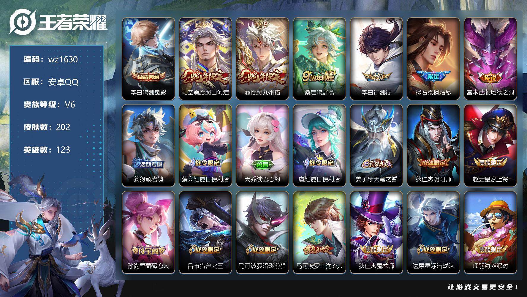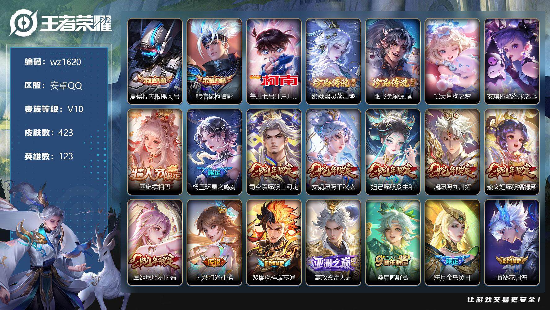 【游戏多多】 【可二次实名】【wz1620】【商品标题】:安卓Q-V10-至尊星耀III段位-123英雄-423皮肤-2典藏-0珍品无双-0无双-5珍品传说-41传说-129史诗 【英雄全皮】:阿轲全皮,娜可露露全皮,橘右京全皮,苍全皮,杨戬全皮,蒙恬全皮,镜全皮,影全皮 【荣耀典藏】:夏侯惇无限飓风号,韩信弑枪猎影 【珍品传说】:鲁班七号江户川柯南,嫦娥器灵落星盏,张飞兔狲蓬尾,瑶大耳狗之梦,安琪拉酷洛米之心 【传说皮肤】:西施续相思,杨玉环星之鸣奏,司空震愿照山河定,女娲愿照千秋盛,妲己愿照众生和,澜愿照九州拓,蔡文姬愿照福禄聚,虞姬愿照岁时盈,云缨幻光神枪,裴擒虎祥瑞亨通,嬴政玄雷天君,桑启鸣野蒿,海月金乌负日,澜逐花归海,艾琳觅芳踪,露娜霜月吟,上官婉儿妄想奇谈,夏洛特浮生妄,橘右京枫霜尽,娜可露露前尘镜,马超无双飞将,镜炽阳神光,虞姬启明星使,关羽武圣,曜云鹰飞将,李信一念神魔,刘备时之恋人,伽罗太华,张良黄金白羊座,虞姬云霓雀翎,达摩黄金狮子座,百里玄策白虎志,花木兰冠军飞将,梦奇胖达荣荣,后羿黄金射手座,杨戬永曜之星,貂蝉仲夏夜之梦,李白凤求凰,孙尚香末日机甲,宫本武藏地狱之眼,狄仁杰超时空战士 【限定皮肤】:白起狰,蒙犽顽岩魄,蔡文姬夏日便利店,大乔绒语心约,虞姬夏日便利店,姜子牙天穹之誓,杨戬破阵退雄兵,狄仁杰阴阳师,虞姬凯尔特女王,赵云皇家上将,赵云引擎之心,赵云百木心枪,墨子降魔,妲己时之彼端,嬴政白昼王子,鲁班七号狮舞东方,庄周蜃楼王,庄周玄嵩,高渐离死亡摇滚,高渐离玩趣恶龙,阿轲迷踪丽影,钟无艳王者之锤,孙膑妖精王,扁鹊炼金王,芈月重明,芈月幻夜卜梦,吕布猎兽之王,周瑜赤莲之焰,夏侯惇朔风刀,甄姬幽恒,曹操烛龙,曹操天狼征服者,典韦穷奇,典韦蓝屏警告,典韦岱宗,马可波罗暗影游猎,狄仁杰魔术师,狄仁杰万华元夜,达摩沙漠行僧,项羽海滩派对,老夫子醍醐杖,关羽冰锋战神,关羽武圣,程咬金演武夺筹,露娜一生所爱,刘邦夺宝奇兵,韩信逐梦之影,韩信飞衡,王昭君凤凰于飞,兰陵王金庭之子,花木兰瑞麟志,娜可露露前尘镜,橘右京枫霜尽,孙悟空美猴王,孙悟空至尊宝,孙悟空大圣娶亲,牛魔御旌,后羿辉光之辰,后羿如梦令,李元芳银河之约,虞姬启明星使,钟馗驱傩正仪,杨玉环遇见飞天,杨戬永曜之星,杨戬潮玩骑兵,女娲朔望之晖,哪吒逐梦之翼,干将莫邪冰霜恋舞曲,雅典娜单词大作战,雅典娜黎明之约,蔡文姬奇迹圣诞,蔡文姬繁星吟游,太乙真人饕餮,东皇太一逐梦之光,鬼谷子原初探秘者,铠青龙志,苏烈千军破阵,百里玄策白虎志,百里玄策原初追逐者,百里守约朱雀志,弈星混沌棋,沈梦溪星空之诺,沈梦溪大漠名商,明世隐疑决卦,裴擒虎天狼狩猎者,狂铁御狮,米莱狄御霄,云中君纤云弄巧,伽罗太华,盾山御銮,猪八戒西部大镖客,上官婉儿梁祝,上官婉儿天狼绘梦者,上官婉儿妄想奇谈,嫦娥如梦令,嫦娥暖冬兔眠,蒙犽狂想玩偶喵,镜匿光追影者,夏洛特浮生妄,艾琳女武神,艾琳觅芳踪,蒙恬荣光圣徽,鬼谷子天穹祈灯,沈梦溪龙舞盛年,鲁班七号蔬乡物语,李元芳蔬乡物语,海月金乌负日,刘邦剑破天穹,程咬金群星魔术团,镜青焰无极,项羽苍威无极,刘备异域游侠,芈月浮光幕影,周瑜熔金海岸 【年限皮肤】:百里玄策白虎志,百里守约朱雀志,花木兰瑞麟志,铠青龙志,孙悟空美猴王,王昭君凤凰于飞,李白凤求凰,杨戬永曜之星,后羿辉光之辰,伽罗太华,甄姬幽恒,韩信飞衡,典韦岱宗,庄周玄嵩,关羽武圣 【赛季限定】:庄周蜃楼王,孙膑妖精王,扁鹊炼金王,白起狰,芈月重明,夏侯惇朔风刀,曹操烛龙,典韦穷奇,狄仁杰万华元夜,达摩沙漠行僧,老夫子醍醐杖,程咬金演武夺筹,兰陵王金庭之子,牛魔御旌,虞姬凯尔特女王,钟馗驱傩正仪,雅典娜黎明之约,太乙真人饕餮,鬼谷子原初探秘者,苏烈千军破阵,百里玄策原初追逐者,弈星混沌棋,沈梦溪大漠名商,明世隐疑决卦,狂铁御狮,米莱狄御霄,盾山御銮,鬼谷子天穹祈灯,蒙恬荣光圣徽,刘邦剑破天穹,姜子牙天穹之誓 【战令限定】:蔡文姬夏日便利店,虞姬夏日便利店,嬴政白昼王子,鲁班七号狮舞东方,阿轲迷踪丽影,芈月幻夜卜梦,吕布猎兽之王,周瑜赤莲之焰,典韦蓝屏警告,马可波罗暗影游猎,刘邦夺宝奇兵,李元芳银河之约,杨戬潮玩骑兵,女娲朔望之晖,雅典娜单词大作战,沈梦溪星空之诺,猪八戒西部大镖客,嫦娥暖冬兔眠,蒙犽狂想玩偶喵,鲁班七号蔬乡物语,李元芳蔬乡物语,镜青焰无极,项羽苍威无极 【史诗皮肤】:鲁班七号电玩小子,项羽苍穹之光,阿轲暗夜猫娘,钟无艳王者之锤,赵云皇家上将,赵云未来纪元,貂蝉圣诞恋歌,甄姬冰雪圆舞曲,王昭君偶像歌手,狄仁杰魔术师,廉颇地狱岩魂,宫本武藏鬼剑武藏,孙尚香水果甜心,嬴政暗夜贵公子,妲己魅力维加斯,妲己女仆咖啡,墨子金属风暴,吕布圣诞狂欢,刘禅绅士熊喵,曹操幽灵船长,李白千年之狐,吕布末日机甲,张飞乱世虎
