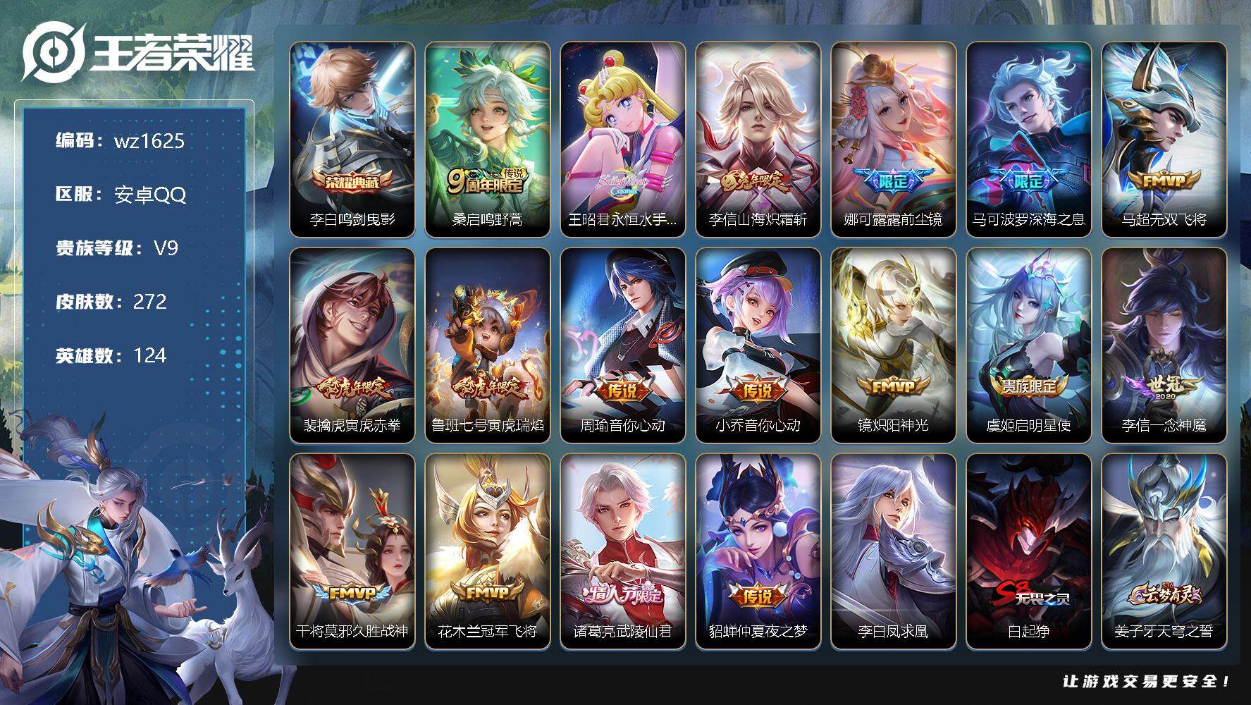 【游戏多多】 【可二次实名】【wz1625】【商品标题】:安卓Q-V9-最强王者段位-124英雄-272皮肤-1典藏-0珍品无双-0无双-0珍品传说-18传说-75史诗 【英雄全皮】:李信全皮 【荣耀典藏】:李白鸣剑曳影 【传说皮肤】:桑启鸣野蒿,王昭君永恒水手月亮,李信山海炽霜斩,娜可露露前尘镜,马可波罗深海之息,马超无双飞将,裴擒虎寅虎赤拳,鲁班七号寅虎瑞焰,周瑜音你心动,小乔音你心动,镜炽阳神光,虞姬启明星使,李信一念神魔,干将莫邪久胜战神,花木兰冠军飞将,诸葛亮武陵仙君,貂蝉仲夏夜之梦,李白凤求凰 【限定皮肤】:白起狰,姜子牙天穹之誓,狄仁杰阴阳师,廉颇寅虎御盾,赵云皇家上将,墨子神迹守卫,鲁班七号狮舞东方,鲁班七号寅虎瑞焰,庄周高山流水,高渐离玩趣恶龙,钟无艳超时空战士,孙膑寅虎展翼,扁鹊奇幻香踪,白起夜都怪侠,芈月重明,芈月幻夜卜梦,周瑜赤莲之焰,元歌云间偶戏,夏侯惇朔风刀,甄姬落雪兰心,典韦蓝屏警告,马可波罗深海之息,狄仁杰魔术师,狄仁杰万华元夜,达摩星际陆战队,达摩沙漠行僧,项羽海滩派对,老夫子醍醐杖,老夫子航海奇遇记,程咬金演武夺筹,韩信飞衡,韩信傲雪梅枪,王昭君午后时光,兰陵王驯魔猎人,兰陵王金庭之子,娜可露露前尘镜,亚瑟潮玩骑士王,孙悟空至尊宝,牛魔御旌,李元芳云中旅人,虞姬霸王别姬,虞姬启明星使,钟馗神迹守卫,钟馗驱傩正仪,杨玉环遇见飞天,杨玉环寅虎心曲,杨戬潮玩骑兵,女娲朔望之晖,太乙真人饕餮,鬼谷子原初探秘者,鬼谷子五谷丰年,诸葛亮武陵仙君,黄忠火炮绅士,铠青龙志,苏烈千军破阵,弈星混沌棋,公孙离蜜橘之夏,沈梦溪大漠名商,明世隐疑决卦,裴擒虎天狼狩猎者,裴擒虎李小龙,裴擒虎寅虎赤拳,裴擒虎擒涛扼浪,狂铁御狮,狂铁电玩高手,米莱狄御霄,米莱狄胡桃异想国,云中君纤云弄巧,李信山海炽霜斩,伽罗天狼溯光者,盾山御銮,上官婉儿梁祝,嫦娥拒霜思,嫦娥暖冬兔眠,西施玲珑珍味,鲁班大师探海日志,镜匿光追影者,桑启海盐诗旅,艾琳流音漫舞,司空震地狱燃心,阿古朵江河有灵,张良古海寻踪,王昭君永恒水手月亮,沈梦溪龙舞盛年,刘邦剑破天穹,周瑜熔金海岸 【年限皮肤】:铠青龙志,裴擒虎寅虎赤拳,孙膑寅虎展翼,鲁班七号寅虎瑞焰,杨玉环寅虎心曲,廉颇寅虎御盾,李白凤求凰,韩信飞衡,李信山海炽霜斩 【赛季限定】:白起狰,芈月重明,夏侯惇朔风刀,狄仁杰万华元夜,达摩沙漠行僧,老夫子醍醐杖,程咬金演武夺筹,兰陵王金庭之子,张良古海寻踪,牛魔御旌,李元芳云中旅人,钟馗驱傩正仪,太乙真人饕餮,鬼谷子原初探秘者,苏烈千军破阵,弈星混沌棋,沈梦溪大漠名商,明世隐疑决卦,裴擒虎擒涛扼浪,狂铁御狮,米莱狄御霄,盾山御銮,鲁班大师探海日志,桑启海盐诗旅,刘邦剑破天穹,姜子牙天穹之誓 【战令限定】:墨子神迹守卫,鲁班七号狮舞东方,钟无艳超时空战士,扁鹊奇幻香踪,白起夜都怪侠,芈月幻夜卜梦,周瑜赤莲之焰,元歌云间偶戏,甄姬落雪兰心,典韦蓝屏警告,达摩星际陆战队,老夫子航海奇遇记,王昭君午后时光,兰陵王驯魔猎人,艾琳流音漫舞,亚瑟潮玩骑士王,钟馗神迹守卫,杨戬潮玩骑兵,女娲朔望之晖,黄忠火炮绅士,狂铁电玩高手,米莱狄胡桃异想国,嫦娥暖冬兔眠,西施玲珑珍味,司空震地狱燃心 【史诗皮肤】:赵云皇家上将,赵云未来纪元,貂蝉圣诞恋歌,甄姬冰雪圆舞曲,王昭君偶像歌手,狄仁杰魔术师,宫本武藏鬼剑武藏,孙尚香水果甜心,嬴政暗夜贵公子,嬴政摇滚巨星,妲己魅力维加斯,妲己女仆咖啡,墨子金属风暴,吕布圣诞狂欢,刘禅绅士熊喵,曹操幽灵船长,李白千年之狐,张飞乱世虎臣,韩信白龙吟,虞姬霸王别姬,孙悟空至尊宝,刘邦德古拉伯爵,夏侯惇乘风破浪,兰陵王暗隐猎兽者,诸葛亮黄金分割率,亚瑟心灵战警,雅典娜冰冠公主,安琪拉心灵骇客,百里守约特工魅影,铠曙光守护者,蔡文姬舞动绿茵,刘禅天才门将,公孙离蜜橘之夏,李元芳逐浪之夏,白起星夜王子,阿轲节奏热浪,杨玉环遇见飞天,孙策猫狗日记,铠青龙志,典韦蓝屏警告,伽罗箭羽风息,裴擒虎天狼狩猎者,鲁班七号狮舞东方,狄仁杰鹰眼统帅,兰陵王驯魔猎人,上官婉儿梁祝,韩信飞衡,不知火舞魅语,橘右京修罗,裴擒虎李小龙,云中君纤云弄巧,元歌云间偶戏,米莱狄胡桃异想国,老夫子航海奇遇记,伽罗天狼溯光者,杨戬天秀启明,庄周高山流水,嫦娥拒霜思,镜匿光追影者,黄忠火炮绅士,韩信傲雪梅枪,杨玉环寅虎心曲,廉颇寅虎御盾,孙膑寅虎展翼,澜赏金猎手,狂铁电玩高手,钟无艳超时空战士,鬼谷子五谷丰年,扁鹊奇幻香踪,刘禅电玩爆裂旋风,司空震地狱燃心,阿古朵江河有灵,弈星炽弈燎原,弈星万物之道,狂铁龙之律动 【其他皮肤】:项羽海滩派对,韩信教廷特使,韩信街头霸王,露娜哥特玫瑰,阿轲致命风华,阿轲爱心护理,达摩大发明家,赵云忍炎影,程咬金星际陆战队,白起白色死神,扁鹊化身博士,宫本武藏未来纪元,安琪拉玩偶对对碰
