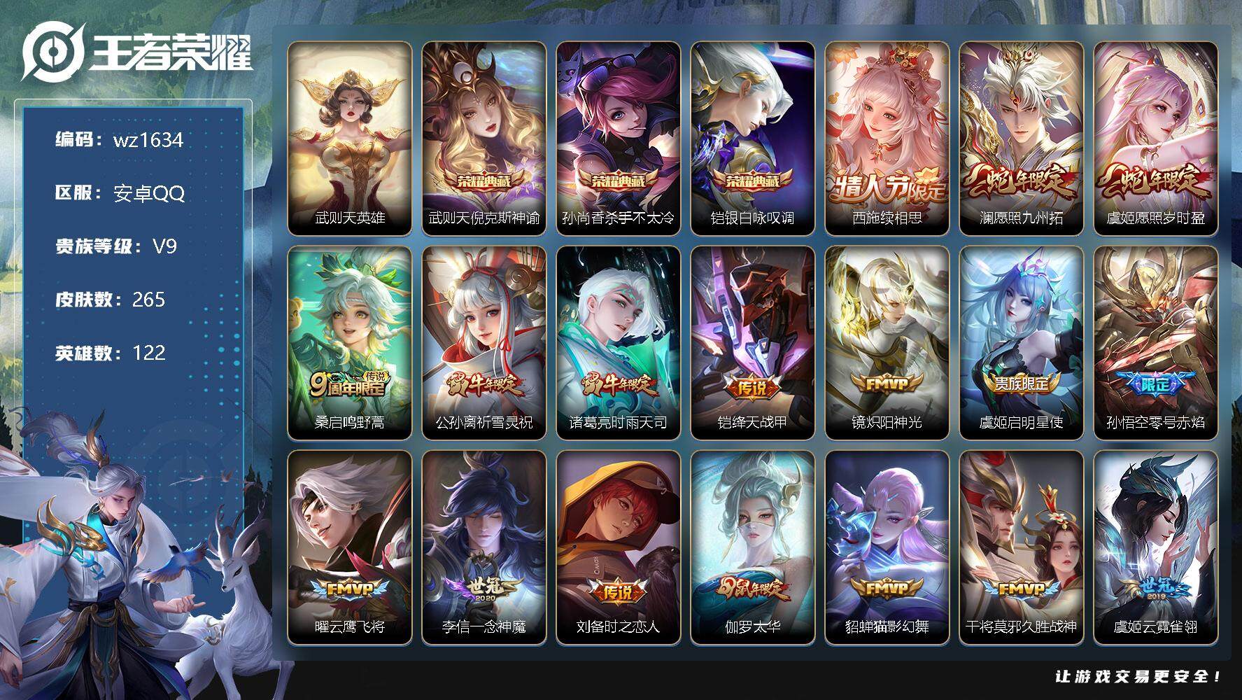 【游戏多多】 【可二次实名】【wz1634】【商品标题】:安卓Q-V9-永恒钻石II段位-122英雄-265皮肤-3典藏-0珍品无双-0无双-0珍品传说-26传说-63史诗 【荣耀典藏】:武则天英雄,武则天倪克斯神谕,孙尚香杀手不太冷,铠银白咏叹调 【传说皮肤】:西施续相思,澜愿照九州拓,虞姬愿照岁时盈,桑启鸣野蒿,公孙离祈雪灵祝,诸葛亮时雨天司,铠绛天战甲,镜炽阳神光,虞姬启明星使,孙悟空零号赤焰,曜云鹰飞将,李信一念神魔,刘备时之恋人,伽罗太华,貂蝉猫影幻舞,干将莫邪久胜战神,虞姬云霓雀翎,达摩黄金狮子座,花木兰冠军飞将,梦奇胖达荣荣,后羿黄金射手座,孙尚香末日机甲,宫本武藏地狱之眼,孙悟空地狱火,武则天海洋之心,狄仁杰超时空战士 【限定皮肤】:白起狰,姜子牙天穹之誓,狄仁杰阴阳师,虞姬凯尔特女王,赵云皇家上将,鲁班七号狮舞东方,阿轲迷踪丽影,芈月重明,芈月白晶晶,吕布御风骁将,周瑜赤莲之焰,元歌云间偶戏,夏侯惇朔风刀,曹操烛龙,典韦穷奇,马可波罗暗影游猎,狄仁杰魔术师,狄仁杰万华元夜,达摩星际陆战队,达摩沙漠行僧,项羽海滩派对,老夫子醍醐杖,程咬金演武夺筹,刘邦夺宝奇兵,兰陵王驯魔猎人,兰陵王金庭之子,亚瑟潮玩骑士王,孙悟空零号赤焰,牛魔御旌,后羿如梦令,刘备百相守梦,李元芳银河之约,李元芳云中旅人,虞姬霸王别姬,虞姬启明星使,钟馗神迹守卫,钟馗驱傩正仪,女娲朔望之晖,干将莫邪冰霜恋舞曲,雅典娜单词大作战,雅典娜黎明之约,蔡文姬繁星吟游,鬼谷子原初探秘者,鬼谷子五谷丰年,诸葛亮时雨天司,苏烈千军破阵,百里玄策原初追逐者,弈星混沌棋,公孙离祈雪灵祝,沈梦溪星空之诺,沈梦溪大漠名商,明世隐疑决卦,裴擒虎天狼狩猎者,裴擒虎李小龙,裴擒虎擒涛扼浪,狂铁御狮,米莱狄胡桃异想国,云中君纤云弄巧,伽罗太华,盾山御銮,猪八戒西部大镖客,上官婉儿梁祝,嫦娥暖冬兔眠,蒙犽狂想玩偶喵,鲁班大师探海日志,桑启海盐诗旅,艾琳女武神,张良古海寻踪,鬼谷子天穹祈灯 【年限皮肤】:公孙离祈雪灵祝,吕布御风骁将,诸葛亮时雨天司,伽罗太华 【赛季限定】:白起狰,芈月重明,夏侯惇朔风刀,曹操烛龙,典韦穷奇,狄仁杰万华元夜,达摩沙漠行僧,老夫子醍醐杖,程咬金演武夺筹,兰陵王金庭之子,张良古海寻踪,牛魔御旌,李元芳云中旅人,虞姬凯尔特女王,钟馗驱傩正仪,雅典娜黎明之约,鬼谷子原初探秘者,苏烈千军破阵,百里玄策原初追逐者,弈星混沌棋,沈梦溪大漠名商,明世隐疑决卦,裴擒虎擒涛扼浪,狂铁御狮,盾山御銮,鲁班大师探海日志,桑启海盐诗旅,鬼谷子天穹祈灯,姜子牙天穹之誓 【战令限定】:鲁班七号狮舞东方,阿轲迷踪丽影,周瑜赤莲之焰,元歌云间偶戏,马可波罗暗影游猎,达摩星际陆战队,刘邦夺宝奇兵,兰陵王驯魔猎人,亚瑟潮玩骑士王,李元芳银河之约,钟馗神迹守卫,女娲朔望之晖,雅典娜单词大作战,沈梦溪星空之诺,米莱狄胡桃异想国,猪八戒西部大镖客,嫦娥暖冬兔眠,蒙犽狂想玩偶喵 【史诗皮肤】:鲁班七号电玩小子,露娜紫霞仙子,赵云皇家上将,赵云未来纪元,貂蝉圣诞恋歌,甄姬冰雪圆舞曲,王昭君偶像歌手,狄仁杰魔术师,廉颇地狱岩魂,宫本武藏鬼剑武藏,孙尚香水果甜心,嬴政暗夜贵公子,妲己魅力维加斯,妲己女仆咖啡,墨子龙骑士,墨子金属风暴,吕布圣诞狂欢,曹操幽灵船长,吕布末日机甲,韩信白龙吟,虞姬霸王别姬,花木兰水晶猎龙者,夏侯惇乘风破浪,小乔缤纷独角兽,兰陵王暗隐猎兽者,诸葛亮黄金分割率,亚瑟心灵战警,安琪拉心灵骇客,百里守约特工魅影,铠曙光守护者,蔡文姬舞动绿茵,刘禅天才门将,李元芳逐浪之夏,程咬金功夫厨神,阿轲节奏热浪,干将莫邪冰霜恋舞曲,伽罗箭羽风息,裴擒虎天狼狩猎者,鲁班七号狮舞东方,狄仁杰鹰眼统帅,兰陵王驯魔猎人,上官婉儿梁祝,蔡文姬繁星吟游,李元芳银河之约,后羿如梦令,阿轲迷踪丽影,孙尚香时之恋人,马可波罗暗影游猎,蒙犽狂想玩偶喵,百里玄策原初追逐者,裴擒虎李小龙,云中君纤云弄巧,元歌云间偶戏,芈月白晶晶,吕布御风骁将,米莱狄胡桃异想国,雅典娜黎明之约,弈星滕王阁序,鬼谷子五谷丰年,刘备百相守梦,孙膑茶境仙,赵怀真器灵浮梦炉,阿轲化蝶舞 【其他皮肤】:项羽海滩派对,韩信教廷特使,韩信街头霸王,露娜哥特玫瑰,达摩大发明家,赵云白执事,芈月红桃皇后,艾琳女武神,白起白色死神,牛魔西部大镖客,武则天东方不败,扁鹊化身博士,扁鹊救世之瞳,孙膑天使之翼,妲己少女阿狸,典韦黄金武士,亚瑟死亡骑士,花木兰兔女郎,张飞五福同心,甄姬花好人间,宫本武藏万象初新,后羿阿尔法小队,狄仁杰阴阳师,刘备汉昭烈帝,关羽龙腾万里,虞姬凯尔特女王,白起狰,钟无艳海滩丽影,宫本武藏霸王丸,曹操烛龙,王昭君幻想奇妙夜,芈月重明,狂铁命运角斗场,老夫子功夫老勺,孙尚香沉稳之力,典韦穷奇,诸葛亮掌控之力,李白敏锐之力,鬼谷子幻乐之宴,狂铁御狮,苏烈坚