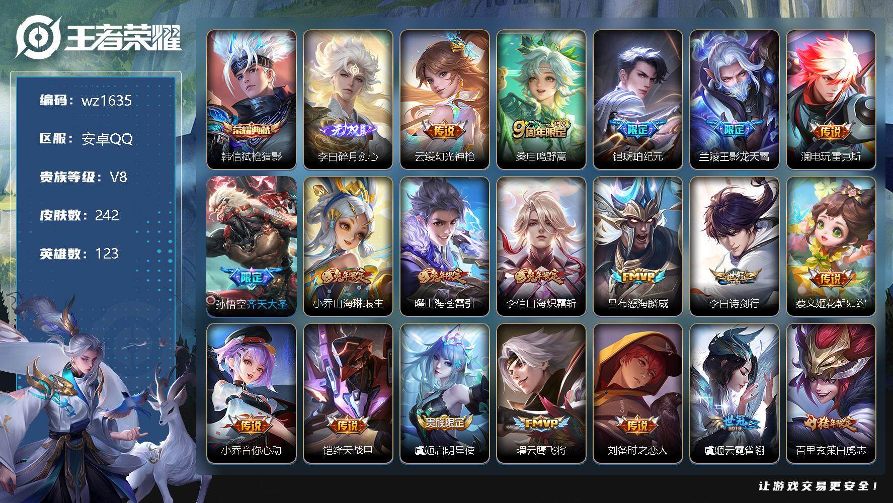 【游戏多多】 【可二次实名】【wz1635】【商品标题】:安卓Q-V8-最强王者段位-123英雄-242皮肤-1典藏-0珍品无双-1无双-0珍品传说-19传说-48史诗 【英雄全皮】:影全皮 【荣耀典藏】:韩信弑枪猎影 【无双皮肤】:李白碎月剑心 【传说皮肤】:云缨幻光神枪,桑启鸣野蒿,铠琥珀纪元,兰陵王影龙天霄,澜电玩雷克斯,孙悟空齐天大圣,小乔山海琳琅生,曜山海苍雷引,李信山海炽霜斩,吕布怒海麟威,李白诗剑行,蔡文姬花朝如约,小乔音你心动,铠绛天战甲,虞姬启明星使,曜云鹰飞将,刘备时之恋人,虞姬云霓雀翎,百里玄策白虎志 【限定皮肤】:白起狰,姜子牙天穹之誓,狄仁杰阴阳师,小乔山海琳琅生,赵云皇家上将,墨子神迹守卫,钟无艳超时空战士,芈月重明,吕布猎兽之王,元歌无心,夏侯惇朔风刀,甄姬游园惊梦,甄姬落雪兰心,曹操烛龙,马可波罗山海玄木吟,狄仁杰魔术师,狄仁杰万华元夜,达摩沙漠行僧,项羽海滩派对,老夫子醍醐杖,程咬金演武夺筹,兰陵王影龙天霄,孙悟空齐天大圣,牛魔御旌,李元芳云中旅人,虞姬启明星使,钟馗驱傩正仪,干将莫邪冰霜恋舞曲,太乙真人饕餮,鬼谷子原初探秘者,百里玄策白虎志,百里玄策原初追逐者,弈星混沌棋,明世隐疑决卦,裴擒虎李小龙,裴擒虎擒涛扼浪,米莱狄御霄,瑶山海碧波行,李信山海炽霜斩,盾山御銮,嫦娥拒霜思,嫦娥暖冬兔眠,曜山海苍雷引,鲁班大师探海日志,桑启海盐诗旅,暃星界游侠,艾琳流音漫舞,司空震地狱燃心,阿古朵江河有灵,张良古海寻踪,蒙犽百解令,蒙恬荣光圣徽,高渐离燃音魔法,妲己灵卜魔法,鬼谷子天穹祈灯,李白碎月剑心,铠琥珀纪元,姬小满妄想食味,刘邦剑破天穹,周瑜熔金海岸 【年限皮肤】:百里玄策白虎志,瑶山海碧波行,马可波罗山海玄木吟,李信山海炽霜斩,小乔山海琳琅生,曜山海苍雷引 【赛季限定】:白起狰,芈月重明,夏侯惇朔风刀,曹操烛龙,狄仁杰万华元夜,达摩沙漠行僧,老夫子醍醐杖,程咬金演武夺筹,张良古海寻踪,牛魔御旌,李元芳云中旅人,钟馗驱傩正仪,太乙真人饕餮,鬼谷子原初探秘者,百里玄策原初追逐者,弈星混沌棋,明世隐疑决卦,裴擒虎擒涛扼浪,米莱狄御霄,盾山御銮,鲁班大师探海日志,桑启海盐诗旅,鬼谷子天穹祈灯,蒙恬荣光圣徽,刘邦剑破天穹,姜子牙天穹之誓 【战令限定】:墨子神迹守卫,钟无艳超时空战士,吕布猎兽之王,甄姬落雪兰心,艾琳流音漫舞,嫦娥暖冬兔眠,司空震地狱燃心,暃星界游侠,高渐离燃音魔法,妲己灵卜魔法 【史诗皮肤】:阿轲暗夜猫娘,赵云皇家上将,貂蝉圣诞恋歌,甄姬冰雪圆舞曲,王昭君偶像歌手,狄仁杰魔术师,宫本武藏鬼剑武藏,孙尚香水果甜心,嬴政摇滚巨星,妲己魅力维加斯,夏侯惇乘风破浪,兰陵王暗隐猎兽者,诸葛亮黄金分割率,甄姬游园惊梦,亚瑟心灵战警,百里守约特工魅影,刘禅天才门将,李元芳逐浪之夏,白起星夜王子,阿轲节奏热浪,干将莫邪冰霜恋舞曲,狄仁杰鹰眼统帅,娜可露露晚萤,小乔青蛇,不知火舞魅语,百里玄策原初追逐者,裴擒虎李小龙,西施诗语江南,百里玄策热力回旋,嫦娥拒霜思,澜赏金猎手,高渐离天秀音浪,钟无艳超时空战士,元歌无心,暃星界游侠,马可波罗山海玄木吟,瑶山海碧波行,镜真我赫兹,莱西奥末日机甲,司空震地狱燃心,阿古朵江河有灵,蒙犽百解令,妲己灵卜魔法,高渐离燃音魔法,蒙恬荣光圣徽,姬小满妄想食味,狂铁龙之律动,百里守约雪豹霜爪,牛魔小牛鸭 【其他皮肤】:项羽海滩派对,韩信教廷特使,韩信街头霸王,露娜哥特玫瑰,阿轲爱心护理,赵云白执事,赵云忍炎影,芈月红桃皇后,程咬金星际陆战队,白起白色死神,牛魔西部大镖客,武则天东方不败,扁鹊化身博士,扁鹊救世之瞳,宫本武藏未来纪元,安琪拉玩偶对对碰,孙膑天使之翼,姜子牙时尚教父,妲己少女阿狸,典韦黄金武士,亚瑟死亡骑士,达摩拳王,张飞五福同心,甄姬花好人间,刘备万事如意,宫本武藏万象初新,狄仁杰阴阳师,刘备纽约教父,刘备汉昭烈帝,关羽龙腾万里,白起狰,钟无艳海滩丽影,太乙真人饕餮,曹操烛龙,王昭君幻想奇妙夜,芈月重明,狂铁命运角斗场,老夫子功夫老勺,孙尚香沉稳之力,诸葛亮掌控之力,李白敏锐之力,苏烈坚韧之力,大乔守护之力,米莱狄御霄,吕布猎兽之王,庄周奇妙博物学,牛魔御旌,小乔丁香结,吕布野性能量,盾山御銮,沈梦溪鲨炮海盗猫,夏侯惇朔风刀,弈星混沌棋,明世隐疑决卦,老夫子醍醐杖,鬼谷子原初探秘者,狄仁杰万华元夜,杨戬次元傲视,程咬金演武夺筹,钟馗驱傩正仪,墨子神迹守卫,鲁班大师乓乓大师,达摩沙漠行僧,程咬金无双福将,蒙恬蔚蓝守将,甄姬落雪兰心,李元芳云中旅人,刘备潮玩造梦师,桑启海盐诗旅,嫦娥暖冬兔眠,海月幻泉雾影,猪八戒潮玩探月行,牛魔牛运亨通,赵怀真太极少年,裴擒虎擒涛扼浪,鲁班大师探海日志,艾琳流音漫舞,张良古海寻踪,钟无艳聚星闪耀,海月王牌新星,亚连破局者,兰陵王幻夜行动,曹操决胜大满贯,后