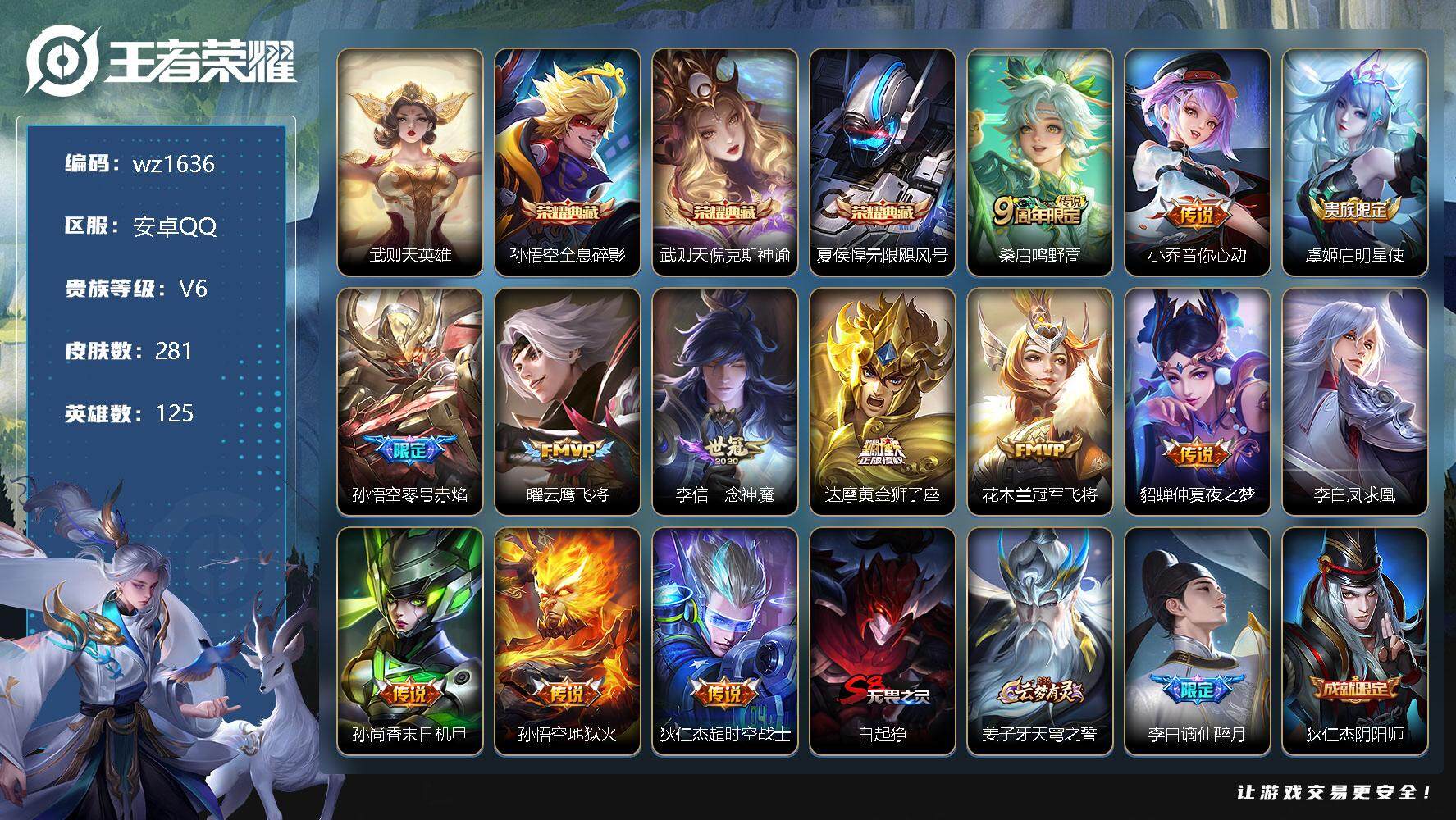 【游戏多多】 【可二次实名】【wz1636】【商品标题】:安卓Q-V6-最强王者段位-125英雄-281皮肤-3典藏-0珍品无双-0无双-0珍品传说-13传说-71史诗 【英雄全皮】:蒙恬全皮,影全皮 【荣耀典藏】:武则天英雄,孙悟空全息碎影,武则天倪克斯神谕,夏侯惇无限飓风号 【传说皮肤】:桑启鸣野蒿,小乔音你心动,虞姬启明星使,孙悟空零号赤焰,曜云鹰飞将,李信一念神魔,达摩黄金狮子座,花木兰冠军飞将,貂蝉仲夏夜之梦,李白凤求凰,孙尚香末日机甲,孙悟空地狱火,狄仁杰超时空战士 【限定皮肤】:白起狰,姜子牙天穹之誓,李白谪仙醉月,狄仁杰阴阳师,虞姬凯尔特女王,赵云皇家上将,墨子神迹守卫,嬴政白昼王子,鲁班七号乒乒小将,庄周蜃楼王,高渐离死亡摇滚,阿轲迷踪丽影,孙膑妖精王,扁鹊炼金王,芈月重明,芈月幻夜卜梦,吕布猎兽之王,夏侯惇朔风刀,甄姬游园惊梦,曹操烛龙,典韦穷奇,典韦蓝屏警告,马可波罗暗影游猎,狄仁杰魔术师,狄仁杰万华元夜,达摩沙漠行僧,项羽海滩派对,老夫子醍醐杖,老夫子航海奇遇记,程咬金演武夺筹,露娜一生所爱,刘邦夺宝奇兵,韩信傲雪梅枪,兰陵王金庭之子,亚瑟潮玩骑士王,孙悟空至尊宝,孙悟空大圣娶亲,孙悟空零号赤焰,牛魔御旌,后羿圣弓游侠,李元芳银河之约,李元芳云中旅人,虞姬启明星使,钟馗驱傩正仪,女娲朔望之晖,干将莫邪真爱魔法,雅典娜单词大作战,雅典娜黎明之约,蔡文姬繁星吟游,太乙真人饕餮,鬼谷子原初探秘者,鬼谷子五谷丰年,黄忠火炮绅士,铠青龙志,苏烈千军破阵,百里玄策原初追逐者,弈星混沌棋,梦奇顽趣,沈梦溪星空之诺,沈梦溪大漠名商,明世隐疑决卦,裴擒虎天狼狩猎者,裴擒虎擒涛扼浪,狂铁御狮,米莱狄御霄,猪八戒西部大镖客,上官婉儿梁祝,嫦娥拒霜思,蒙犽狂想玩偶喵,鲁班大师探海日志,镜匿光追影者,桑启海盐诗旅,艾琳女武神,张良古海寻踪,蒙恬荣光圣徽,鬼谷子天穹祈灯,沈梦溪龙舞盛年,刘邦剑破天穹,程咬金群星魔术团,周瑜熔金海岸 【年限皮肤】:铠青龙志,李白凤求凰 【赛季限定】:庄周蜃楼王,孙膑妖精王,扁鹊炼金王,白起狰,芈月重明,夏侯惇朔风刀,曹操烛龙,典韦穷奇,狄仁杰万华元夜,达摩沙漠行僧,老夫子醍醐杖,程咬金演武夺筹,兰陵王金庭之子,张良古海寻踪,牛魔御旌,李元芳云中旅人,虞姬凯尔特女王,钟馗驱傩正仪,雅典娜黎明之约,太乙真人饕餮,鬼谷子原初探秘者,苏烈千军破阵,百里玄策原初追逐者,弈星混沌棋,梦奇顽趣,沈梦溪大漠名商,明世隐疑决卦,裴擒虎擒涛扼浪,狂铁御狮,米莱狄御霄,鲁班大师探海日志,桑启海盐诗旅,鬼谷子天穹祈灯,蒙恬荣光圣徽,刘邦剑破天穹,姜子牙天穹之誓 【战令限定】:墨子神迹守卫,嬴政白昼王子,阿轲迷踪丽影,芈月幻夜卜梦,吕布猎兽之王,典韦蓝屏警告,马可波罗暗影游猎,老夫子航海奇遇记,刘邦夺宝奇兵,亚瑟潮玩骑士王,后羿圣弓游侠,李元芳银河之约,女娲朔望之晖,干将莫邪真爱魔法,雅典娜单词大作战,黄忠火炮绅士,沈梦溪星空之诺,猪八戒西部大镖客,蒙犽狂想玩偶喵 【史诗皮肤】:鲁班七号电玩小子,赵云皇家上将,赵云未来纪元,貂蝉圣诞恋歌,甄姬冰雪圆舞曲,王昭君偶像歌手,狄仁杰魔术师,廉颇地狱岩魂,宫本武藏鬼剑武藏,孙尚香水果甜心,嬴政摇滚巨星,妲己魅力维加斯,妲己女仆咖啡,墨子金属风暴,吕布圣诞狂欢,刘禅绅士熊喵,李白千年之狐,张飞乱世虎臣,韩信白龙吟,孙悟空至尊宝,花木兰水晶猎龙者,刘邦德古拉伯爵,夏侯惇乘风破浪,兰陵王暗隐猎兽者,诸葛亮黄金分割率,甄姬游园惊梦,亚瑟心灵战警,雅典娜冰冠公主,安琪拉心灵骇客,百里守约特工魅影,铠曙光守护者,蔡文姬舞动绿茵,程咬金功夫厨神,白起星夜王子,阿轲节奏热浪,嬴政白昼王子,铠青龙志,露娜一生所爱,孙悟空大圣娶亲,典韦蓝屏警告,伽罗箭羽风息,裴擒虎天狼狩猎者,狄仁杰鹰眼统帅,上官婉儿梁祝,蔡文姬繁星吟游,李元芳银河之约,娜可露露晚萤,不知火舞魅语,阿轲迷踪丽影,橘右京修罗,马可波罗暗影游猎,蒙犽狂想玩偶喵,百里玄策原初追逐者,老夫子航海奇遇记,鲁班七号乒乒小将,干将莫邪真爱魔法,沈梦溪月团寄思,嫦娥拒霜思,镜匿光追影者,黄忠火炮绅士,雅典娜黎明之约,韩信傲雪梅枪,鬼谷子五谷丰年,梦奇顽趣,刘禅电玩爆裂旋风,蒙恬荣光圣徽,李白谪仙醉月,艾琳陌上桑,牛魔星界战将,阿轲化蝶舞,扁鹊灵蛊蚀心 【其他皮肤】:项羽海滩派对,韩信教廷特使,韩信街头霸王,阿轲致命风华,达摩大发明家,赵云白执事,赵云忍炎影,艾琳女武神,程咬金星际陆战队,白起白色死神,牛魔西部大镖客,武则天东方不败,扁鹊化身博士,宫本武藏未来纪元,安琪拉玩偶对对碰,孙膑天使之翼,姜子牙时尚教父,妲己少女阿狸,典韦黄金武士,亚瑟死亡骑士,达摩拳王,花木兰兔女郎,张飞五福同心,甄姬花好人间,刘备万事如意,宫本武藏万象初新,狄仁杰阴阳师,庄周蜃楼王,刘备纽约教父,高