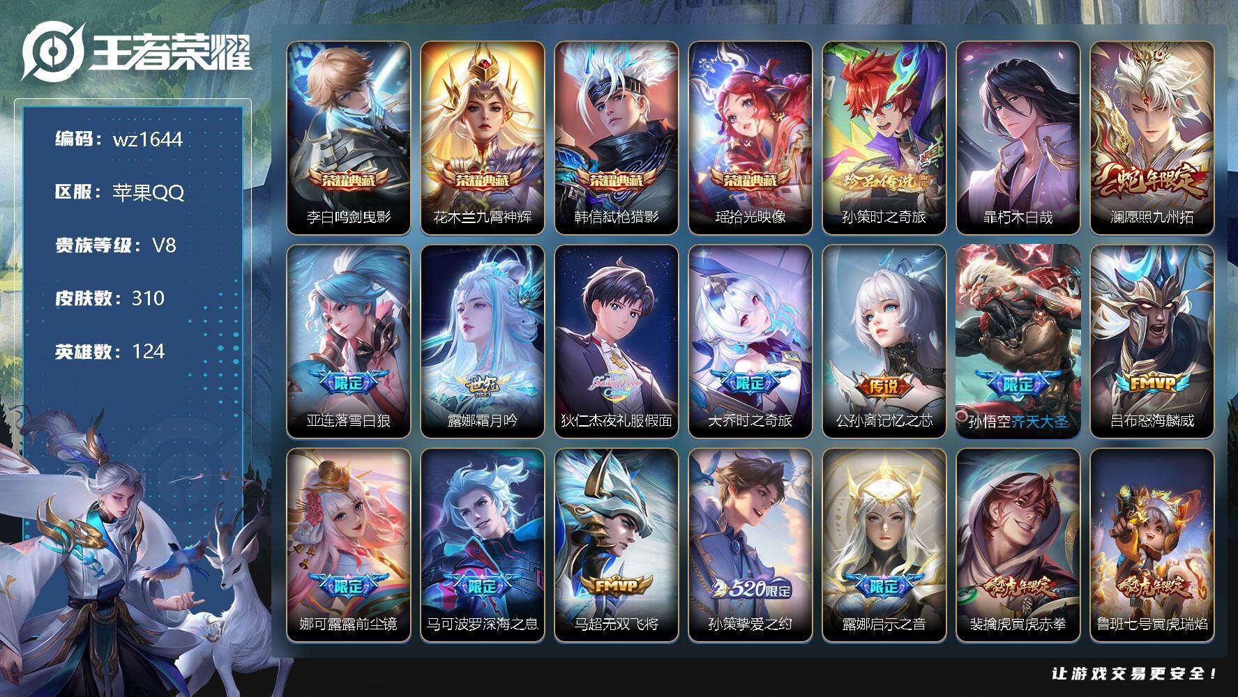 【游戏多多】 【可二次实名】【wz1644】【商品标题】:苹果Q-V8-至尊星耀III段位-124英雄-310皮肤-4典藏-0珍品无双-0无双-2珍品传说-36传说-96史诗 【英雄全皮】:露娜全皮,雅典娜全皮,蒙恬全皮,影全皮 【荣耀典藏】:李白鸣剑曳影,花木兰九霄神辉,韩信弑枪猎影,瑶拾光映像 【珍品传说】:孙策时之奇旅,暃朽木白哉 【传说皮肤】:澜愿照九州拓,亚连落雪白狼,露娜霜月吟,狄仁杰夜礼服假面,大乔时之奇旅,公孙离记忆之芯,孙悟空齐天大圣,吕布怒海麟威,娜可露露前尘镜,马可波罗深海之息,马超无双飞将,孙策挚爱之约,露娜启示之音,裴擒虎寅虎赤拳,鲁班七号寅虎瑞焰,赵云淬星耀世,西施游龙清影,曜李逍遥 ,小乔音你心动,李元芳飞鸢探春,兰陵王默契交锋,镜炽阳神光,虞姬启明星使,曜云鹰飞将,刘备时之恋人,干将莫邪久胜战神,虞姬云霓雀翎,花木兰冠军飞将,后羿黄金射手座,诸葛亮武陵仙君,貂蝉仲夏夜之梦,李白凤求凰,孙尚香末日机甲,宫本武藏地狱之眼,吕布天魔缭乱,狄仁杰超时空战士 【限定皮肤】:姜子牙天穹之誓,杨戬破阵退雄兵,狄仁杰阴阳师,赵云皇家上将,墨子神迹守卫,鲁班七号寅虎瑞焰,钟无艳超时空战士,扁鹊奇幻香踪,白起夜都怪侠,芈月幻夜卜梦,吕布天魔缭乱,元歌无心,甄姬游园惊梦,甄姬落雪兰心,马可波罗深海之息,狄仁杰魔术师,达摩沙漠行僧,项羽海滩派对,老夫子航海奇遇记,程咬金演武夺筹,露娜一生所爱,露娜启示之音,韩信逐梦之影,韩信傲雪梅枪,王昭君凤凰于飞,王昭君午后时光,兰陵王默契交锋,兰陵王金庭之子,花木兰青春决赛季,花木兰瑞麟志,娜可露露前尘镜,孙悟空齐天大圣,后羿圣弓游侠,李元芳云中旅人,虞姬启明星使,钟馗驱傩正仪,杨玉环寅虎心曲,杨戬潮玩骑兵,干将莫邪真爱魔法,雅典娜单词大作战,雅典娜黎明之约,鬼谷子五谷丰年,诸葛亮武陵仙君,大乔时之奇旅,黄忠火炮绅士,铠青龙志,苏烈玄武志,苏烈千军破阵,百里玄策原初追逐者,百里守约朱雀志,梦奇顽趣,公孙离玉兔公主,沈梦溪大漠名商,沈梦溪匿光破解者,明世隐吟游魔法,裴擒虎天狼狩猎者,裴擒虎寅虎赤拳,裴擒虎擒涛扼浪,狂铁电玩高手,瑶山海碧波行,云中君纤云弄巧,云中君时之祈愿,孙策挚爱之约,猪八戒西部大镖客,嫦娥如梦令,嫦娥拒霜思,嫦娥暖冬兔眠,曜李逍遥 ,蒙犽狂想玩偶喵,鲁班大师探海日志,镜匿光追影者,桑启海盐诗旅,暃星界游侠,艾琳女武神,艾琳流音漫舞,司空震地狱燃心,阿古朵江河有灵,张良古海寻踪,狄仁杰夜礼服假面,蒙恬荣光圣徽,高渐离燃音魔法,妲己灵卜魔法,鬼谷子天穹祈灯,姬小满妄想食味,亚连落雪白狼,鲁班七号蔬乡物语,李元芳蔬乡物语,刘邦剑破天穹,程咬金群星魔术团,镜青焰无极,项羽苍威无极,周瑜熔金海岸 【年限皮肤】:百里守约朱雀志,花木兰瑞麟志,铠青龙志,苏烈玄武志,裴擒虎寅虎赤拳,鲁班七号寅虎瑞焰,杨玉环寅虎心曲,王昭君凤凰于飞,李白凤求凰,瑶山海碧波行 【赛季限定】:达摩沙漠行僧,程咬金演武夺筹,兰陵王金庭之子,张良古海寻踪,李元芳云中旅人,钟馗驱傩正仪,雅典娜黎明之约,苏烈千军破阵,百里玄策原初追逐者,梦奇顽趣,沈梦溪大漠名商,裴擒虎擒涛扼浪,鲁班大师探海日志,桑启海盐诗旅,鬼谷子天穹祈灯,蒙恬荣光圣徽,刘邦剑破天穹,姜子牙天穹之誓 【战令限定】:墨子神迹守卫,钟无艳超时空战士,扁鹊奇幻香踪,白起夜都怪侠,芈月幻夜卜梦,甄姬落雪兰心,老夫子航海奇遇记,王昭君午后时光,艾琳流音漫舞,后羿圣弓游侠,杨戬潮玩骑兵,干将莫邪真爱魔法,雅典娜单词大作战,黄忠火炮绅士,明世隐吟游魔法,狂铁电玩高手,猪八戒西部大镖客,嫦娥暖冬兔眠,蒙犽狂想玩偶喵,司空震地狱燃心,暃星界游侠,高渐离燃音魔法,妲己灵卜魔法,鲁班七号蔬乡物语,李元芳蔬乡物语,镜青焰无极,项羽苍威无极 【史诗皮肤】:项羽苍穹之光,露娜紫霞仙子,阿轲暗夜猫娘,赵云皇家上将,赵云未来纪元,貂蝉圣诞恋歌,甄姬冰雪圆舞曲,王昭君偶像歌手,狄仁杰魔术师,廉颇地狱岩魂,宫本武藏鬼剑武藏,孙尚香水果甜心,嬴政摇滚巨星,妲己魅力维加斯,妲己女仆咖啡,墨子龙骑士,墨子金属风暴,刘禅绅士熊喵,曹操幽灵船长,张飞乱世虎臣,王昭君凤凰于飞,花木兰水晶猎龙者,刘邦德古拉伯爵,韩信逐梦之影,夏侯惇乘风破浪,小乔缤纷独角兽,兰陵王暗隐猎兽者,甄姬游园惊梦,亚瑟心灵战警,雅典娜冰冠公主,花木兰青春决赛季,百里守约特工魅影,蔡文姬舞动绿茵,刘禅天才门将,李元芳逐浪之夏,程咬金功夫厨神,白起星夜王子,阿轲节奏热浪,孙策猫狗日记,大乔猫狗日记,铠青龙志,百里守约朱雀志,露娜一生所爱,苏烈玄武志,花木兰瑞麟志,伽罗箭羽风息,裴擒虎天狼狩猎者,狄仁杰鹰眼统帅,公孙离无限星赏官,嫦娥如梦令,小乔青蛇,不知火舞魅语,孙尚香时之恋人,蒙犽狂想玩偶喵,百里玄策原初追逐者,云中君纤云弄巧,西施诗语江南