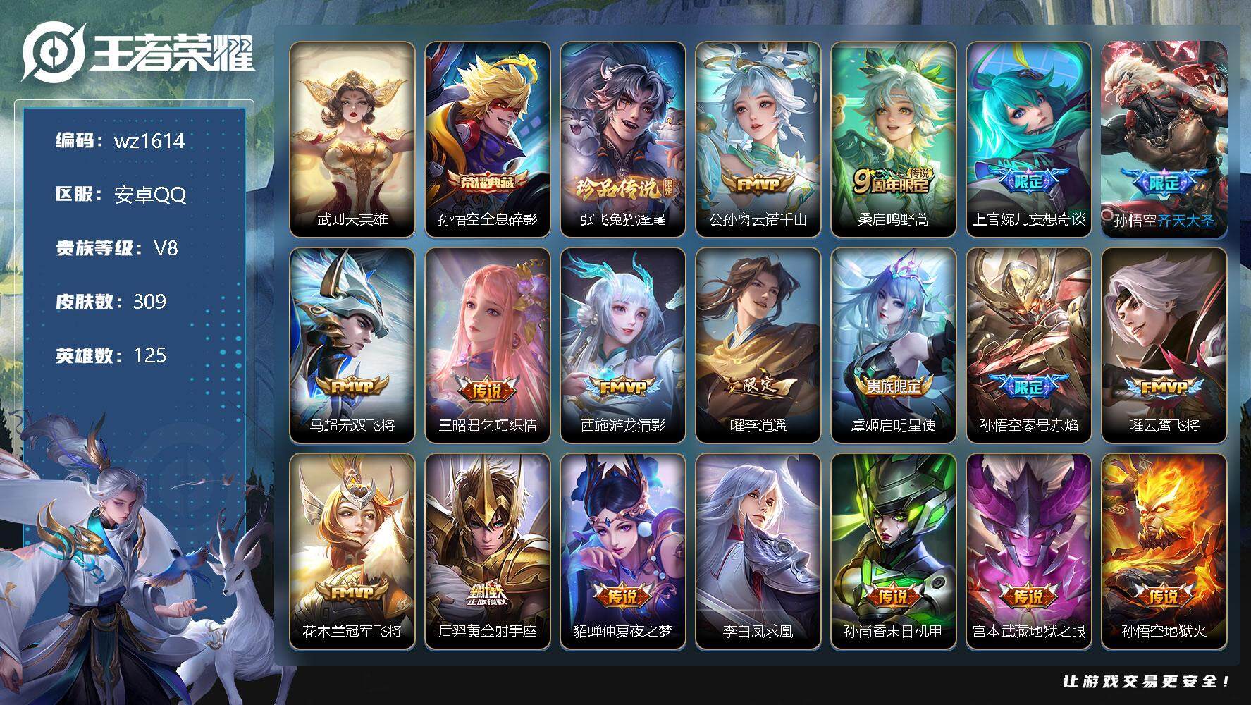 【游戏多多】 【可二次实名】【wz4】【商品标题】:安卓Q-V8-最强王者段位-125英雄-309皮肤-1典藏-0珍品无双-0无双-1珍品传说-18传说-86史诗 【英雄全皮】:钟馗全皮,蒙恬全皮,戈娅全皮 【荣耀典藏】:武则天英雄,孙悟空全息碎影 【珍品传说】:张飞兔狲蓬尾 【传说皮肤】:公孙离云诺千山,桑启鸣野蒿,上官婉儿妄想奇谈,孙悟空齐天大圣,马超无双飞将,王昭君乞巧织情,西施游龙清影,曜李逍遥 ,虞姬启明星使,孙悟空零号赤焰,曜云鹰飞将,花木兰冠军飞将,后羿黄金射手座,貂蝉仲夏夜之梦,李白凤求凰,孙尚香末日机甲,宫本武藏地狱之眼,孙悟空地狱火 【限定皮肤】:狄仁杰阴阳师,赵云皇家上将,赵云百木心枪,孙尚香蔷薇恋人,鲁班七号狮舞东方,阿轲迷踪丽影,钟无艳超时空战士,扁鹊奇幻香踪,白起夜都怪侠,芈月幻夜卜梦,周瑜赤莲之焰,元歌无心,夏侯惇朔风刀,甄姬游园惊梦,甄姬落雪兰心,典韦蓝屏警告,典韦岱宗,马可波罗暗影游猎,狄仁杰魔术师,狄仁杰万华元夜,达摩沙漠行僧,项羽海滩派对,老夫子醍醐杖,程咬金演武夺筹,刘邦夺宝奇兵,韩信飞衡,韩信傲雪梅枪,王昭君午后时光,兰陵王驯魔猎人,兰陵王金庭之子,孙悟空美猴王,孙悟空至尊宝,孙悟空大圣娶亲,孙悟空零号赤焰,孙悟空孙行者,孙悟空齐天大圣,牛魔御旌,李元芳银河之约,李元芳云中旅人,虞姬霸王别姬,虞姬启明星使,钟馗神迹守卫,钟馗驱傩正仪,杨戬潮玩骑兵,女娲朔望之晖,雅典娜单词大作战,鬼谷子原初探秘者,鬼谷子五谷丰年,苏烈千军破阵,百里玄策原初追逐者,百里守约朱雀志,弈星混沌棋,梦奇顽趣,沈梦溪星空之诺,沈梦溪大漠名商,明世隐疑决卦,明世隐吟游魔法,裴擒虎李小龙,裴擒虎擒涛扼浪,狂铁电玩高手,米莱狄御霄,云中君纤云弄巧,盾山御銮,猪八戒西部大镖客,上官婉儿梁祝,上官婉儿妄想奇谈,嫦娥暖冬兔眠,曜李逍遥 ,西施玲珑珍味,蒙犽狂想玩偶喵,鲁班大师探海日志,桑启海盐诗旅,暃星界游侠,戈娅驭风魔法,艾琳女武神,艾琳流音漫舞,司空震地狱燃心,阿古朵江河有灵,张良古海寻踪,蒙犽百解令,蒙恬荣光圣徽,妲己灵卜魔法,鬼谷子天穹祈灯,李元芳蔬乡物语,刘邦剑破天穹,程咬金群星魔术团,关羽决胜骁骑 【年限皮肤】:百里守约朱雀志,孙悟空美猴王,李白凤求凰,韩信飞衡,典韦岱宗 【赛季限定】:夏侯惇朔风刀,狄仁杰万华元夜,达摩沙漠行僧,老夫子醍醐杖,程咬金演武夺筹,兰陵王金庭之子,张良古海寻踪,牛魔御旌,李元芳云中旅人,钟馗驱傩正仪,鬼谷子原初探秘者,苏烈千军破阵,百里玄策原初追逐者,弈星混沌棋,梦奇顽趣,沈梦溪大漠名商,明世隐疑决卦,裴擒虎擒涛扼浪,米莱狄御霄,盾山御銮,鲁班大师探海日志,桑启海盐诗旅,鬼谷子天穹祈灯,蒙恬荣光圣徽,刘邦剑破天穹 【战令限定】:鲁班七号狮舞东方,阿轲迷踪丽影,钟无艳超时空战士,扁鹊奇幻香踪,白起夜都怪侠,芈月幻夜卜梦,周瑜赤莲之焰,甄姬落雪兰心,典韦蓝屏警告,马可波罗暗影游猎,刘邦夺宝奇兵,王昭君午后时光,兰陵王驯魔猎人,艾琳流音漫舞,李元芳银河之约,钟馗神迹守卫,杨戬潮玩骑兵,女娲朔望之晖,雅典娜单词大作战,沈梦溪星空之诺,明世隐吟游魔法,狂铁电玩高手,猪八戒西部大镖客,嫦娥暖冬兔眠,西施玲珑珍味,蒙犽狂想玩偶喵,司空震地狱燃心,暃星界游侠,戈娅驭风魔法,妲己灵卜魔法,李元芳蔬乡物语 【史诗皮肤】:露娜紫霞仙子,赵云皇家上将,赵云未来纪元,貂蝉圣诞恋歌,甄姬冰雪圆舞曲,王昭君偶像歌手,狄仁杰魔术师,廉颇地狱岩魂,宫本武藏鬼剑武藏,孙尚香蔷薇恋人,孙尚香水果甜心,嬴政摇滚巨星,妲己魅力维加斯,妲己女仆咖啡,墨子龙骑士,墨子金属风暴,吕布圣诞狂欢,刘禅绅士熊喵,曹操幽灵船长,李白千年之狐,吕布末日机甲,张飞乱世虎臣,韩信白龙吟,虞姬霸王别姬,孙悟空至尊宝,刘邦德古拉伯爵,夏侯惇乘风破浪,小乔缤纷独角兽,兰陵王暗隐猎兽者,诸葛亮黄金分割率,甄姬游园惊梦,亚瑟心灵战警,雅典娜冰冠公主,安琪拉心灵骇客,铠曙光守护者,刘禅天才门将,李元芳逐浪之夏,程咬金功夫厨神,白起星夜王子,阿轲节奏热浪,孙策猫狗日记,百里守约朱雀志,孙悟空大圣娶亲,典韦蓝屏警告,伽罗箭羽风息,鲁班七号狮舞东方,狄仁杰鹰眼统帅,兰陵王驯魔猎人,上官婉儿梁祝,李元芳银河之约,韩信飞衡,典韦岱宗,小乔青蛇,阿轲迷踪丽影,橘右京修罗,马可波罗暗影游猎,蒙犽狂想玩偶喵,百里玄策原初追逐者,裴擒虎李小龙,云中君纤云弄巧,钟馗乐园奇幻夜,安琪拉时之奇旅,孙悟空孙行者,韩信傲雪梅枪,赵云百木心枪,澜赏金猎手,明世隐吟游魔法,狂铁电玩高手,钟无艳超时空战士,鬼谷子五谷丰年,元歌无心,梦奇顽趣,暃星界游侠,扁鹊奇幻香踪,戈娅驭风魔法,百里守约真我赫兹,司空震地狱燃心,阿古朵江河有灵,蒙犽百解令,妲己灵卜魔法,蒙恬荣光圣徽,关羽决胜骁骑,孙膑茶境仙,姬小满飞车小橘