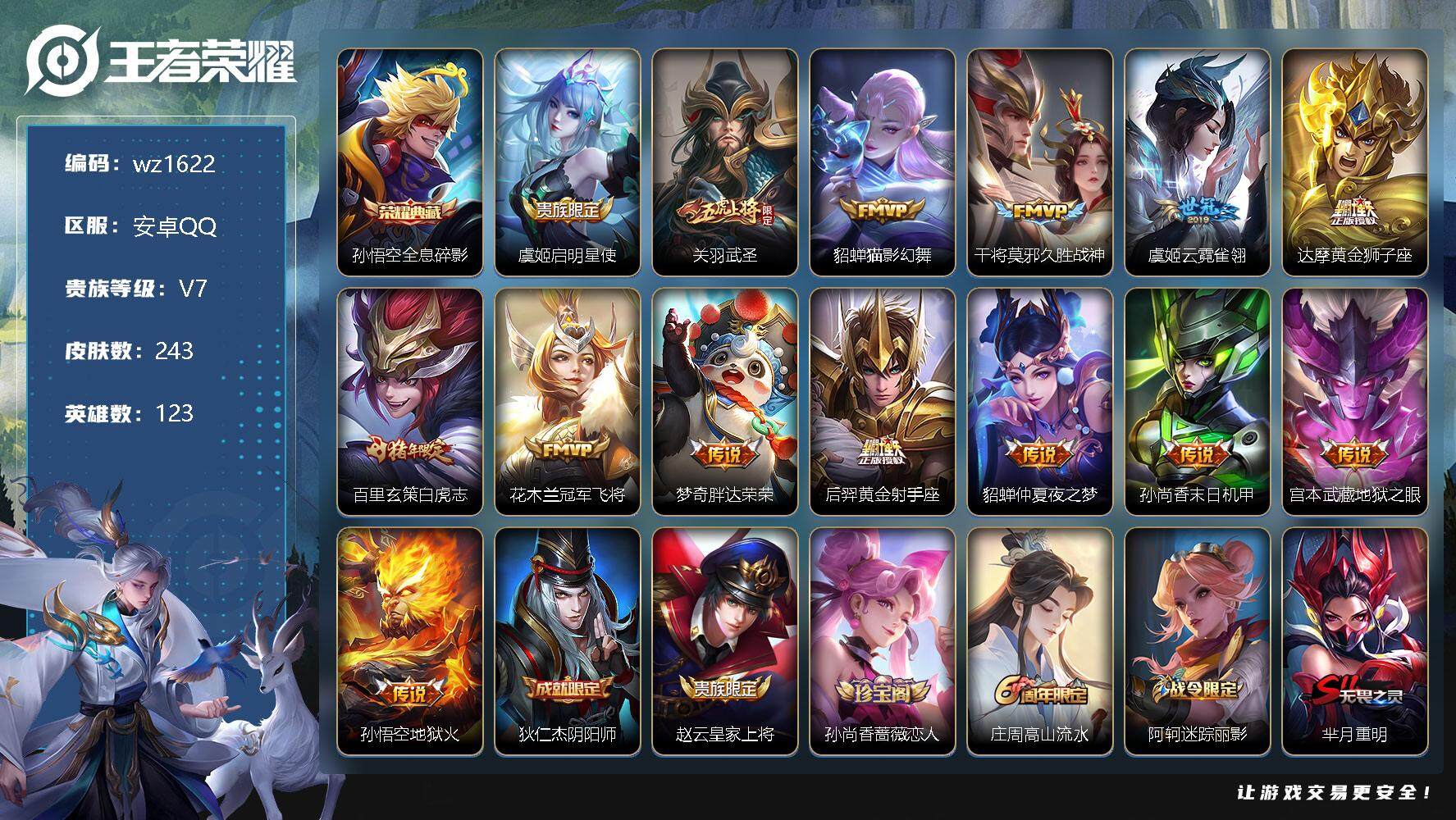 【游戏多多】 【可二次实名】【wz1622】【商品标题】:安卓Q-V7-永恒钻石V段位-123英雄-243皮肤-1典藏-0珍品无双-0无双-0珍品传说-14传说-69史诗 【英雄全皮】:影全皮 【荣耀典藏】:孙悟空全息碎影 【传说皮肤】:虞姬启明星使,关羽武圣,貂蝉猫影幻舞,干将莫邪久胜战神,虞姬云霓雀翎,达摩黄金狮子座,百里玄策白虎志,花木兰冠军飞将,梦奇胖达荣荣,后羿黄金射手座,貂蝉仲夏夜之梦,孙尚香末日机甲,宫本武藏地狱之眼,孙悟空地狱火 【限定皮肤】:狄仁杰阴阳师,赵云皇家上将,孙尚香蔷薇恋人,庄周高山流水,阿轲迷踪丽影,芈月重明,元歌云间偶戏,夏侯惇朔风刀,典韦蓝屏警告,狄仁杰魔术师,狄仁杰万华元夜,达摩星际陆战队,达摩沙漠行僧,项羽海滩派对,老夫子醍醐杖,关羽冰锋战神,关羽武圣,程咬金演武夺筹,刘邦夺宝奇兵,韩信飞衡,兰陵王金庭之子,亚瑟潮玩骑士王,孙悟空至尊宝,孙悟空大圣娶亲,牛魔御旌,后羿如梦令,李元芳银河之约,李元芳云中旅人,虞姬启明星使,钟馗驱傩正仪,杨玉环遇见飞天,干将莫邪冰霜恋舞曲,雅典娜单词大作战,蔡文姬繁星吟游,鬼谷子原初探秘者,黄忠烈魂,苏烈千军破阵,百里玄策白虎志,弈星混沌棋,沈梦溪星空之诺,沈梦溪大漠名商,明世隐疑决卦,裴擒虎李小龙,裴擒虎擒涛扼浪,米莱狄御霄,米莱狄胡桃异想国,盾山御銮,上官婉儿梁祝,上官婉儿天狼绘梦者,蒙犽狂想玩偶喵,鲁班大师探海日志,桑启海盐诗旅,张良古海寻踪,鬼谷子天穹祈灯,刘邦剑破天穹 【年限皮肤】:百里玄策白虎志,韩信飞衡,关羽武圣,黄忠烈魂 【赛季限定】:芈月重明,夏侯惇朔风刀,狄仁杰万华元夜,达摩沙漠行僧,老夫子醍醐杖,程咬金演武夺筹,兰陵王金庭之子,张良古海寻踪,牛魔御旌,李元芳云中旅人,钟馗驱傩正仪,鬼谷子原初探秘者,苏烈千军破阵,弈星混沌棋,沈梦溪大漠名商,明世隐疑决卦,裴擒虎擒涛扼浪,米莱狄御霄,盾山御銮,鲁班大师探海日志,桑启海盐诗旅,鬼谷子天穹祈灯,刘邦剑破天穹 【战令限定】:阿轲迷踪丽影,元歌云间偶戏,典韦蓝屏警告,达摩星际陆战队,刘邦夺宝奇兵,亚瑟潮玩骑士王,李元芳银河之约,雅典娜单词大作战,沈梦溪星空之诺,米莱狄胡桃异想国,蒙犽狂想玩偶喵 【史诗皮肤】:鲁班七号电玩小子,项羽苍穹之光,露娜紫霞仙子,阿轲暗夜猫娘,赵云皇家上将,赵云未来纪元,貂蝉圣诞恋歌,王昭君偶像歌手,狄仁杰魔术师,廉颇地狱岩魂,宫本武藏鬼剑武藏,孙尚香蔷薇恋人,孙尚香水果甜心,嬴政暗夜贵公子,嬴政摇滚巨星,妲己魅力维加斯,妲己女仆咖啡,墨子龙骑士,墨子金属风暴,吕布圣诞狂欢,刘禅绅士熊喵,曹操幽灵船长,李白千年之狐,吕布末日机甲,张飞乱世虎臣,韩信白龙吟,关羽冰锋战神,孙悟空至尊宝,花木兰水晶猎龙者,刘邦德古拉伯爵,夏侯惇乘风破浪,小乔缤纷独角兽,兰陵王暗隐猎兽者,诸葛亮黄金分割率,亚瑟心灵战警,安琪拉心灵骇客,百里守约特工魅影,铠曙光守护者,刘禅天才门将,李元芳逐浪之夏,程咬金功夫厨神,白起星夜王子,阿轲节奏热浪,杨玉环遇见飞天,孙策猫狗日记,干将莫邪冰霜恋舞曲,孙悟空大圣娶亲,典韦蓝屏警告,伽罗箭羽风息,狄仁杰鹰眼统帅,公孙离无限星赏官,上官婉儿梁祝,蔡文姬繁星吟游,李元芳银河之约,韩信飞衡,后羿如梦令,不知火舞魅语,阿轲迷踪丽影,橘右京修罗,黄忠烈魂,孙尚香时之恋人,上官婉儿天狼绘梦者,蒙犽狂想玩偶喵,裴擒虎李小龙,元歌云间偶戏,米莱狄胡桃异想国,沈梦溪月团寄思,庄周高山流水,阿轲化蝶舞 【其他皮肤】:项羽海滩派对,韩信教廷特使,韩信街头霸王,露娜哥特玫瑰,达摩大发明家,赵云白执事,赵云忍炎影,芈月红桃皇后,程咬金爱与正义,白起白色死神,牛魔西部大镖客,扁鹊化身博士,扁鹊救世之瞳,宫本武藏未来纪元,安琪拉玩偶对对碰,姜子牙时尚教父,妲己少女阿狸,典韦黄金武士,亚瑟死亡骑士,达摩拳王,花木兰兔女郎,张飞五福同心,甄姬花好人间,宫本武藏万象初新,后羿阿尔法小队,狄仁杰阴阳师,刘备纽约教父,刘备汉昭烈帝,关羽龙腾万里,钟无艳海滩丽影,王昭君幻想奇妙夜,芈月重明,狂铁命运角斗场,老夫子功夫老勺,孙尚香沉稳之力,诸葛亮掌控之力,李白敏锐之力,鬼谷子幻乐之宴,苏烈坚韧之力,大乔守护之力,米莱狄御霄,明世隐虹云星官,庄周奇妙博物学,牛魔御旌,小乔丁香结,吕布野性能量,盾山御銮,沈梦溪鲨炮海盗猫,夏侯惇朔风刀,沈梦溪星空之诺,弈星混沌棋,哪吒次元突破,鲁班七号黑桃队长,明世隐疑决卦,刘邦夺宝奇兵,盾山圆桌骑士,老夫子醍醐杖,鬼谷子原初探秘者,雅典娜单词大作战,狄仁杰万华元夜,亚瑟潮玩骑士王,刘禅秘密基地,达摩星际陆战队,程咬金演武夺筹,张良缤纷绘卷,钟馗驱傩正仪,鲁班大师乓乓大师,苏烈千军破阵,达摩沙漠行僧,程咬金无双福将,兰陵王金庭之子,沈梦溪大漠名商,蒙恬蔚蓝守将,李元芳云中旅人,桑启海盐诗旅,猪八戒潮玩