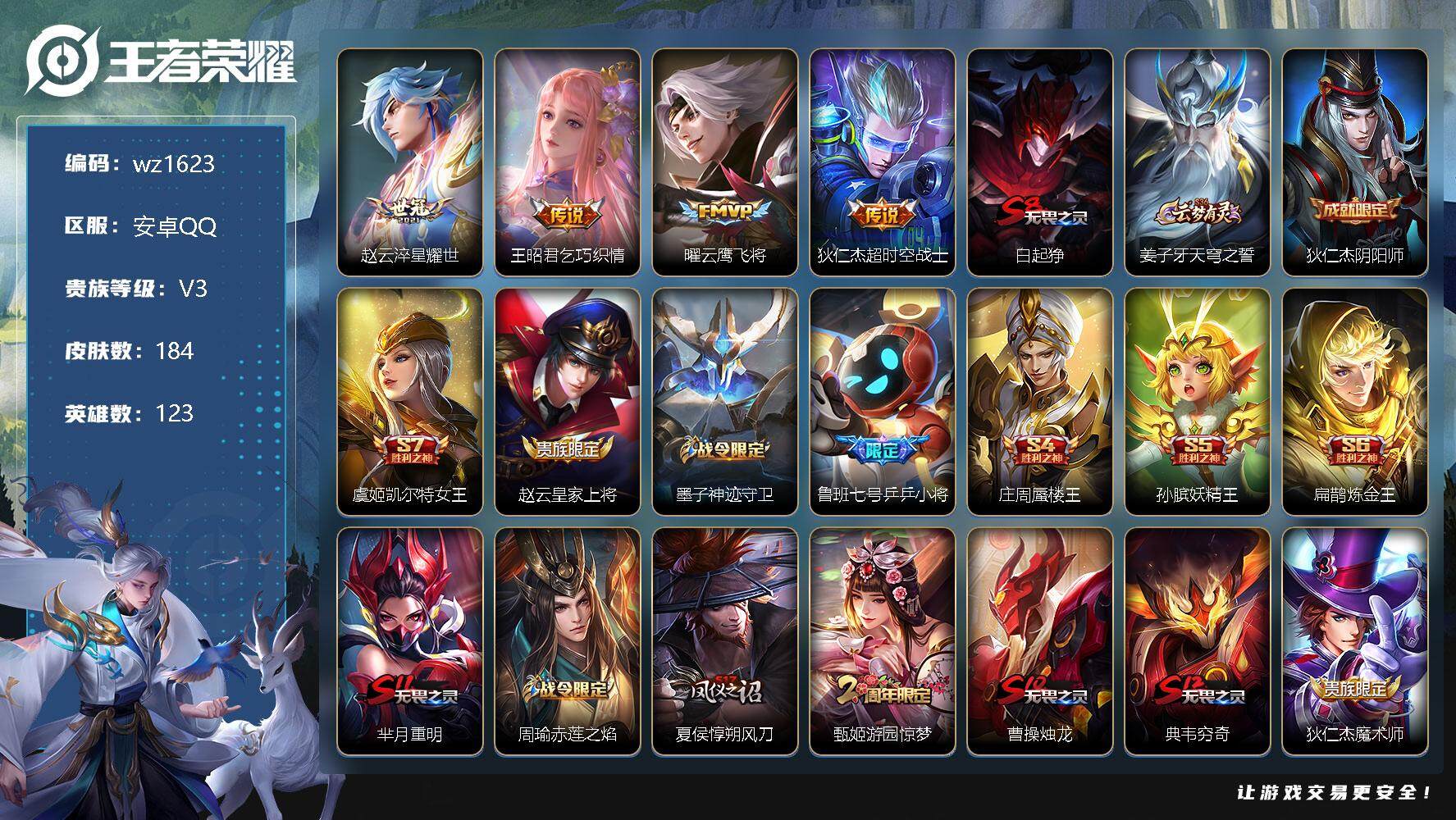 【游戏多多】 【可二次实名】【wz1623】【商品标题】:安卓Q-V3-永恒钻石IV段位-123英雄-184皮肤-0典藏-0珍品无双-0无双-0珍品传说-4传说-43史诗 【传说皮肤】:赵云淬星耀世,王昭君乞巧织情,曜云鹰飞将,狄仁杰超时空战士 【限定皮肤】:白起狰,姜子牙天穹之誓,狄仁杰阴阳师,虞姬凯尔特女王,赵云皇家上将,墨子神迹守卫,鲁班七号乒乒小将,庄周蜃楼王,孙膑妖精王,扁鹊炼金王,芈月重明,周瑜赤莲之焰,夏侯惇朔风刀,甄姬游园惊梦,曹操烛龙,典韦穷奇,狄仁杰魔术师,狄仁杰万华元夜,达摩沙漠行僧,项羽海滩派对,老夫子醍醐杖,老夫子航海奇遇记,程咬金演武夺筹,兰陵王驯魔猎人,兰陵王金庭之子,花木兰青春决赛季,孙悟空大圣娶亲,牛魔御旌,李元芳云中旅人,钟馗驱傩正仪,杨玉环遇见飞天,女娲朔望之晖,干将莫邪胡桃夹子,太乙真人饕餮,鬼谷子原初探秘者,鬼谷子五谷丰年,大乔白鹤梁神女,苏烈千军破阵,弈星混沌棋,公孙离蜜橘之夏,沈梦溪大漠名商,明世隐疑决卦,裴擒虎李小龙,裴擒虎擒涛扼浪,狂铁御狮,米莱狄御霄,伽罗天狼溯光者,盾山御銮,上官婉儿梁祝,鲁班大师探海日志,桑启海盐诗旅,张良古海寻踪,鬼谷子天穹祈灯,刘邦剑破天穹,周瑜熔金海岸 【赛季限定】:庄周蜃楼王,孙膑妖精王,扁鹊炼金王,白起狰,芈月重明,夏侯惇朔风刀,曹操烛龙,典韦穷奇,狄仁杰万华元夜,达摩沙漠行僧,老夫子醍醐杖,程咬金演武夺筹,兰陵王金庭之子,张良古海寻踪,牛魔御旌,李元芳云中旅人,虞姬凯尔特女王,钟馗驱傩正仪,太乙真人饕餮,鬼谷子原初探秘者,苏烈千军破阵,弈星混沌棋,沈梦溪大漠名商,明世隐疑决卦,裴擒虎擒涛扼浪,狂铁御狮,米莱狄御霄,盾山御銮,鲁班大师探海日志,桑启海盐诗旅,鬼谷子天穹祈灯,刘邦剑破天穹,姜子牙天穹之誓 【战令限定】:墨子神迹守卫,周瑜赤莲之焰,老夫子航海奇遇记,兰陵王驯魔猎人,女娲朔望之晖 【史诗皮肤】:赵云皇家上将,赵云未来纪元,貂蝉圣诞恋歌,王昭君偶像歌手,狄仁杰魔术师,孙尚香水果甜心,嬴政摇滚巨星,妲己魅力维加斯,妲己女仆咖啡,墨子金属风暴,吕布圣诞狂欢,刘禅绅士熊喵,曹操幽灵船长,李白千年之狐,吕布末日机甲,刘邦德古拉伯爵,小乔缤纷独角兽,兰陵王暗隐猎兽者,诸葛亮黄金分割率,甄姬游园惊梦,雅典娜冰冠公主,花木兰青春决赛季,铠曙光守护者,蔡文姬舞动绿茵,公孙离蜜橘之夏,李元芳逐浪之夏,杨玉环遇见飞天,孙策猫狗日记,孙悟空大圣娶亲,狄仁杰鹰眼统帅,兰陵王驯魔猎人,上官婉儿梁祝,娜可露露晚萤,不知火舞魅语,瑶遇见神鹿,裴擒虎李小龙,西施诗语江南,百里玄策热力回旋,老夫子航海奇遇记,伽罗天狼溯光者,大乔白鹤梁神女,鲁班七号乒乒小将,鬼谷子五谷丰年 【其他皮肤】:项羽海滩派对,韩信教廷特使,韩信街头霸王,露娜哥特玫瑰,阿轲致命风华,阿轲爱心护理,达摩大发明家,赵云白执事,赵云忍炎影,扁鹊化身博士,安琪拉玩偶对对碰,孙膑天使之翼,姜子牙时尚教父,妲己少女阿狸,典韦黄金武士,亚瑟死亡骑士,达摩拳王,花木兰兔女郎,张飞五福同心,刘备万事如意,宫本武藏万象初新,后羿阿尔法小队,狄仁杰阴阳师,庄周蜃楼王,刘备纽约教父,孙膑妖精王,扁鹊炼金王,关羽龙腾万里,虞姬凯尔特女王,白起狰,钟无艳海滩丽影,太乙真人饕餮,宫本武藏霸王丸,曹操烛龙,王昭君幻想奇妙夜,芈月重明,老夫子功夫老勺,孙尚香沉稳之力,典韦穷奇,李白敏锐之力,鬼谷子幻乐之宴,狂铁御狮,安琪拉如懿,大乔守护之力,米莱狄御霄,明世隐虹云星官,牛魔御旌,女娲朔望之晖,小乔丁香结,盾山御銮,沈梦溪鲨炮海盗猫,姜子牙炽热元素使,夏侯惇朔风刀,周瑜赤莲之焰,弈星混沌棋,哪吒次元突破,明世隐疑决卦,盾山圆桌骑士,老夫子醍醐杖,鬼谷子原初探秘者,狄仁杰万华元夜,刘禅秘密基地,程咬金演武夺筹,钟馗驱傩正仪,墨子神迹守卫,鲁班大师乓乓大师,苏烈千军破阵,干将莫邪胡桃夹子,达摩沙漠行僧,程咬金无双福将,兰陵王金庭之子,沈梦溪大漠名商,蒙恬蔚蓝守将,李元芳云中旅人,桑启海盐诗旅,猪八戒潮玩探月行,裴擒虎擒涛扼浪,鲁班大师探海日志,姬小满零食大作战,李元芳妄想特派,哪吒热血海滩,张良古海寻踪,后羿完美运算,鬼谷子天穹祈灯,廉颇功夫炙烤,刘邦剑破天穹,姜子牙天穹之誓,周瑜熔金海岸,东皇太一噬灭天穹,太乙真人谧流熔炉,姜子牙星梦巡礼,少司缘灵卦秘语,鲁班七号福禄兄弟,鲁班七号木偶奇遇记,高渐离金属狂潮,露娜绯红之刃,老夫子潮流仙人,王昭君精灵公主,张良一千零一夜,小乔万圣前夜,孙悟空西部大镖客,后羿精灵王,李白范海辛,钟馗地府判官,李元芳特种部队,刘邦圣殿之光,虞姬加勒比小姐,蔡文姬蔷薇王座,夏侯惇战争骑士,雅典娜战争女神,马可波罗激情绿茵,杨戬埃及法老,诸葛亮星航指挥官,黄忠芝加哥教父,东皇太一东海龙王,干将莫邪第七人偶,鬼谷子阿摩司公爵,铠龙域领主,
