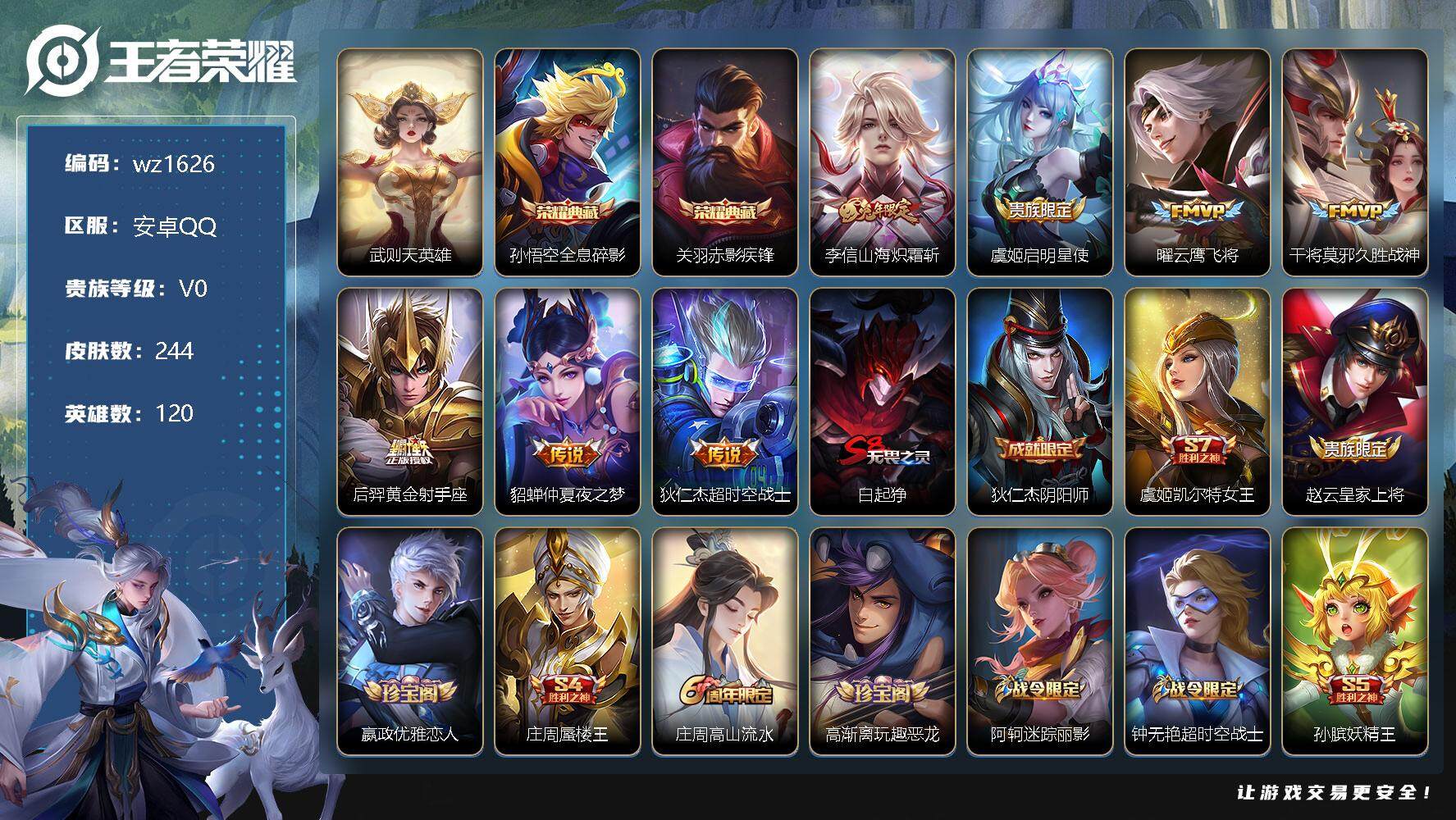 【游戏多多】 【可二次实名】【wz1626】【商品标题】:安卓Q-V0-荣耀黄金IV段位-120英雄-244皮肤-2典藏-0珍品无双-0无双-0珍品传说-7传说-67史诗 【英雄全皮】:猪八戒全皮,蒙恬全皮 【荣耀典藏】:武则天英雄,孙悟空全息碎影,关羽赤影疾锋 【传说皮肤】:李信山海炽霜斩,虞姬启明星使,曜云鹰飞将,干将莫邪久胜战神,后羿黄金射手座,貂蝉仲夏夜之梦,狄仁杰超时空战士 【限定皮肤】:白起狰,狄仁杰阴阳师,虞姬凯尔特女王,赵云皇家上将,嬴政优雅恋人,庄周蜃楼王,庄周高山流水,高渐离玩趣恶龙,阿轲迷踪丽影,钟无艳超时空战士,孙膑妖精王,扁鹊炼金王,芈月幻夜卜梦,周瑜赤莲之焰,元歌无心,夏侯惇朔风刀,甄姬游园惊梦,甄姬落雪兰心,曹操烛龙,典韦穷奇,马可波罗暗影游猎,狄仁杰魔术师,狄仁杰万华元夜,达摩沙漠行僧,项羽海滩派对,老夫子醍醐杖,程咬金演武夺筹,刘邦夺宝奇兵,韩信傲雪梅枪,兰陵王金庭之子,牛魔御旌,李元芳云中旅人,虞姬启明星使,钟馗驱傩正仪,杨玉环遇见飞天,女娲朔望之晖,雅典娜黎明之约,太乙真人饕餮,鬼谷子原初探秘者,鬼谷子五谷丰年,黄忠火炮绅士,铠青龙志,苏烈千军破阵,百里玄策原初追逐者,弈星混沌棋,梦奇顽趣,沈梦溪大漠名商,明世隐疑决卦,裴擒虎天狼狩猎者,裴擒虎李小龙,裴擒虎擒涛扼浪,狂铁御狮,米莱狄御霄,云中君纤云弄巧,李信山海炽霜斩,盾山御銮,猪八戒西部大镖客,猪八戒猪悟能,上官婉儿梁祝,上官婉儿天狼绘梦者,嫦娥拒霜思,鲁班大师探海日志,桑启海盐诗旅,阿古朵江河有灵,张良古海寻踪,蒙犽百解令,蒙恬荣光圣徽,鬼谷子天穹祈灯,沈梦溪龙舞盛年,鲁班七号蔬乡物语,李元芳蔬乡物语,刘邦剑破天穹,程咬金群星魔术团 【年限皮肤】:铠青龙志,李信山海炽霜斩 【赛季限定】:庄周蜃楼王,孙膑妖精王,扁鹊炼金王,白起狰,夏侯惇朔风刀,曹操烛龙,典韦穷奇,狄仁杰万华元夜,达摩沙漠行僧,老夫子醍醐杖,程咬金演武夺筹,兰陵王金庭之子,张良古海寻踪,牛魔御旌,李元芳云中旅人,虞姬凯尔特女王,钟馗驱傩正仪,雅典娜黎明之约,太乙真人饕餮,鬼谷子原初探秘者,苏烈千军破阵,百里玄策原初追逐者,弈星混沌棋,梦奇顽趣,沈梦溪大漠名商,明世隐疑决卦,裴擒虎擒涛扼浪,狂铁御狮,米莱狄御霄,盾山御銮,鲁班大师探海日志,桑启海盐诗旅,鬼谷子天穹祈灯,蒙恬荣光圣徽,刘邦剑破天穹 【战令限定】:阿轲迷踪丽影,钟无艳超时空战士,芈月幻夜卜梦,周瑜赤莲之焰,甄姬落雪兰心,马可波罗暗影游猎,刘邦夺宝奇兵,女娲朔望之晖,黄忠火炮绅士,猪八戒西部大镖客,鲁班七号蔬乡物语,李元芳蔬乡物语 【史诗皮肤】:露娜紫霞仙子,阿轲暗夜猫娘,赵云皇家上将,赵云未来纪元,甄姬冰雪圆舞曲,王昭君偶像歌手,狄仁杰魔术师,廉颇地狱岩魂,宫本武藏鬼剑武藏,孙尚香水果甜心,嬴政优雅恋人,嬴政摇滚巨星,妲己魅力维加斯,墨子金属风暴,曹操幽灵船长,李白千年之狐,吕布末日机甲,花木兰水晶猎龙者,夏侯惇乘风破浪,小乔缤纷独角兽,兰陵王暗隐猎兽者,诸葛亮黄金分割率,甄姬游园惊梦,雅典娜冰冠公主,安琪拉心灵骇客,百里守约特工魅影,蔡文姬舞动绿茵,李元芳逐浪之夏,程咬金功夫厨神,白起星夜王子,杨玉环遇见飞天,孙策猫狗日记,铠青龙志,伽罗箭羽风息,裴擒虎天狼狩猎者,狄仁杰鹰眼统帅,公孙离无限星赏官,上官婉儿梁祝,娜可露露晚萤,不知火舞魅语,阿轲迷踪丽影,橘右京修罗,孙尚香时之恋人,上官婉儿天狼绘梦者,马可波罗暗影游猎,百里玄策原初追逐者,裴擒虎李小龙,云中君纤云弄巧,猪八戒猪悟能,庄周高山流水,嫦娥拒霜思,黄忠火炮绅士,雅典娜黎明之约,韩信傲雪梅枪,夏洛特永昼,澜赏金猎手,钟无艳超时空战士,鬼谷子五谷丰年,阿古朵顽趣,元歌无心,梦奇顽趣,刘禅电玩爆裂旋风,阿古朵江河有灵,蒙犽百解令,蒙恬荣光圣徽,鲁班七号蔬乡物语,黄忠怒海争锋 【其他皮肤】:项羽海滩派对,韩信教廷特使,韩信街头霸王,阿轲致命风华,达摩大发明家,赵云白执事,芈月红桃皇后,白起白色死神,扁鹊化身博士,孙膑天使之翼,姜子牙时尚教父,妲己少女阿狸,典韦黄金武士,亚瑟死亡骑士,达摩拳王,花木兰兔女郎,张飞五福同心,刘备万事如意,宫本武藏万象初新,后羿阿尔法小队,狄仁杰阴阳师,庄周蜃楼王,刘备纽约教父,孙膑妖精王,刘备汉昭烈帝,扁鹊炼金王,关羽龙腾万里,虞姬凯尔特女王,白起狰,钟无艳海滩丽影,太乙真人饕餮,宫本武藏霸王丸,曹操烛龙,老夫子功夫老勺,典韦穷奇,诸葛亮掌控之力,鬼谷子幻乐之宴,狂铁御狮,安琪拉如懿,苏烈坚韧之力,大乔守护之力,项羽科学大爆炸,米莱狄御霄,明世隐虹云星官,牛魔御旌,女娲朔望之晖,小乔丁香结,盾山御銮,孙膑归虚梦演,高渐离玩趣恶龙,沈梦溪鲨炮海盗猫,姜子牙炽热元素使,夏侯惇朔风刀,周瑜赤莲之焰,弈星混沌棋,哪吒次元突破,明世隐疑决卦,刘邦夺宝奇兵,盾山