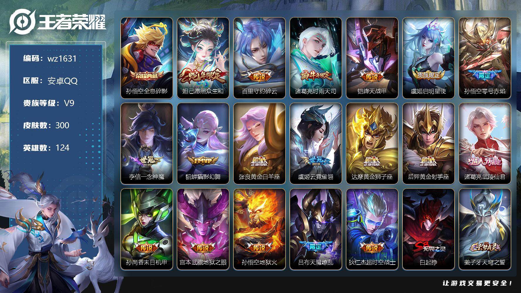 【游戏多多】 【可二次实名】【wz1631】【商品标题】:安卓Q-V9-至尊星耀II段位-124英雄-300皮肤-1典藏-0珍品无双-0无双-0珍品传说-18传说-76史诗 【荣耀典藏】:孙悟空全息碎影 【传说皮肤】:妲己愿照众生和,百里守约碎云,诸葛亮时雨天司,铠绛天战甲,虞姬启明星使,孙悟空零号赤焰,李信一念神魔,貂蝉猫影幻舞,张良黄金白羊座,虞姬云霓雀翎,达摩黄金狮子座,后羿黄金射手座,诸葛亮武陵仙君,孙尚香末日机甲,宫本武藏地狱之眼,孙悟空地狱火,吕布天魔缭乱,狄仁杰超时空战士 【限定皮肤】:白起狰,姜子牙天穹之誓,狄仁杰阴阳师,赵云皇家上将,赵云龙胆,嬴政白昼王子,孙尚香蔷薇恋人,鲁班七号狮舞东方,阿轲迷踪丽影,钟无艳超时空战士,白起夜都怪侠,芈月重明,吕布天魔缭乱,吕布猎兽之王,吕布御风骁将,周瑜赤莲之焰,元歌无心,夏侯惇朔风刀,甄姬落雪兰心,曹操烛龙,典韦穷奇,典韦蓝屏警告,典韦岱宗,马可波罗暗影游猎,狄仁杰魔术师,狄仁杰万华元夜,达摩沙漠行僧,项羽海滩派对,老夫子醍醐杖,程咬金演武夺筹,刘邦夺宝奇兵,韩信飞衡,兰陵王驯魔猎人,兰陵王金庭之子,孙悟空美猴王,孙悟空至尊宝,孙悟空大圣娶亲,孙悟空零号赤焰,孙悟空孙行者,牛魔御旌,李元芳银河之约,李元芳云中旅人,虞姬启明星使,钟馗神迹守卫,钟馗驱傩正仪,杨玉环遇见飞天,女娲朔望之晖,蔡文姬繁星吟游,太乙真人饕餮,鬼谷子原初探秘者,鬼谷子五谷丰年,诸葛亮武陵仙君,诸葛亮时雨天司,黄忠烈魂,苏烈千军破阵,百里玄策原初追逐者,弈星混沌棋,沈梦溪星空之诺,沈梦溪大漠名商,明世隐疑决卦,裴擒虎擒涛扼浪,狂铁御狮,米莱狄御霄,云中君纤云弄巧,盾山御銮,猪八戒西部大镖客,上官婉儿梁祝,鲁班大师探海日志,桑启海盐诗旅,艾琳女武神,阿古朵江河有灵,张良古海寻踪,鬼谷子天穹祈灯,沈梦溪龙舞盛年,刘邦剑破天穹,周瑜熔金海岸 【年限皮肤】:孙悟空美猴王,吕布御风骁将,诸葛亮时雨天司,韩信飞衡,典韦岱宗,黄忠烈魂,赵云龙胆 【赛季限定】:白起狰,芈月重明,夏侯惇朔风刀,曹操烛龙,典韦穷奇,狄仁杰万华元夜,达摩沙漠行僧,老夫子醍醐杖,程咬金演武夺筹,兰陵王金庭之子,张良古海寻踪,牛魔御旌,李元芳云中旅人,钟馗驱傩正仪,太乙真人饕餮,鬼谷子原初探秘者,苏烈千军破阵,百里玄策原初追逐者,弈星混沌棋,沈梦溪大漠名商,明世隐疑决卦,裴擒虎擒涛扼浪,狂铁御狮,米莱狄御霄,盾山御銮,鲁班大师探海日志,桑启海盐诗旅,鬼谷子天穹祈灯,刘邦剑破天穹,姜子牙天穹之誓 【战令限定】:嬴政白昼王子,鲁班七号狮舞东方,阿轲迷踪丽影,钟无艳超时空战士,白起夜都怪侠,吕布猎兽之王,周瑜赤莲之焰,甄姬落雪兰心,典韦蓝屏警告,马可波罗暗影游猎,刘邦夺宝奇兵,兰陵王驯魔猎人,李元芳银河之约,钟馗神迹守卫,女娲朔望之晖,沈梦溪星空之诺,猪八戒西部大镖客 【史诗皮肤】:鲁班七号电玩小子,项羽苍穹之光,阿轲暗夜猫娘,赵云皇家上将,赵云未来纪元,貂蝉圣诞恋歌,甄姬冰雪圆舞曲,王昭君偶像歌手,狄仁杰魔术师,廉颇地狱岩魂,宫本武藏鬼剑武藏,孙尚香蔷薇恋人,孙尚香水果甜心,嬴政暗夜贵公子,嬴政摇滚巨星,妲己魅力维加斯,妲己女仆咖啡,墨子龙骑士,吕布圣诞狂欢,曹操幽灵船长,吕布末日机甲,张飞乱世虎臣,孙悟空至尊宝,花木兰水晶猎龙者,刘邦德古拉伯爵,夏侯惇乘风破浪,小乔缤纷独角兽,兰陵王暗隐猎兽者,诸葛亮黄金分割率,亚瑟心灵战警,雅典娜冰冠公主,安琪拉心灵骇客,百里守约特工魅影,铠曙光守护者,刘禅天才门将,李元芳逐浪之夏,程咬金功夫厨神,白起星夜王子,阿轲节奏热浪,杨玉环遇见飞天,嬴政白昼王子,孙策猫狗日记,孙悟空大圣娶亲,典韦蓝屏警告,伽罗箭羽风息,鲁班七号狮舞东方,狄仁杰鹰眼统帅,公孙离无限星赏官,兰陵王驯魔猎人,上官婉儿梁祝,蔡文姬繁星吟游,李元芳银河之约,娜可露露晚萤,韩信飞衡,典韦岱宗,不知火舞魅语,阿轲迷踪丽影,橘右京修罗,赵云龙胆,黄忠烈魂,孙尚香时之恋人,马可波罗暗影游猎,百里玄策原初追逐者,云中君纤云弄巧,吕布御风骁将,沈梦溪月团寄思,安琪拉时之奇旅,孙悟空孙行者,司马懿暗渊魔法,夏洛特永昼,钟无艳超时空战士,鬼谷子五谷丰年,元歌无心,阿古朵江河有灵,赵怀真器灵浮梦炉,狂铁龙之律动 【其他皮肤】:项羽海滩派对,韩信教廷特使,韩信街头霸王,露娜哥特玫瑰,阿轲爱心护理,达摩大发明家,赵云白执事,赵云忍炎影,芈月红桃皇后,艾琳女武神,程咬金星际陆战队,程咬金爱与正义,白起白色死神,牛魔西部大镖客,扁鹊化身博士,扁鹊救世之瞳,宫本武藏未来纪元,安琪拉玩偶对对碰,姜子牙时尚教父,妲己少女阿狸,典韦黄金武士,亚瑟死亡骑士,达摩拳王,孙悟空美猴王,花木兰兔女郎,张飞五福同心,甄姬花好人间,刘备万事如意,宫本武藏万象初新,后羿阿尔法小队,狄仁杰阴阳师,刘备纽约教父,刘备