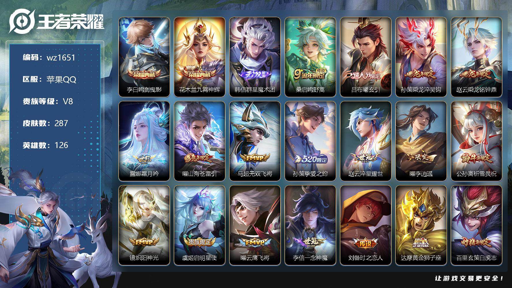 【游戏多多】 【可二次实名】【wz1651】【商品标题】:苹果Q-V8-最强王者段位-126英雄-287皮肤-2典藏-0珍品无双-1无双-0珍品传说-19传说-89史诗 【英雄全皮】:刘备全皮,蒙恬全皮,影全皮 【荣耀典藏】:李白鸣剑曳影,花木兰九霄神辉 【无双皮肤】:韩信群星魔术团 【传说皮肤】:桑启鸣野蒿,吕布曦玄引,孙策乘龙淬吴钩,赵云乘龙铭钟鼎,露娜霜月吟,曜山海苍雷引,马超无双飞将,孙策挚爱之约,赵云淬星耀世,曜李逍遥 ,公孙离祈雪灵祝,镜炽阳神光,虞姬启明星使,曜云鹰飞将,李信一念神魔,刘备时之恋人,达摩黄金狮子座,百里玄策白虎志,宫本武藏地狱之眼 【限定皮肤】:姜子牙天穹之誓,狄仁杰阴阳师,赵云皇家上将,孙尚香蔷薇恋人,庄周高山流水,高渐离死亡摇滚,钟无艳王者之锤,白起夜都怪侠,芈月幻夜卜梦,元歌云间偶戏,马可波罗暗影游猎,马可波罗山海玄木吟,狄仁杰魔术师,狄仁杰万华元夜,达摩沙漠行僧,项羽海滩派对,老夫子醍醐杖,程咬金演武夺筹,王昭君午后时光,兰陵王金庭之子,花木兰瑞麟志,亚瑟潮玩骑士王,孙悟空孙行者,刘备百相守梦,李元芳银河之约,李元芳云中旅人,虞姬启明星使,钟馗驱傩正仪,雅典娜黎明之约,太乙真人华丽摇滚,鬼谷子原初探秘者,鬼谷子五谷丰年,黄忠火炮绅士,苏烈千军破阵,百里玄策白虎志,百里玄策原初追逐者,梦奇顽趣,公孙离祈雪灵祝,沈梦溪大漠名商,明世隐吟游魔法,裴擒虎李小龙,裴擒虎擒涛扼浪,狂铁电玩高手,云中君纤云弄巧,孙策挚爱之约,猪八戒猪悟能,嫦娥拒霜思,嫦娥暖冬兔眠,曜李逍遥 ,曜山海苍雷引,西施玲珑珍味,鲁班大师探海日志,镜匿光追影者,桑启海盐诗旅,暃星界游侠,艾琳女武神,艾琳流音漫舞,司空震地狱燃心,阿古朵江河有灵,张良古海寻踪,蒙犽百解令,蒙恬荣光圣徽,高渐离燃音魔法,妲己灵卜魔法,鬼谷子天穹祈灯,孙策乘龙淬吴钩,赵云乘龙铭钟鼎,吕布曦玄引,沈梦溪龙舞盛年,鲁班七号蔬乡物语,李元芳蔬乡物语,刘邦剑破天穹,程咬金群星魔术团,韩信群星魔术团,镜青焰无极,项羽苍威无极,海诺心动手记,刘备异域游侠,周瑜熔金海岸 【年限皮肤】:百里玄策白虎志,花木兰瑞麟志,公孙离祈雪灵祝,马超神威,马可波罗山海玄木吟,曜山海苍雷引,孙策乘龙淬吴钩,赵云乘龙铭钟鼎 【赛季限定】:狄仁杰万华元夜,达摩沙漠行僧,老夫子醍醐杖,程咬金演武夺筹,兰陵王金庭之子,张良古海寻踪,李元芳云中旅人,钟馗驱傩正仪,雅典娜黎明之约,鬼谷子原初探秘者,苏烈千军破阵,百里玄策原初追逐者,梦奇顽趣,沈梦溪大漠名商,裴擒虎擒涛扼浪,鲁班大师探海日志,桑启海盐诗旅,鬼谷子天穹祈灯,蒙恬荣光圣徽,刘邦剑破天穹,姜子牙天穹之誓 【战令限定】:白起夜都怪侠,芈月幻夜卜梦,元歌云间偶戏,马可波罗暗影游猎,王昭君午后时光,艾琳流音漫舞,亚瑟潮玩骑士王,李元芳银河之约,黄忠火炮绅士,明世隐吟游魔法,狂铁电玩高手,嫦娥暖冬兔眠,西施玲珑珍味,司空震地狱燃心,暃星界游侠,高渐离燃音魔法,妲己灵卜魔法,鲁班七号蔬乡物语,李元芳蔬乡物语,镜青焰无极,项羽苍威无极 【史诗皮肤】:项羽苍穹之光,露娜紫霞仙子,阿轲暗夜猫娘,钟无艳王者之锤,赵云皇家上将,赵云未来纪元,貂蝉圣诞恋歌,甄姬冰雪圆舞曲,王昭君偶像歌手,狄仁杰魔术师,廉颇地狱岩魂,宫本武藏鬼剑武藏,孙尚香蔷薇恋人,孙尚香水果甜心,嬴政摇滚巨星,妲己魅力维加斯,妲己女仆咖啡,墨子龙骑士,墨子金属风暴,吕布圣诞狂欢,曹操幽灵船长,李白千年之狐,吕布末日机甲,张飞乱世虎臣,花木兰水晶猎龙者,刘邦德古拉伯爵,夏侯惇乘风破浪,小乔缤纷独角兽,兰陵王暗隐猎兽者,亚瑟心灵战警,雅典娜冰冠公主,百里守约特工魅影,铠曙光守护者,蔡文姬舞动绿茵,刘禅天才门将,李元芳逐浪之夏,程咬金功夫厨神,白起星夜王子,阿轲节奏热浪,孙策猫狗日记,花木兰瑞麟志,狄仁杰鹰眼统帅,李元芳银河之约,娜可露露晚萤,不知火舞魅语,橘右京修罗,马超神威,马可波罗暗影游猎,百里玄策原初追逐者,裴擒虎李小龙,云中君纤云弄巧,元歌云间偶戏,杨戬天秀启明,安琪拉时之奇旅,孙悟空孙行者,猪八戒猪悟能,庄周高山流水,司马懿暗渊魔法,嫦娥拒霜思,镜匿光追影者,黄忠火炮绅士,雅典娜黎明之约,澜赏金猎手,明世隐吟游魔法,狂铁电玩高手,鬼谷子五谷丰年,梦奇顽趣,暃星界游侠,马可波罗山海玄木吟,刘备百相守梦,刘禅电玩爆裂旋风,司空震地狱燃心,阿古朵江河有灵,蒙犽百解令,妲己灵卜魔法,高渐离燃音魔法,蒙恬荣光圣徽,鲁班七号蔬乡物语,镜青焰无极,海诺心动手记,大司命东方月初,亚连破空之剑,艾琳陌上桑,牛魔星界战将,孙膑茶境仙,弈星万物之道,赵怀真器灵浮梦炉,阿轲化蝶舞,扁鹊灵蛊蚀心,公孙离涂山容容 【其他皮肤】:项羽海滩派对,韩信教廷特使,韩信街头霸王,达摩大发明家,赵云白执事,赵云忍炎影,芈月红桃皇后,艾琳女武神,程