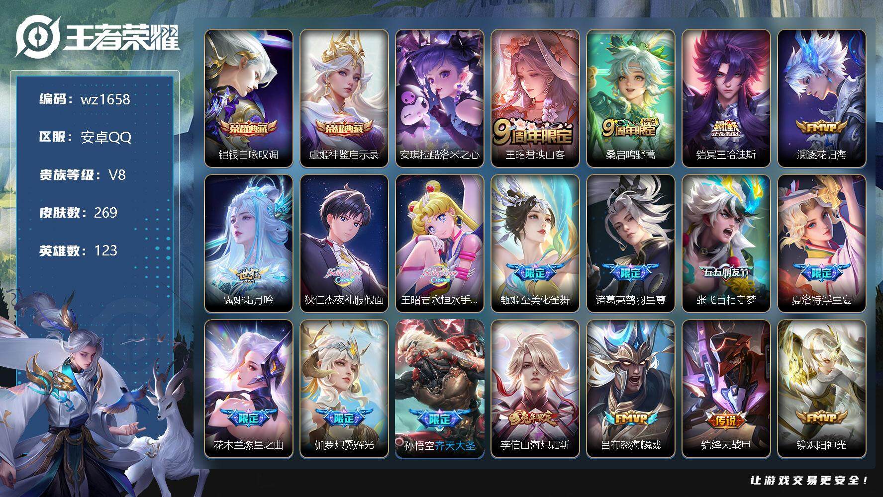 【游戏多多】 【可二次实名】【wz1658】【商品标题】:安卓Q-V8-永恒钻石I段位-123英雄-269皮肤-2典藏-0珍品无双-0无双-1珍品传说-23传说-56史诗 【英雄全皮】:李信全皮 【荣耀典藏】:铠银白咏叹调,虞姬神鉴启示录 【珍品传说】:安琪拉酷洛米之心 【传说皮肤】:王昭君映山客,桑启鸣野蒿,铠冥王哈迪斯,澜逐花归海,露娜霜月吟,狄仁杰夜礼服假面,王昭君永恒水手月亮,甄姬至美化雀舞,诸葛亮鹤羽星尊,张飞百相守梦,夏洛特浮生妄,花木兰燃星之曲,伽罗炽翼辉光,孙悟空齐天大圣,李信山海炽霜斩,吕布怒海麟威,铠绛天战甲,镜炽阳神光,虞姬启明星使,李信一念神魔,貂蝉仲夏夜之梦,宫本武藏地狱之眼,孙悟空地狱火 【限定皮肤】:铠冥王哈迪斯,暃埋骨钱,大乔绒语心约,狄仁杰阴阳师,赵云皇家上将,墨子降魔,阿轲迷踪丽影,钟无艳超时空战士,扁鹊奇幻香踪,白起夜都怪侠,芈月幻夜卜梦,元歌无心,甄姬游园惊梦,甄姬落雪兰心,甄姬至美化雀舞,狄仁杰魔术师,达摩星际陆战队,达摩沙漠行僧,项羽海滩派对,关羽百相守梦,程咬金演武夺筹,王昭君午后时光,兰陵王金庭之子,花木兰燃星之曲,孙悟空齐天大圣,刘备百相守梦,张飞百相守梦,李元芳云中旅人,虞姬启明星使,杨戬潮玩骑兵,鬼谷子五谷丰年,诸葛亮鹤羽星尊,苏烈千军破阵,沈梦溪大漠名商,明世隐吟游魔法,裴擒虎擒涛扼浪,狂铁电玩高手,云中君纤云弄巧,李信山海炽霜斩,伽罗炽翼辉光,嫦娥拒霜思,嫦娥暖冬兔眠,西施玲珑珍味,鲁班大师探海日志,桑启海盐诗旅,夏洛特浮生妄,暃星界游侠,戈娅驭风魔法,艾琳女武神,艾琳流音漫舞,司空震地狱燃心,阿古朵江河有灵,张良古海寻踪,王昭君永恒水手月亮,狄仁杰夜礼服假面,蒙犽百解令,高渐离燃音魔法,妲己灵卜魔法,鬼谷子天穹祈灯,沈梦溪龙舞盛年,上官婉儿群星魔术团,刘备异域游侠,周瑜熔金海岸 【年限皮肤】:李信山海炽霜斩,伽罗炽翼辉光 【赛季限定】:达摩沙漠行僧,程咬金演武夺筹,兰陵王金庭之子,张良古海寻踪,李元芳云中旅人,苏烈千军破阵,沈梦溪大漠名商,裴擒虎擒涛扼浪,鲁班大师探海日志,桑启海盐诗旅,鬼谷子天穹祈灯 【战令限定】:阿轲迷踪丽影,钟无艳超时空战士,扁鹊奇幻香踪,白起夜都怪侠,芈月幻夜卜梦,甄姬落雪兰心,达摩星际陆战队,王昭君午后时光,艾琳流音漫舞,杨戬潮玩骑兵,明世隐吟游魔法,狂铁电玩高手,嫦娥暖冬兔眠,西施玲珑珍味,司空震地狱燃心,暃星界游侠,戈娅驭风魔法,高渐离燃音魔法,妲己灵卜魔法 【史诗皮肤】:赵云皇家上将,貂蝉圣诞恋歌,甄姬冰雪圆舞曲,狄仁杰魔术师,孙尚香水果甜心,妲己魅力维加斯,妲己女仆咖啡,墨子金属风暴,吕布圣诞狂欢,吕布末日机甲,夏侯惇乘风破浪,小乔缤纷独角兽,甄姬游园惊梦,雅典娜冰冠公主,安琪拉心灵骇客,铠曙光守护者,刘禅天才门将,李元芳逐浪之夏,程咬金功夫厨神,白起星夜王子,阿轲节奏热浪,狄仁杰鹰眼统帅,大乔白蛇,阿轲迷踪丽影,橘右京修罗,云中君纤云弄巧,司马懿暗渊魔法,嫦娥拒霜思,明世隐吟游魔法,狂铁电玩高手,钟无艳超时空战士,弈星滕王阁序,鬼谷子五谷丰年,元歌无心,墨子降魔,暃星界游侠,扁鹊奇幻香踪,刘备百相守梦,关羽百相守梦,刘禅电玩爆裂旋风,戈娅驭风魔法,海月浮梦罗烟,镜真我赫兹,司空震地狱燃心,阿古朵江河有灵,蒙犽百解令,周瑜雪夜绮愿,妲己灵卜魔法,高渐离燃音魔法,上官婉儿群星魔术团,暃埋骨钱,艾琳陌上桑,百里守约百相守梦,孙膑茶境仙,阿轲化蝶舞,狂铁龙之律动,后羿石田雨龙 【其他皮肤】:项羽海滩派对,韩信教廷特使,韩信街头霸王,露娜哥特玫瑰,阿轲爱心护理,赵云白执事,赵云忍炎影,芈月红桃皇后,艾琳女武神,白起白色死神,牛魔西部大镖客,扁鹊化身博士,宫本武藏未来纪元,安琪拉玩偶对对碰,孙膑天使之翼,姜子牙时尚教父,妲己少女阿狸,典韦黄金武士,亚瑟死亡骑士,达摩拳王,花木兰兔女郎,张飞五福同心,刘备万事如意,宫本武藏万象初新,后羿阿尔法小队,狄仁杰阴阳师,刘备纽约教父,刘备汉昭烈帝,关羽龙腾万里,墨子进击墨子号,钟无艳海滩丽影,王昭君幻想奇妙夜,狂铁命运角斗场,老夫子功夫老勺,孙尚香沉稳之力,诸葛亮掌控之力,李白敏锐之力,鬼谷子幻乐之宴,苏烈坚韧之力,大乔守护之力,明世隐虹云星官,小乔丁香结,吕布野性能量,孙膑归虚梦演,沈梦溪鲨炮海盗猫,姜子牙炽热元素使,哪吒次元突破,盾山圆桌骑士,狂铁特工战影,刘禅秘密基地,露娜瓷语鉴心,达摩星际陆战队,程咬金演武夺筹,张良缤纷绘卷,鲁班大师乓乓大师,苏烈千军破阵,达摩沙漠行僧,芈月幻夜卜梦,程咬金无双福将,刘邦虎啸剑宗,白起夜都怪侠,兰陵王金庭之子,米莱狄契约魔法,王昭君午后时光,沈梦溪大漠名商,蒙犽胡桃狂想曲,蒙恬蔚蓝守将,甄姬落雪兰心,李元芳云中旅人,戈娅危途狂花,刘备潮玩造梦师,桑启海盐诗旅,嫦娥暖冬兔眠,海月幻泉雾影,
