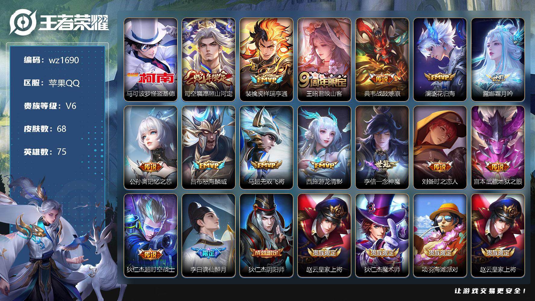 【游戏多多】 【可二次实名】【wz1690】【商品标题】:苹果Q-V6-最强王者段位-75英雄-68皮肤-0典藏-0珍品无双-0无双-1珍品传说-14传说-17史诗 【珍品传说】:马可波罗怪盗基德 【传说皮肤】:司空震愿照山河定,裴擒虎祥瑞亨通,王昭君映山客,典韦战鼓燎原,澜逐花归海,露娜霜月吟,公孙离记忆之芯,吕布怒海麟威,马超无双飞将,西施游龙清影,李信一念神魔,刘备时之恋人,宫本武藏地狱之眼,狄仁杰超时空战士 【限定皮肤】:李白谪仙醉月,狄仁杰阴阳师,赵云皇家上将,狄仁杰魔术师,项羽海滩派对 【史诗皮肤】:赵云皇家上将,狄仁杰魔术师,宫本武藏鬼剑武藏,孙尚香水果甜心,妲己魅力维加斯,花木兰水晶猎龙者,亚瑟心灵战警,白起星夜王子,狄仁杰鹰眼统帅,杨戬天秀启明,钟馗乐园奇幻夜,司马懿暗渊魔法,马可波罗星界特工,李白谪仙醉月,百里守约百相守梦,刘禅鸭鸭历险记,狂铁龙之律动 【其他皮肤】:项羽海滩派对,韩信街头霸王,赵云忍炎影,孙膑天使之翼,典韦黄金武士,亚瑟死亡骑士,后羿阿尔法小队,狄仁杰阴阳师,刘备汉昭烈帝,关羽龙腾万里,王昭君幻想奇妙夜,李白敏锐之力,蒙恬蔚蓝守将,姬小满零食大作战,东皇太一噬灭天穹,老夫子百相守梦,干将莫邪雾都夜雨,吕布逐霄战戟,苍苍林狼骑,太乙真人谧流熔炉,典韦铁骨偃魂,钟馗虚灵犬护,沈梦溪鸭鸭历险记,阿古朵布丁狗之约,露娜命运加冕,姬小满小满鸭,甄姬逆浪荇歌,马可波罗激情绿茵,杨戬埃及法老,干将莫邪第七人偶,公孙离花间舞,裴擒虎街头旋风,元歌午夜歌剧院,司空震启蛰,云缨赤焰之缨,暃碧珀绯影 【营地ID】:1624166705