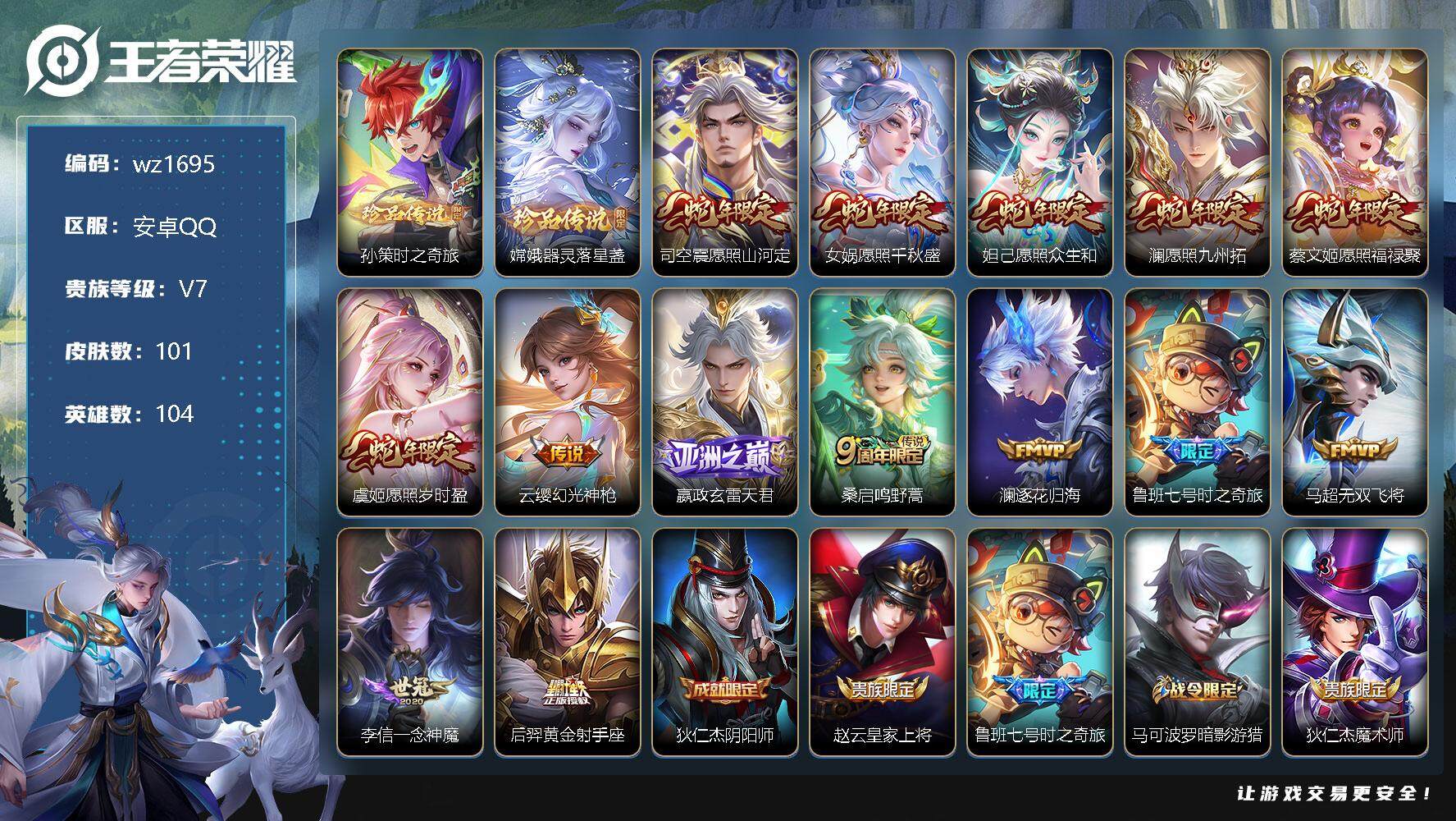 【游戏多多】 【可二次实名】【wz1695】【商品标题】:安卓Q-V7-最强王者段位-104英雄-101皮肤-0典藏-0珍品无双-0无双-2珍品传说-14传说-24史诗 【英雄全皮】:影全皮 【珍品传说】:孙策时之奇旅,嫦娥器灵落星盏 【传说皮肤】:司空震愿照山河定,女娲愿照千秋盛,妲己愿照众生和,澜愿照九州拓,蔡文姬愿照福禄聚,虞姬愿照岁时盈,云缨幻光神枪,嬴政玄雷天君,桑启鸣野蒿,澜逐花归海,鲁班七号时之奇旅,马超无双飞将,李信一念神魔,后羿黄金射手座 【限定皮肤】:狄仁杰阴阳师,赵云皇家上将,鲁班七号时之奇旅,马可波罗暗影游猎,狄仁杰魔术师,项羽海滩派对,刘邦剑破天穹,程咬金群星魔术团,周瑜熔金海岸 【赛季限定】:刘邦剑破天穹 【战令限定】:马可波罗暗影游猎 【史诗皮肤】:项羽苍穹之光,赵云皇家上将,貂蝉圣诞恋歌,狄仁杰魔术师,宫本武藏鬼剑武藏,墨子龙骑士,花木兰水晶猎龙者,小乔缤纷独角兽,兰陵王暗隐猎兽者,诸葛亮黄金分割率,雅典娜冰冠公主,百里守约特工魅影,阿轲节奏热浪,狄仁杰鹰眼统帅,公孙离无限星赏官,孙尚香时之恋人,马可波罗暗影游猎,沈梦溪月团寄思,米莱狄完美假期,亚连破空之剑,百里守约百相守梦,孙膑茶境仙,赵怀真器灵浮梦炉,阿轲化蝶舞 【其他皮肤】:项羽海滩派对,韩信街头霸王,芈月红桃皇后,白起白色死神,扁鹊救世之瞳,安琪拉玩偶对对碰,姜子牙时尚教父,妲己少女阿狸,典韦黄金武士,亚瑟死亡骑士,达摩拳王,花木兰兔女郎,甄姬花好人间,后羿阿尔法小队,狄仁杰阴阳师,狂铁命运角斗场,孙尚香沉稳之力,廉颇无尽征程,杨戬次元傲视,蒙犽胡桃狂想曲,蒙恬蔚蓝守将,海月幻泉雾影,刘邦剑破天穹,程咬金群星魔术团,周瑜熔金海岸,孙悟空神迹守卫,东皇太一噬灭天穹,老夫子百相守梦,米莱狄怪诞之夜,干将莫邪雾都夜雨,吕布逐霄战戟,苍苍林狼骑,太乙真人谧流熔炉,典韦铁骨偃魂,马超访茗客,影魅影绮裳,西施雪境奇遇,姜子牙星梦巡礼,东皇太一金福满堂,达摩爆裂喵拳,少司缘灵卦秘语,明世隐景韶洛都,戈娅玫蓝誓约,甄姬逆浪荇歌,鲁班七号福禄兄弟,高渐离金属狂潮,露娜绯红之刃,貂蝉异域舞娘,兰陵王隐刃,李元芳特种部队,虞姬加勒比小姐,雅典娜战争女神,苍维京掠夺者,杨戬埃及法老,女娲尼罗河女神,米莱狄精准探案法,李信灼热之刃,上官婉儿修竹墨客,猪八戒年年有余,曜归虚梦演,澜孤猎 【营地ID】:1650869203