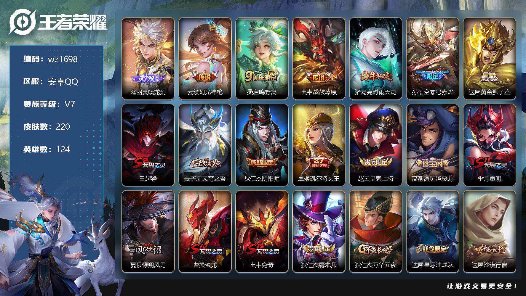 【游戏多多】 【可二次实名】【wz1698】【商品标题】:安卓Q-V7-最强王者段位-124英雄-220皮肤-0典藏-0珍品无双-1无双-0珍品传说-6传说-51史诗 【英雄全皮】:空空儿全皮 【无双皮肤】:曜器灵螭龙剑 【传说皮肤】:云缨幻光神枪,桑启鸣野蒿,典韦战鼓燎原,诸葛亮时雨天司,孙悟空零号赤焰,达摩黄金狮子座 【限定皮肤】:白起狰,姜子牙天穹之誓,狄仁杰阴阳师,虞姬凯尔特女王,赵云皇家上将,高渐离玩趣恶龙,芈月重明,夏侯惇朔风刀,曹操烛龙,典韦穷奇,狄仁杰魔术师,狄仁杰万华元夜,达摩星际陆战队,达摩沙漠行僧,项羽海滩派对,老夫子醍醐杖,程咬金演武夺筹,韩信逐梦之影,韩信飞衡,兰陵王金庭之子,孙悟空至尊宝,孙悟空零号赤焰,牛魔御旌,李元芳云中旅人,钟馗驱傩正仪,雅典娜黎明之约,太乙真人饕餮,鬼谷子原初探秘者,诸葛亮时雨天司,苏烈千军破阵,百里玄策原初追逐者,弈星混沌棋,梦奇顽趣,沈梦溪大漠名商,明世隐疑决卦,裴擒虎李小龙,裴擒虎擒涛扼浪,狂铁御狮,米莱狄御霄,米莱狄胡桃异想国,云中君纤云弄巧,盾山御銮,鲁班大师探海日志,桑启海盐诗旅,艾琳女武神,艾琳流音漫舞,司空震地狱燃心,张良古海寻踪,蒙犽百解令,蒙恬荣光圣徽,鬼谷子天穹祈灯,沈梦溪龙舞盛年,鲁班七号蔬乡物语,刘邦剑破天穹 【年限皮肤】:诸葛亮时雨天司,韩信飞衡 【赛季限定】:白起狰,芈月重明,夏侯惇朔风刀,曹操烛龙,典韦穷奇,狄仁杰万华元夜,达摩沙漠行僧,老夫子醍醐杖,程咬金演武夺筹,兰陵王金庭之子,张良古海寻踪,牛魔御旌,李元芳云中旅人,虞姬凯尔特女王,钟馗驱傩正仪,雅典娜黎明之约,太乙真人饕餮,鬼谷子原初探秘者,苏烈千军破阵,百里玄策原初追逐者,弈星混沌棋,梦奇顽趣,沈梦溪大漠名商,明世隐疑决卦,裴擒虎擒涛扼浪,狂铁御狮,米莱狄御霄,盾山御銮,鲁班大师探海日志,桑启海盐诗旅,鬼谷子天穹祈灯,蒙恬荣光圣徽,刘邦剑破天穹,姜子牙天穹之誓 【战令限定】:达摩星际陆战队,艾琳流音漫舞,米莱狄胡桃异想国,司空震地狱燃心,鲁班七号蔬乡物语 【史诗皮肤】:露娜紫霞仙子,阿轲暗夜猫娘,赵云皇家上将,赵云未来纪元,甄姬冰雪圆舞曲,王昭君偶像歌手,狄仁杰魔术师,廉颇地狱岩魂,宫本武藏鬼剑武藏,孙尚香水果甜心,嬴政摇滚巨星,妲己魅力维加斯,妲己女仆咖啡,墨子金属风暴,刘禅绅士熊喵,李白千年之狐,吕布末日机甲,韩信白龙吟,孙悟空至尊宝,花木兰水晶猎龙者,刘邦德古拉伯爵,韩信逐梦之影,兰陵王暗隐猎兽者,亚瑟心灵战警,安琪拉心灵骇客,百里守约特工魅影,李元芳逐浪之夏,程咬金功夫厨神,阿轲节奏热浪,孙策猫狗日记,狄仁杰鹰眼统帅,韩信飞衡,小乔青蛇,橘右京修罗,百里玄策原初追逐者,裴擒虎李小龙,云中君纤云弄巧,米莱狄胡桃异想国,司马懿暗渊魔法,雅典娜黎明之约,梦奇顽趣,刘禅电玩爆裂旋风,司空震地狱燃心,蒙犽百解令,蒙恬荣光圣徽,鲁班七号蔬乡物语,牛魔星界战将,阿轲化蝶舞,刘禅鸭鸭历险记,狂铁龙之律动,黄忠百相守梦 【其他皮肤】:项羽海滩派对,韩信教廷特使,韩信街头霸王,露娜哥特玫瑰,达摩大发明家,赵云白执事,赵云忍炎影,芈月红桃皇后,艾琳女武神,白起白色死神,武则天东方不败,扁鹊化身博士,安琪拉玩偶对对碰,孙膑天使之翼,姜子牙时尚教父,妲己少女阿狸,典韦黄金武士,亚瑟死亡骑士,达摩拳王,花木兰兔女郎,甄姬花好人间,刘备万事如意,宫本武藏万象初新,狄仁杰阴阳师,刘备纽约教父,刘备汉昭烈帝,关羽龙腾万里,虞姬凯尔特女王,墨子进击墨子号,白起狰,钟无艳海滩丽影,太乙真人饕餮,宫本武藏霸王丸,曹操烛龙,王昭君幻想奇妙夜,芈月重明,狂铁命运角斗场,老夫子功夫老勺,孙尚香沉稳之力,典韦穷奇,诸葛亮掌控之力,李白敏锐之力,鬼谷子幻乐之宴,狂铁御狮,项羽科学大爆炸,米莱狄御霄,明世隐虹云星官,牛魔御旌,吕布野性能量,盾山御銮,高渐离玩趣恶龙,沈梦溪鲨炮海盗猫,夏侯惇朔风刀,弈星混沌棋,哪吒次元突破,鲁班七号黑桃队长,明世隐疑决卦,盾山圆桌骑士,老夫子醍醐杖,狂铁特工战影,鬼谷子原初探秘者,狄仁杰万华元夜,刘禅秘密基地,杨戬次元傲视,达摩星际陆战队,程咬金演武夺筹,张良缤纷绘卷,钟馗驱傩正仪,鲁班大师乓乓大师,苏烈千军破阵,达摩沙漠行僧,程咬金无双福将,兰陵王金庭之子,沈梦溪大漠名商,李元芳云中旅人,桑启海盐诗旅,猪八戒潮玩探月行,白起乐园追猎者,裴擒虎擒涛扼浪,鲁班大师探海日志,李元芳妄想特派,艾琳流音漫舞,张良古海寻踪,曹操决胜大满贯,鬼谷子天穹祈灯,廉颇功夫炙烤,沈梦溪龙舞盛年,刘邦剑破天穹,大司命暗都幽影,姜子牙天穹之誓,东皇太一噬灭天穹,苍苍林狼骑,太乙真人谧流熔炉,典韦铁骨偃魂,西施雪境奇遇,姜子牙星梦巡礼,少司缘灵卦秘语,明世隐景韶洛都,戈娅玫蓝誓约,刘备浪漫序章,钟馗虚灵犬护,沈梦溪鸭鸭历险记,苏烈春野闲踪,张良灵